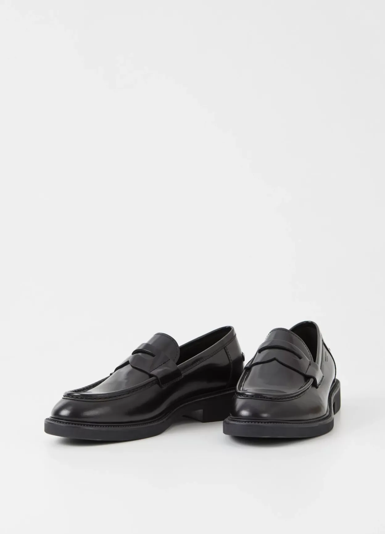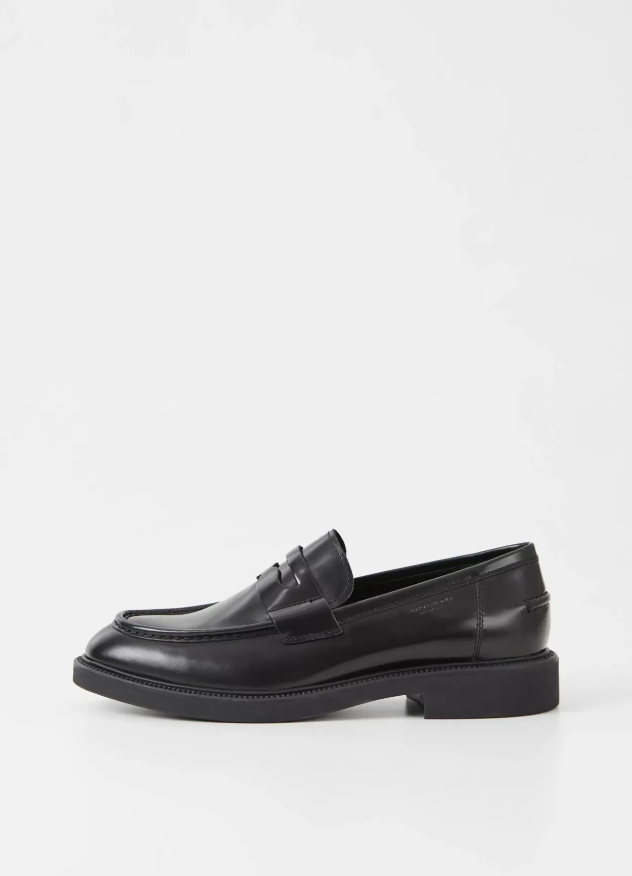 Alex M er moderne pennyloafers med et tidløst design. Modellen er i sort poleret læder, med et pennybånd på oversiden, moc-toe detaljer og en robust sål på 33 mm.