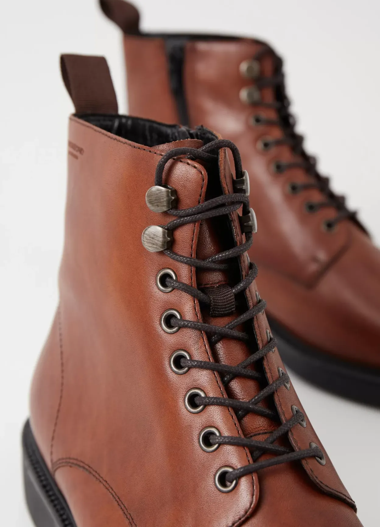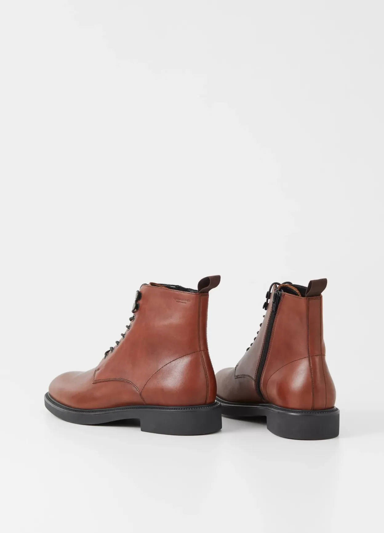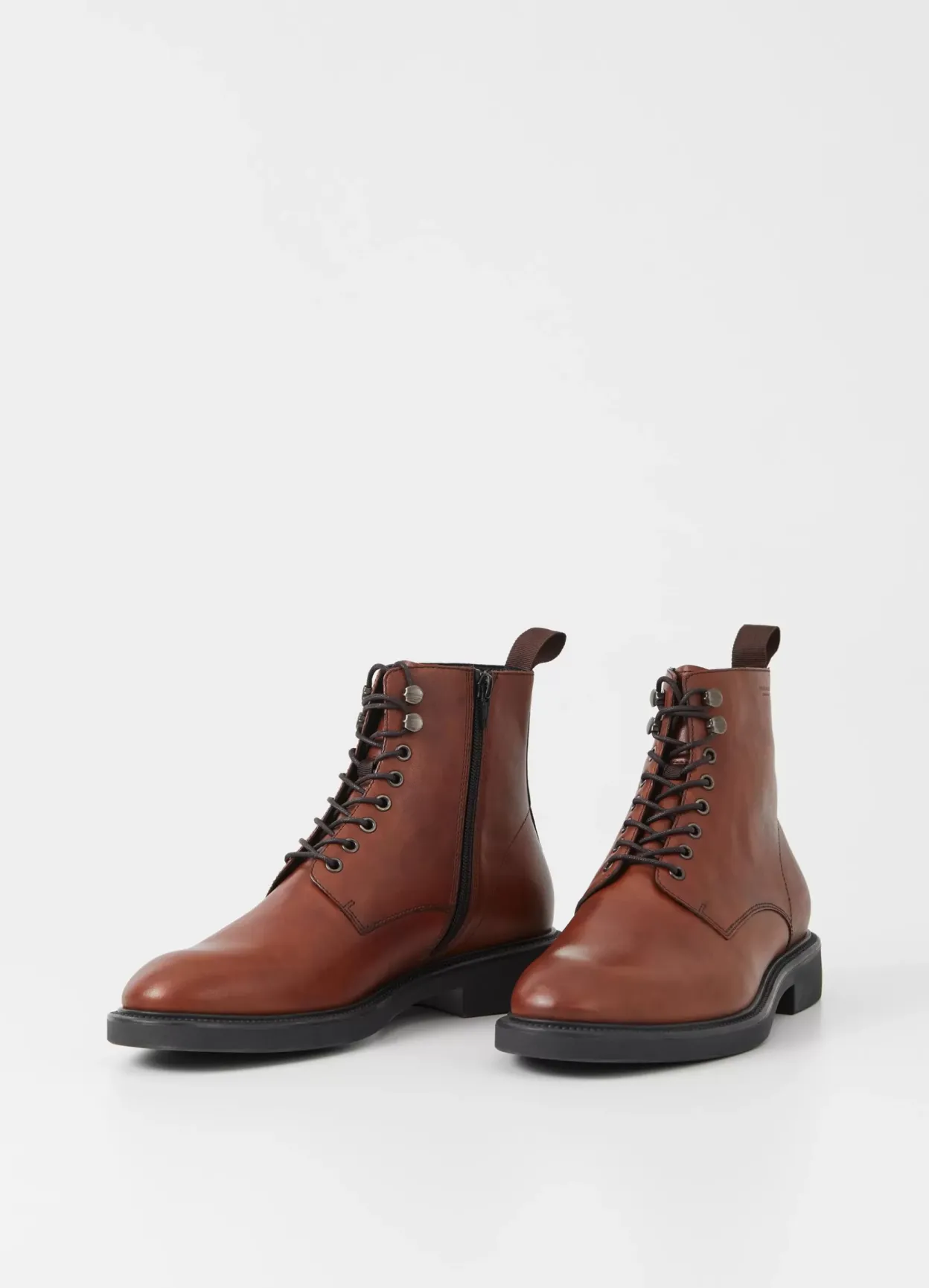 Alex W er en opdateret version af de klassiske snørestøvler. Oversiden er i cognacfarvet læder med snøre fremme, lynlås og trækstroppe. De solide gummisåler er på 33 mm.