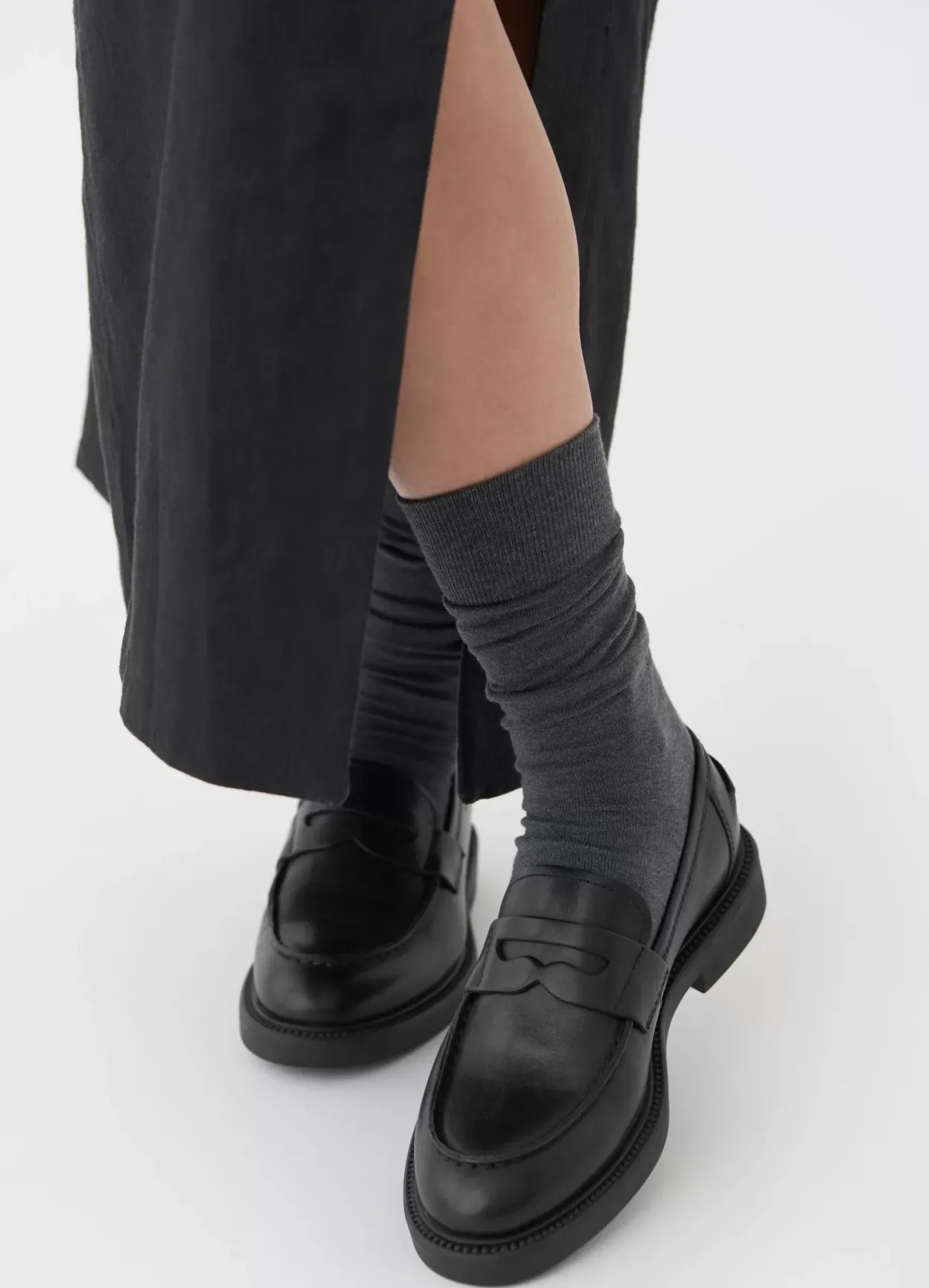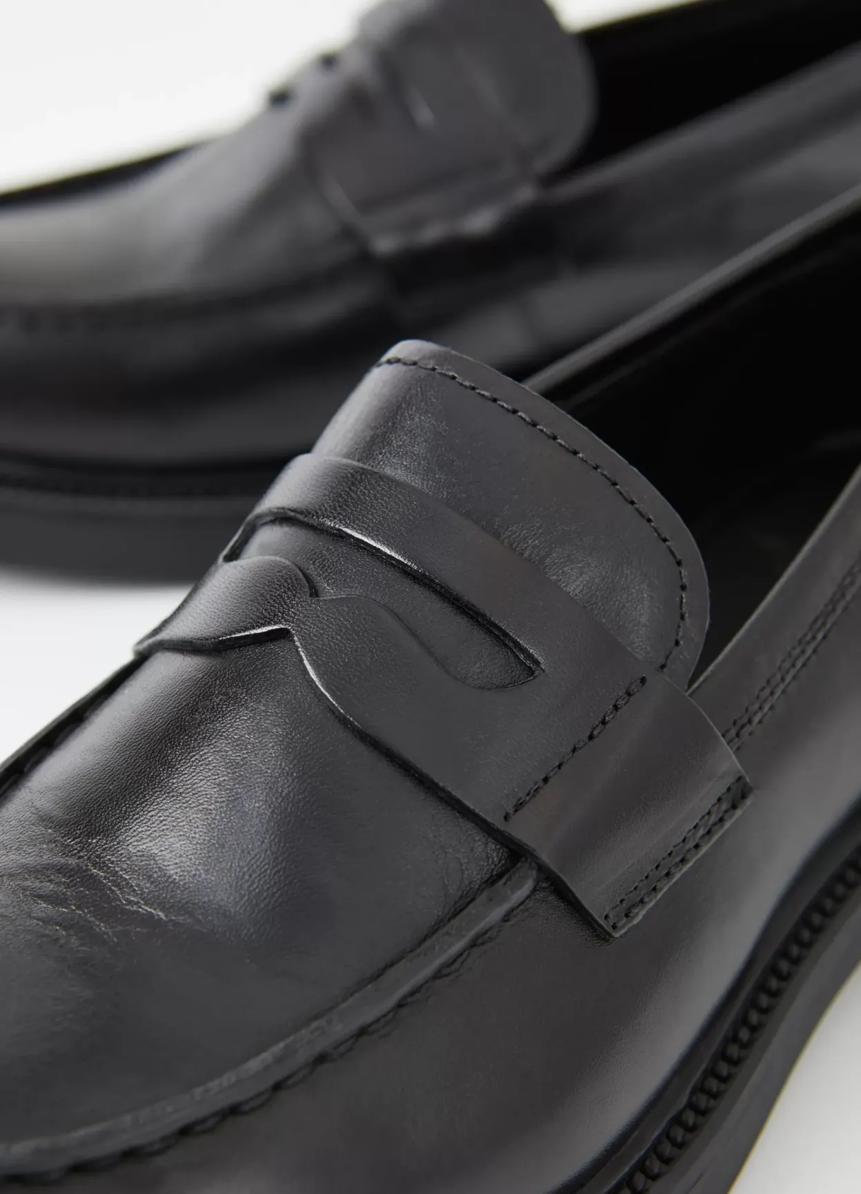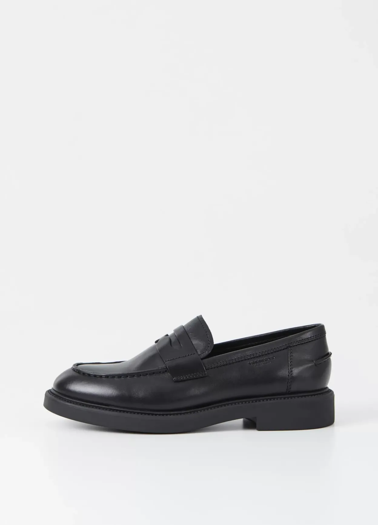 Alex W er yderst anvendelige pennyloafers, som kommer i smooth sort læder, moc-toe-detaljer, mandelformet tå og en traditionel penny-detalje på overdelen. De moderne model står på en robust gummisål på 33 mm. Dertil kommer en synlig syning langs med ydersålen.