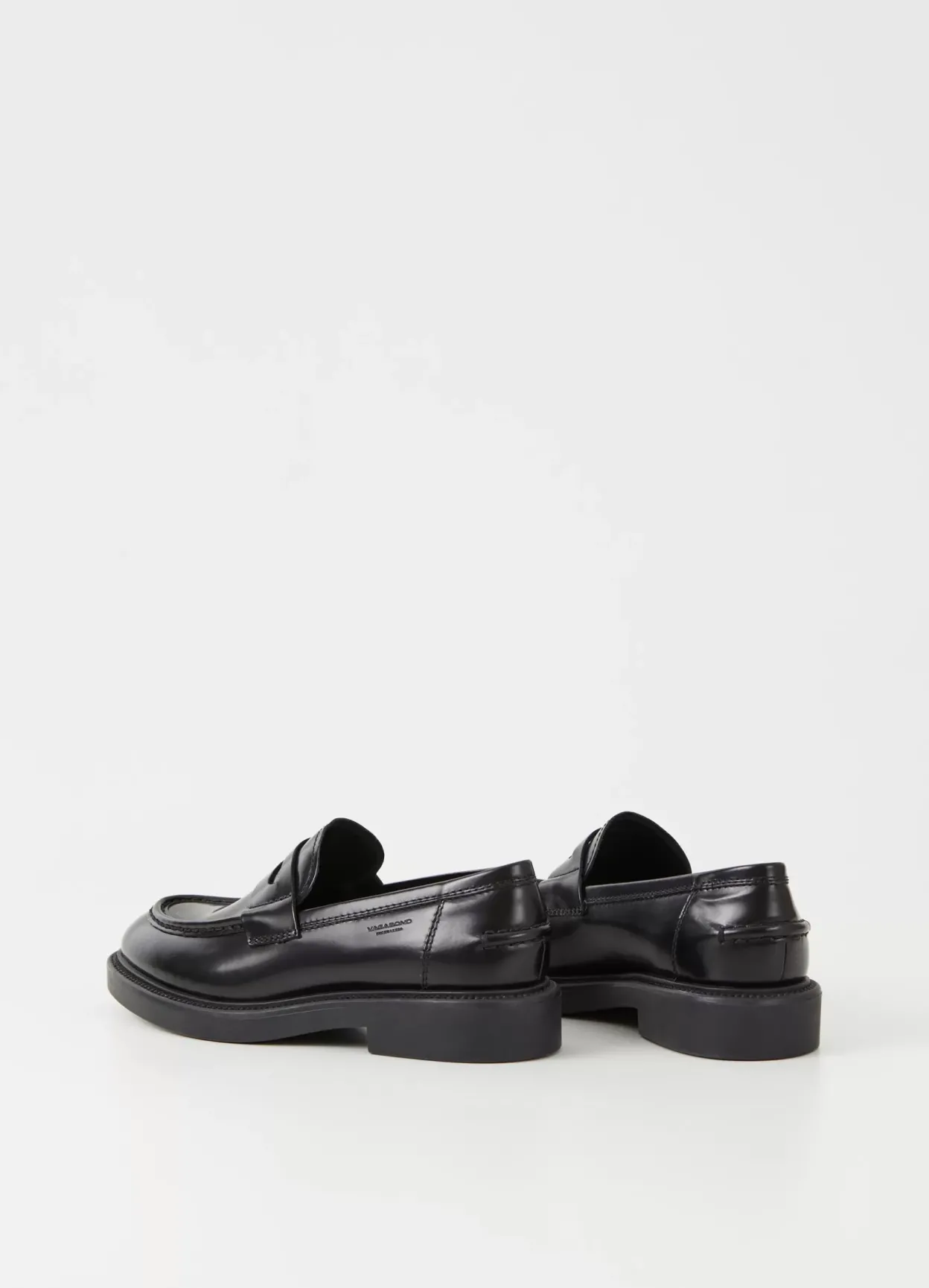 Alex er en tidløs penny-loafer i sort poleret skind med moc-toe-detaljer, mandelformet tå og en klassisk penny-rem på oversiden. Skoen står på en robust gummisål og en 33 mm lav hæl. Derudover kommer modellen med synlige syninger langs ydersålen.