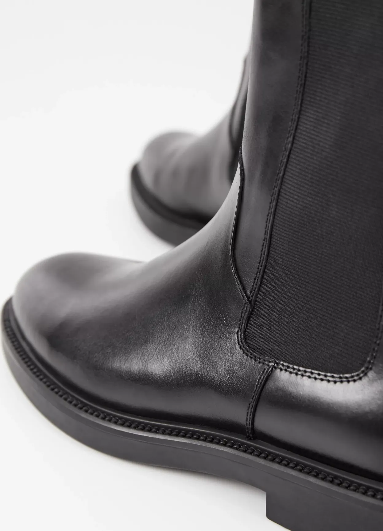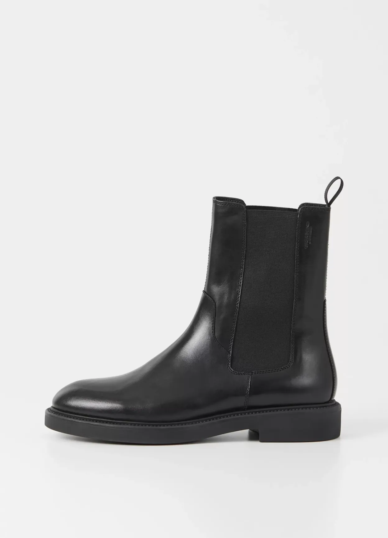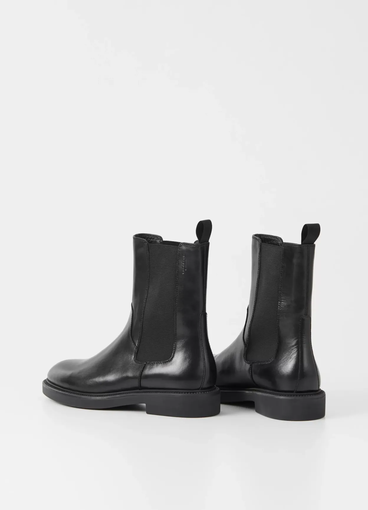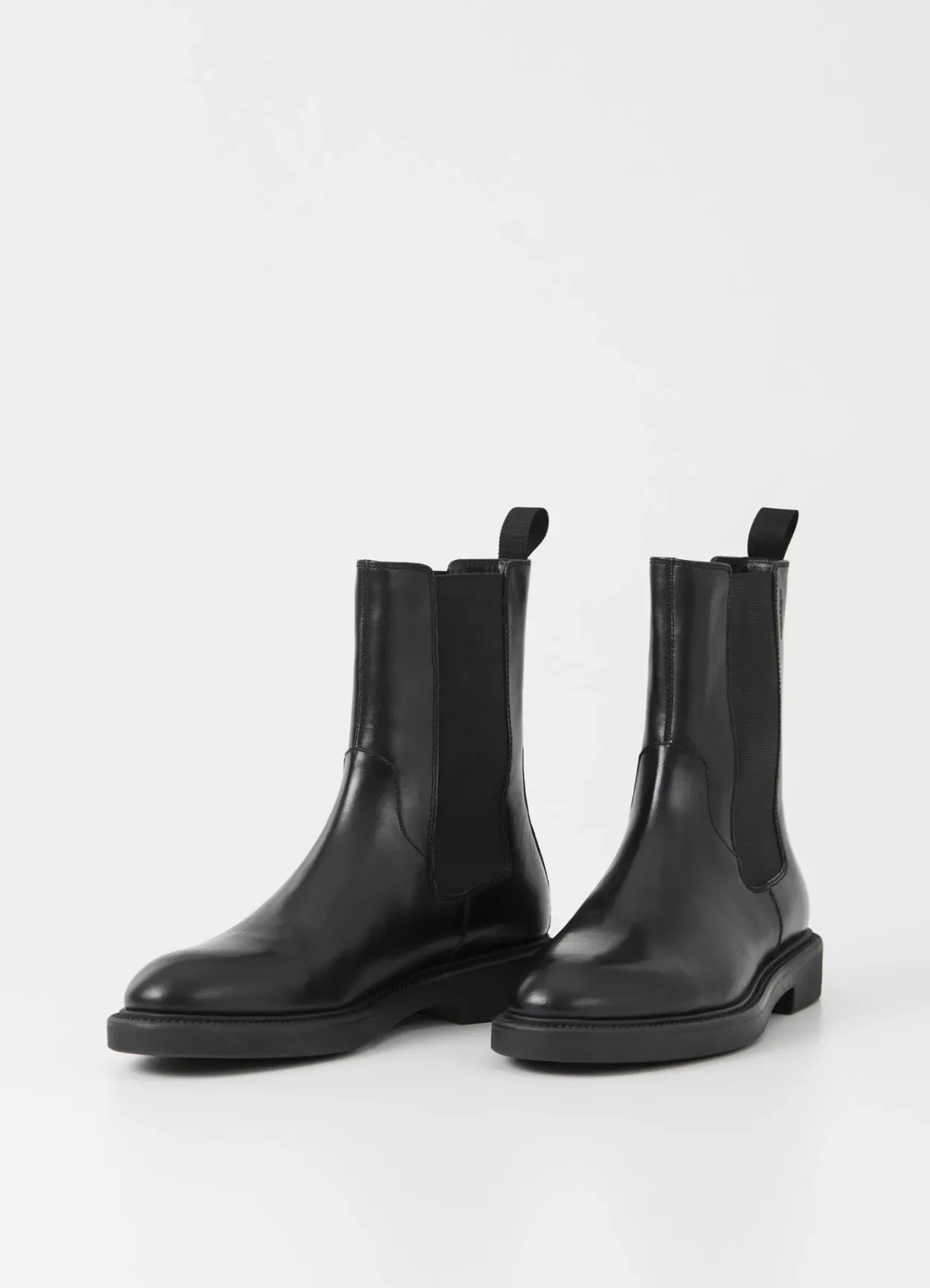 Alex W er vores opdaterede version af de klassiske Chelsea boots. Modellen er i sort skind med mandelformet tå, træk-flap og elastikpaneler. Støvlen er med robust sål og 33 mm høj hæl.