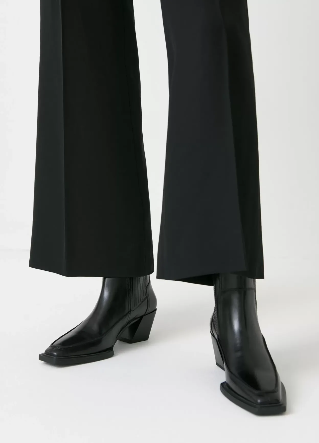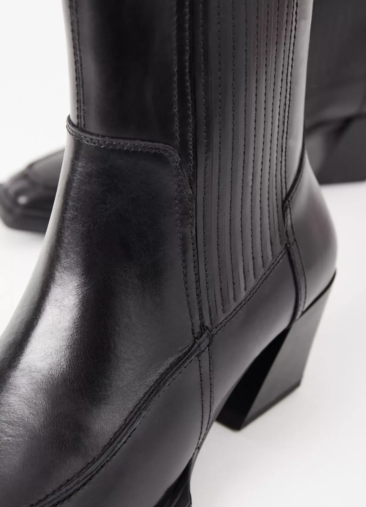 Alina er sæsonens westerninspirerede ankelstøvler med en moderne silhuet. Støvlerne er i sort skind med en spids tåform, plisserede elastikpaneler og detaljerede sømme. Den asymmetriske blokhæl er 62 mm.