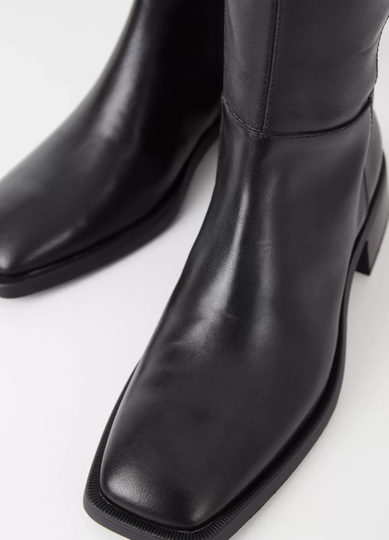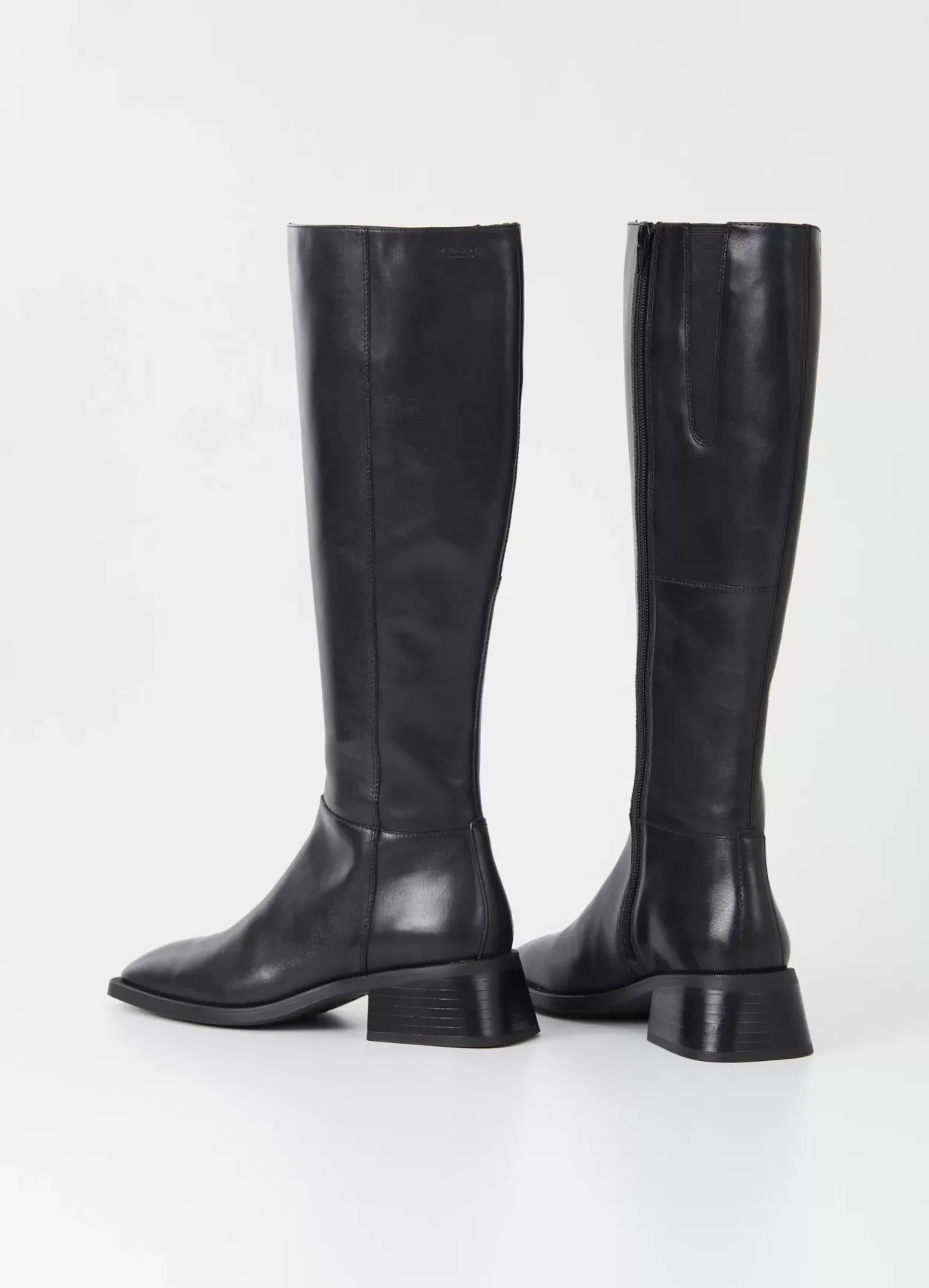 Blanca er tidløse støvler med en moderne silhuet. Modellen er i sort læder med firkantet tåform, knæhøjt skaft og lynlås på indersiden. Støvlerne har hæle med svaj på 47 mm.