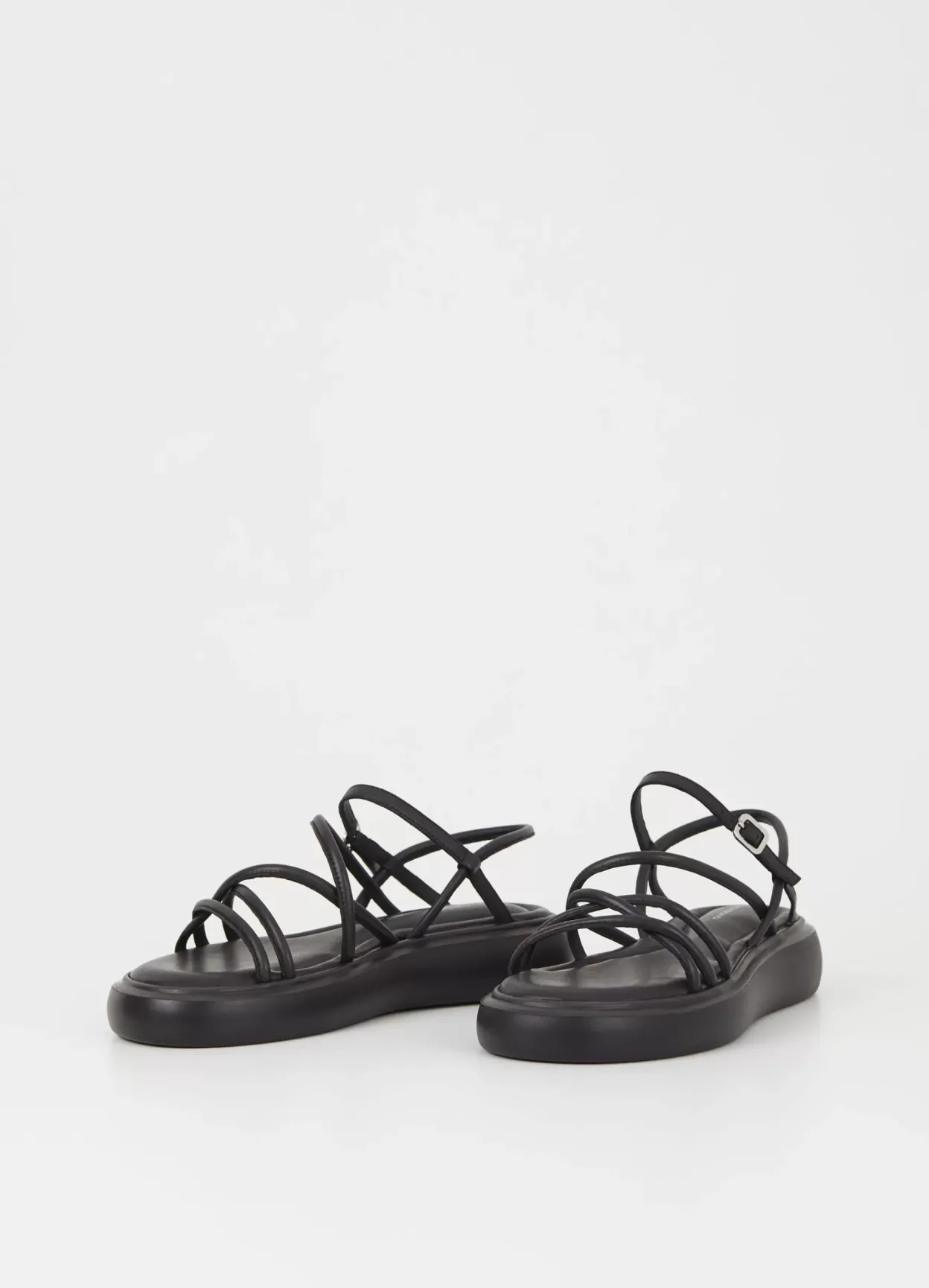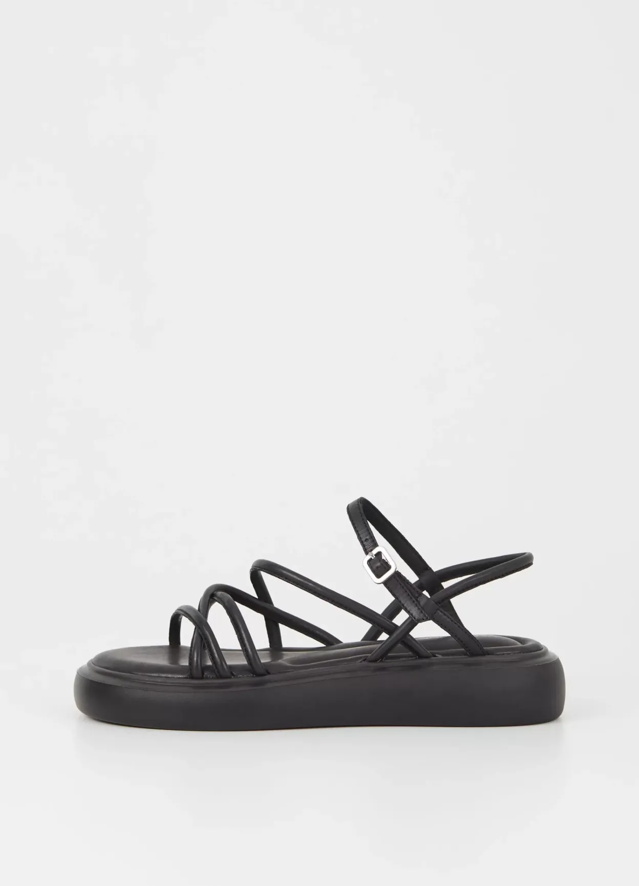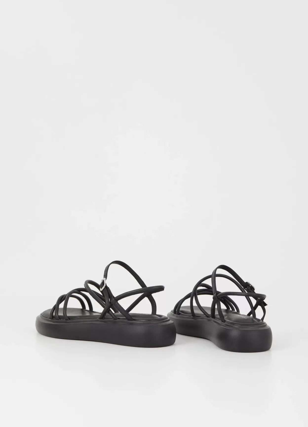 Blenda er minimalistiske remsandaler med en moderne silhuet. Oversiden er i sort læder med smalle, runde remme, som går over foden samt justerbare ankelremme. Indersålen er polstret og ydersålen er 40 mm.