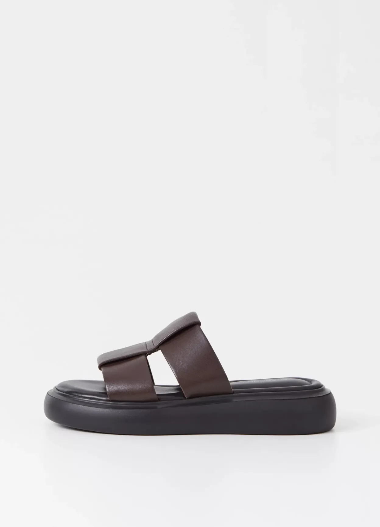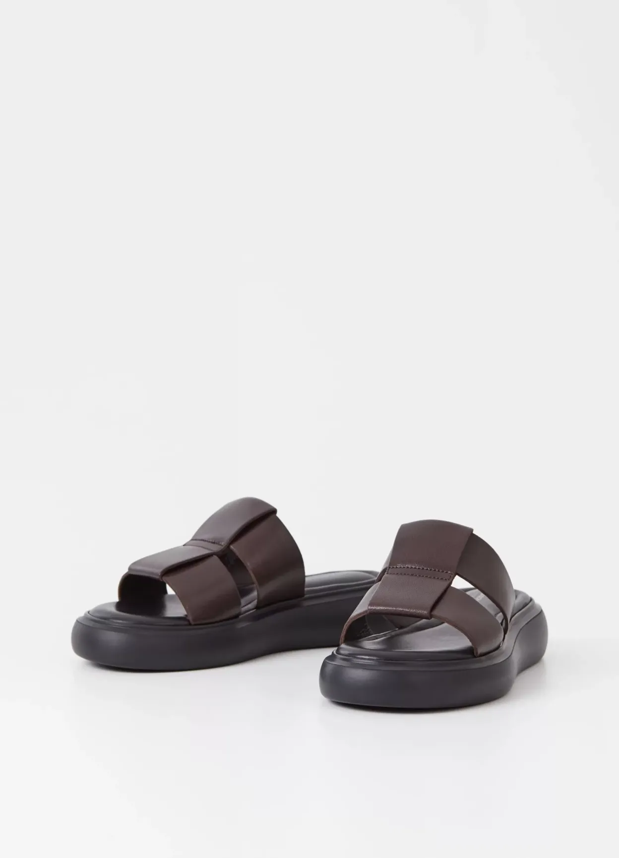 Blenda er elegante slip-in sandaler med en rund silhuet. Modellen er lavet i mørkebrunt læder med brede sammenflettede remme over foden samt en solid ydersål på 40 mm.