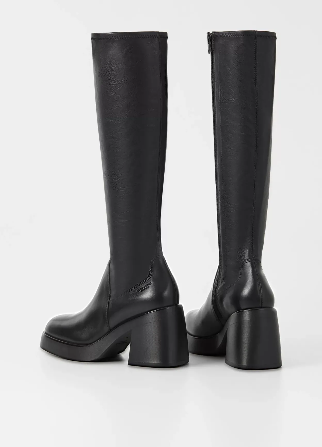 Plateau-støvlen Brooke har en moderne, chunky silhuet. Modellen er i sort læder/syntetisk materiale med et elastisk skaft, lynlås og firkantet tå. Den robuste ydersål har 87 mm kraftige blokhæle.