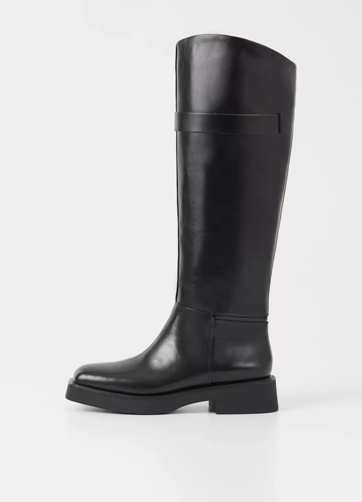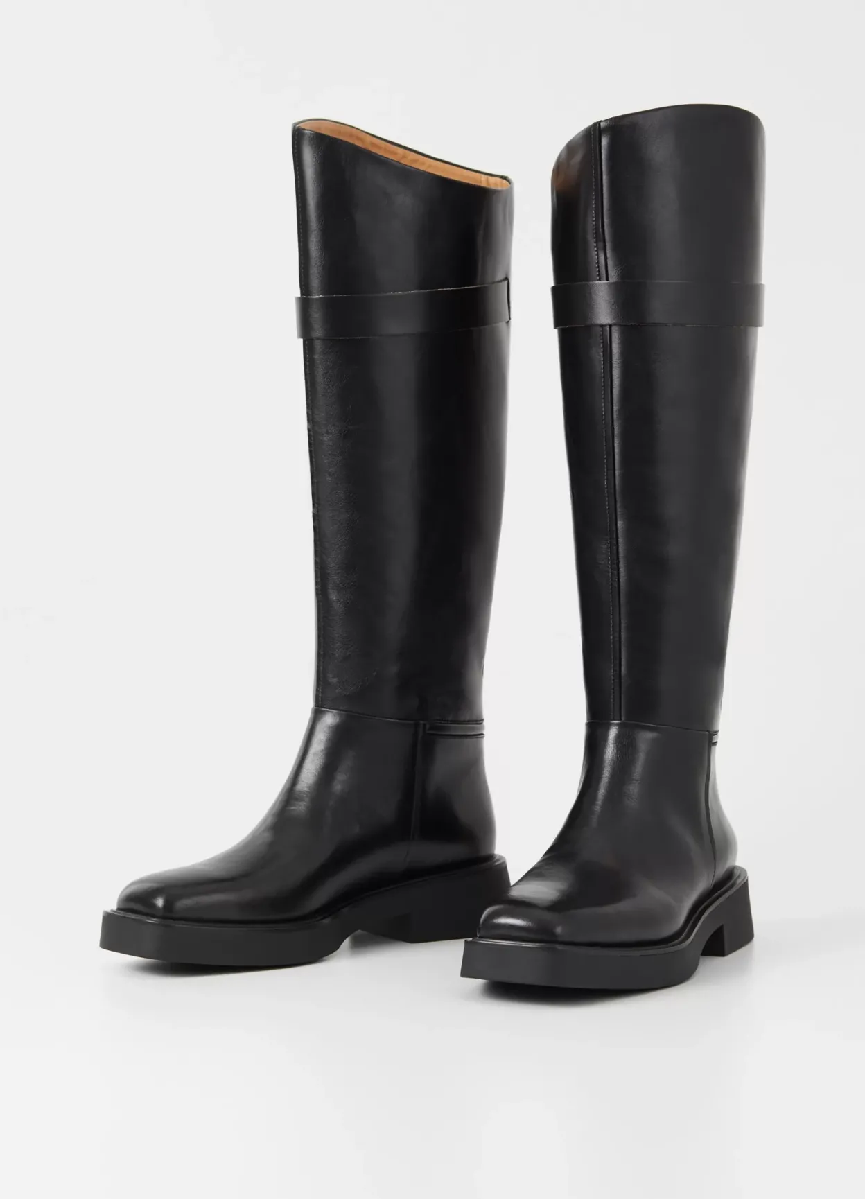 Carmen er en ny version af den klassiske ridestøvle. Modellen er lavet i sort læder, og kommer med firkantet tå og et knæhøjt skafte med en dekorativ læderstrop øverst. Den robuste ydersål har en 40 mm lav hæl. Detaljen: blødt for i læder.