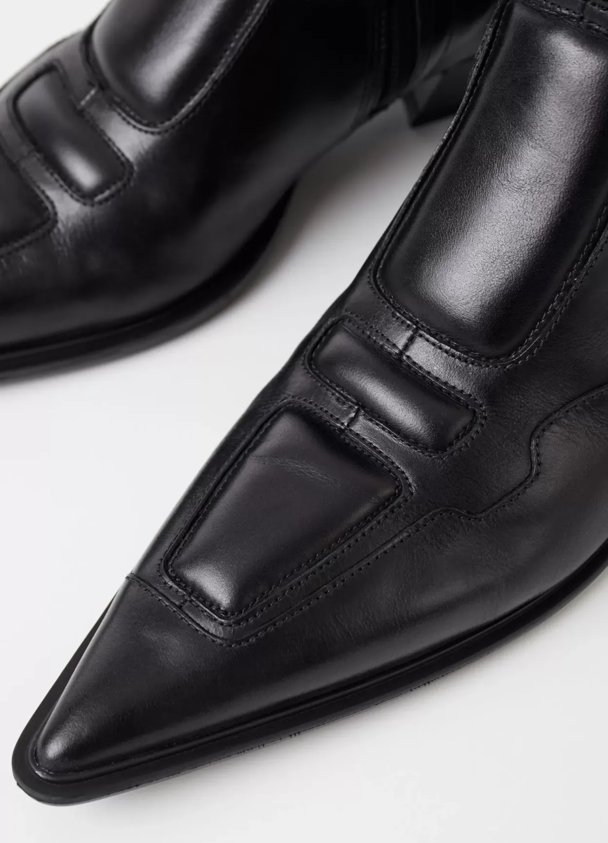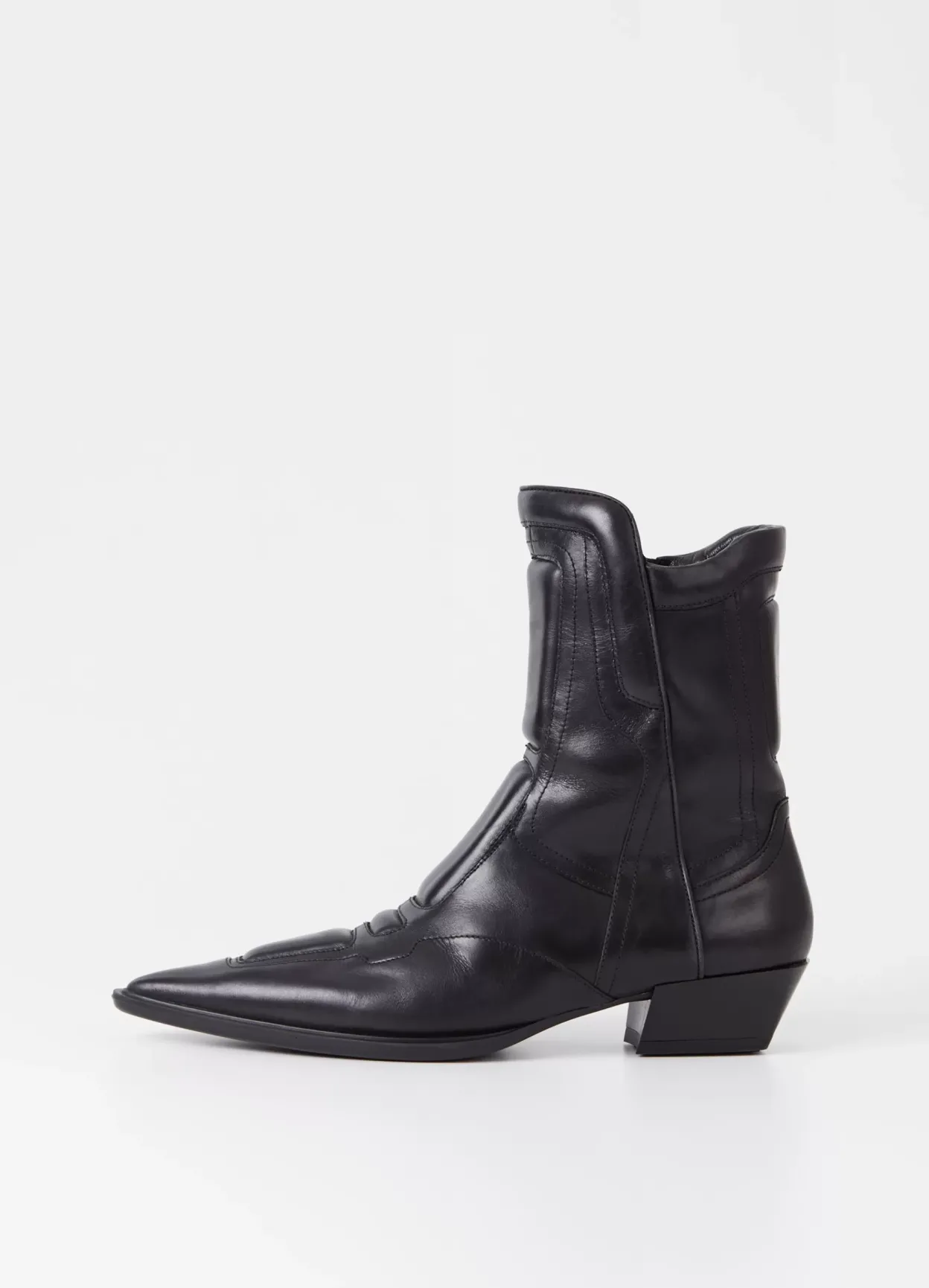 Cassie er biker-inspirerede boots med en spids silhuet. Modellen er lavet i sort læder med dekorative sømme og polstrede detaljer – som skaber et unikt look. Detaljen: mellemhøjt skafte med lynlås langs med indersiden og en spids tåform. Hælen erl 40 mm.