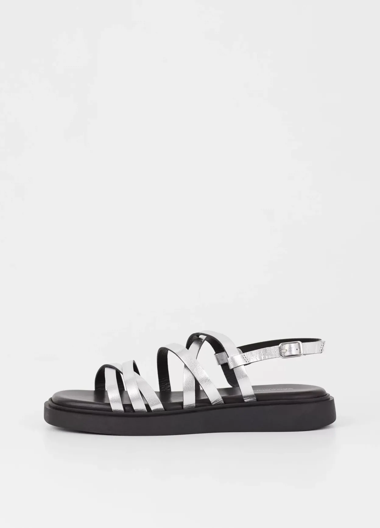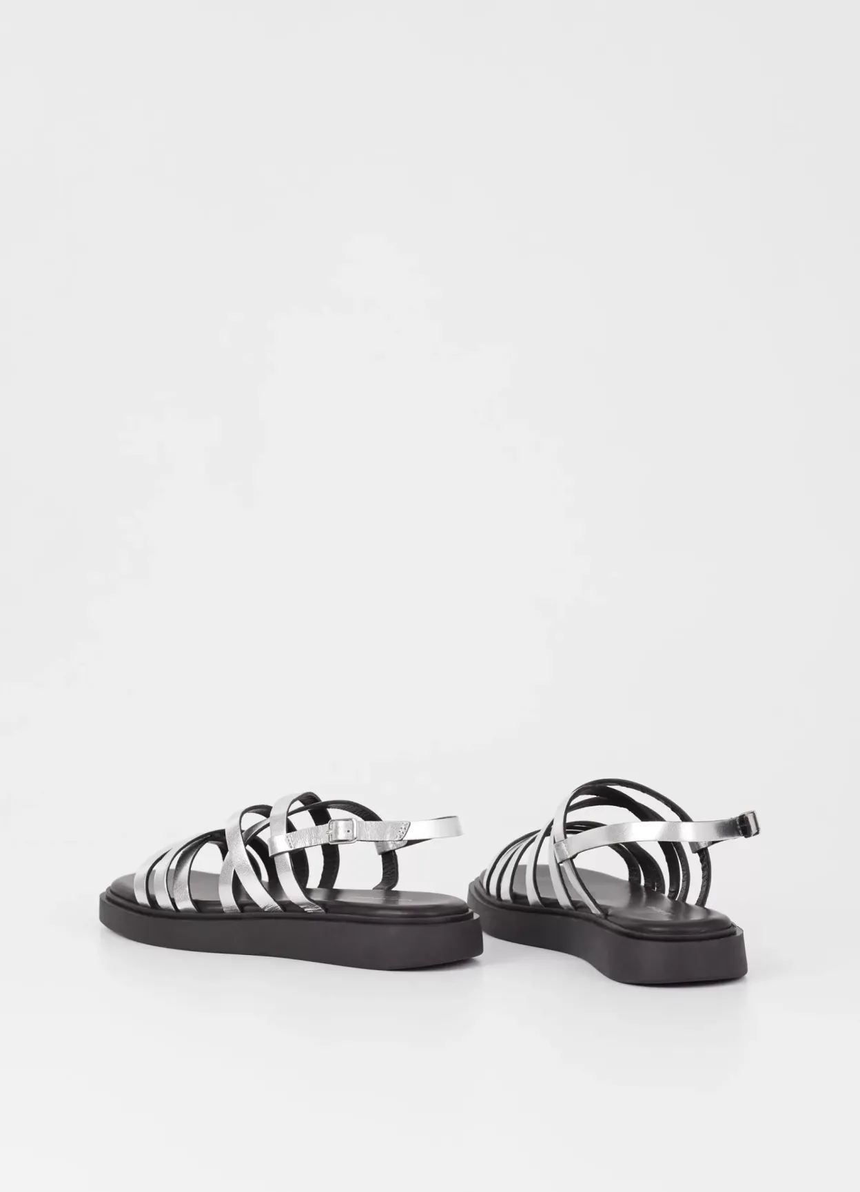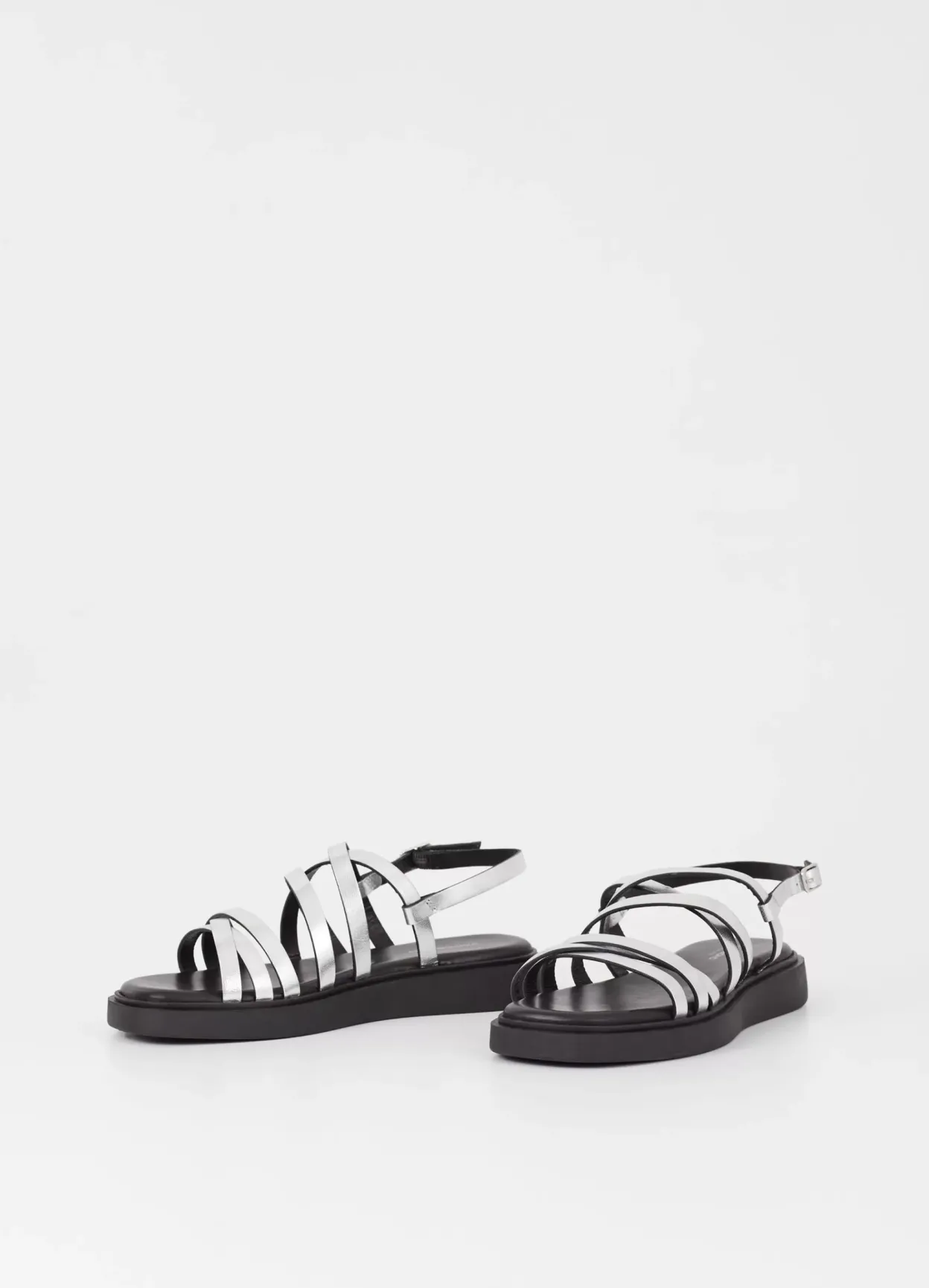 Connie er stilfulde sandaler i et minimalistisk design. Modellen er lavet i sølvfarvet læder med smalle, krydsende remme over foden samt hælrem med sølvfarvet spænde. Sålen er 20 mm. Detaljen: polstret indersål i læder og firkantet tåform.