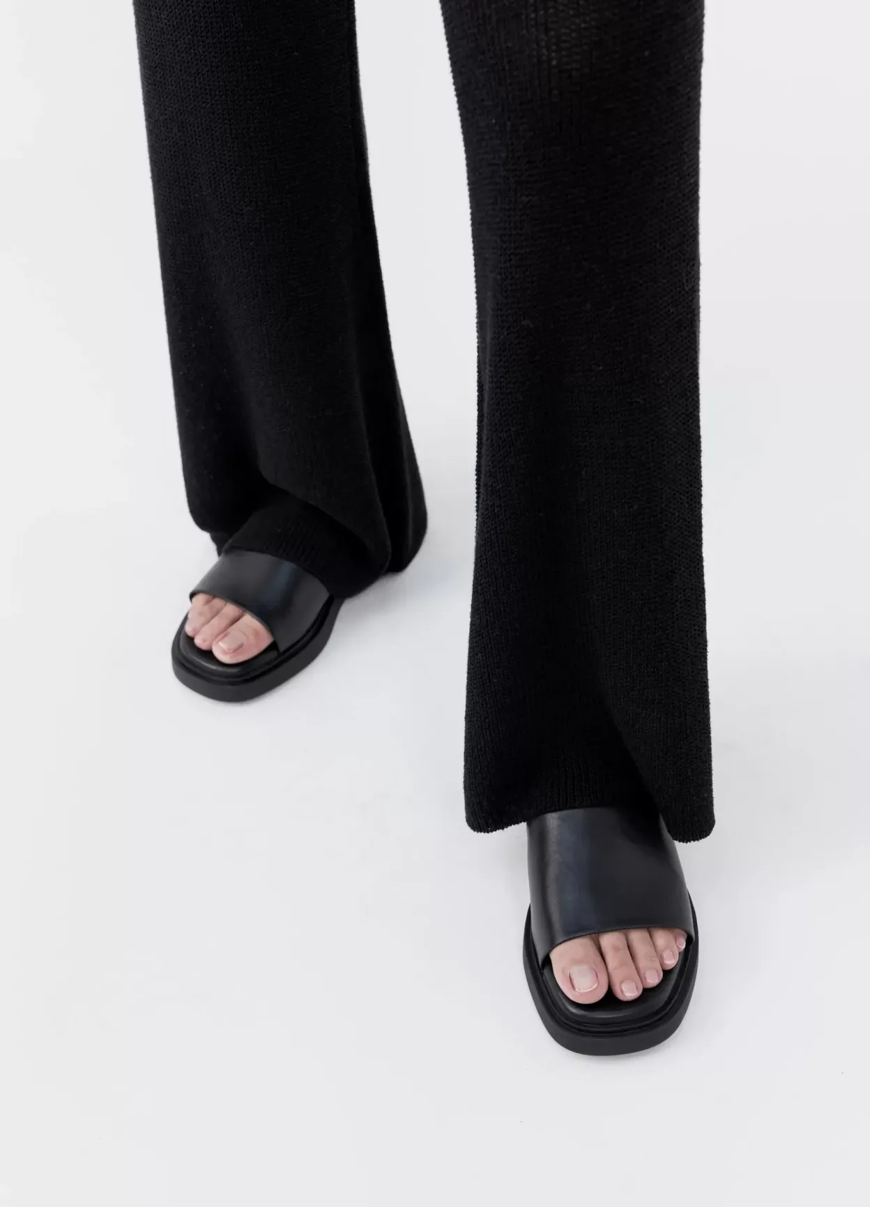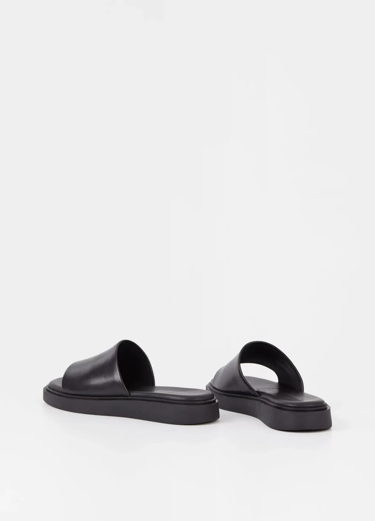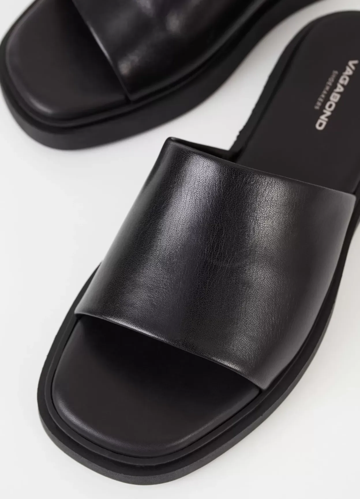 Connie er minimalistiske slip-in sandaler i et tidløst design. Modellen er lavet i sort læder med en bred rem over foden samt firkantet tåform. Sålen måler 20 mm. Detaljen: let polstret indersål i læder.