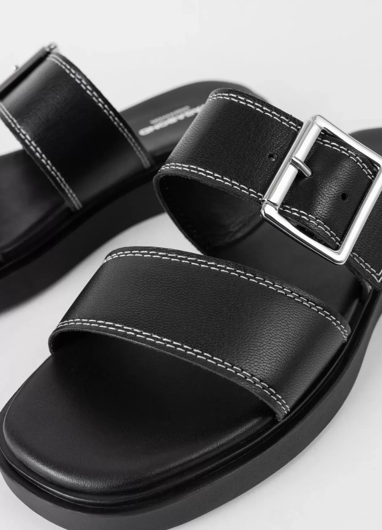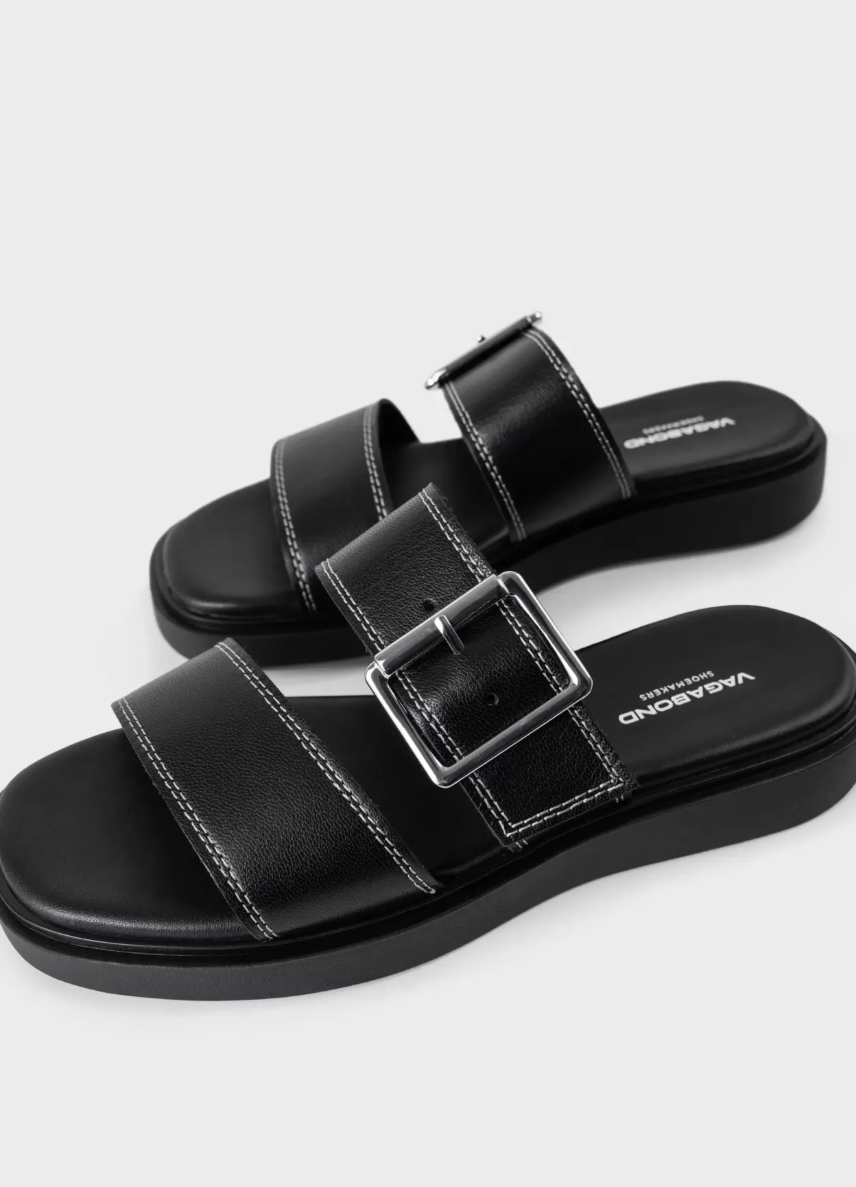 Connie er slip-in sandaler med en tidløst look. Modellen er lavet i sort læder med kontrastfarvede søm, dobbelte remme over foden samt sølvfarvet spænde. Sålen er 20 mm. Detaljen: let polstret indersål i læder.