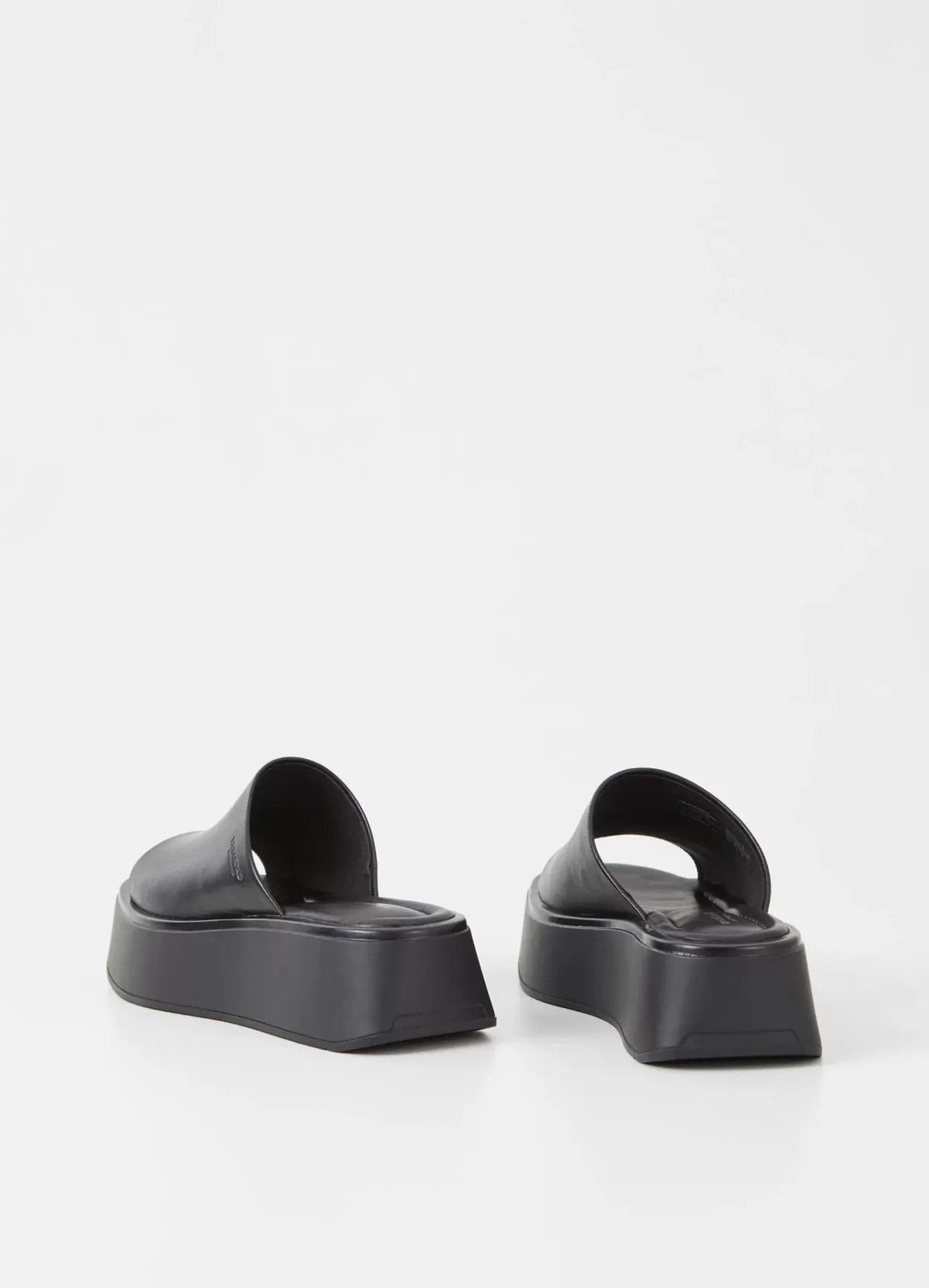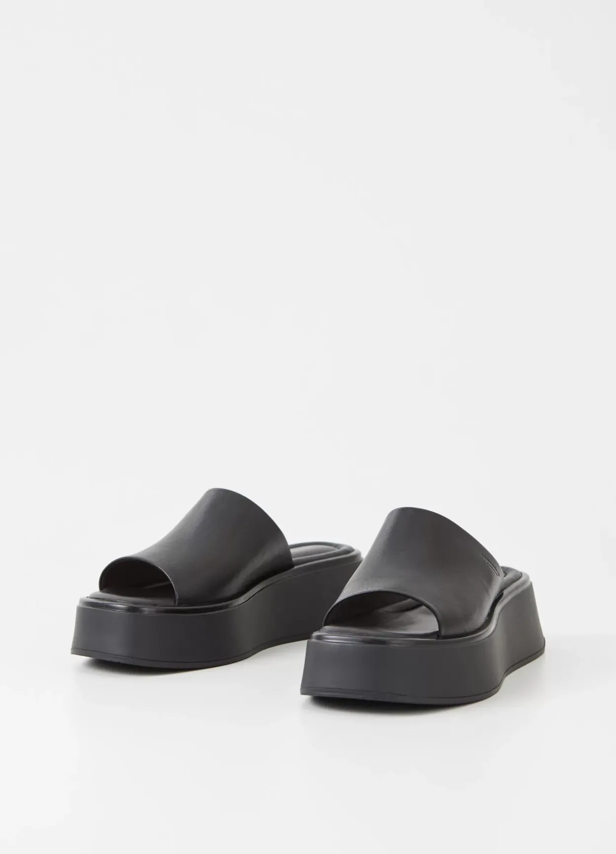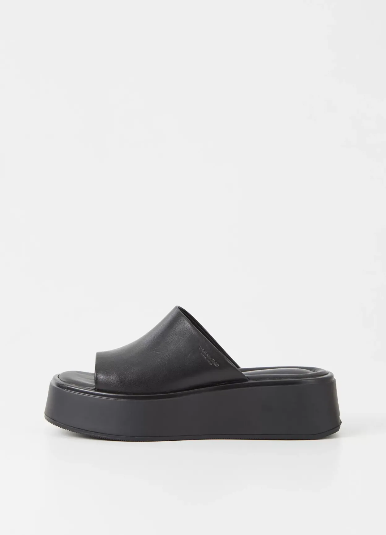 Courtney er en minimalistisk slip-in sandal i et halvfemser-inspireret design. Modellen er lavet i blødt sort læder med en bred rem på oversiden, polstret indersål og firkantet tå. Den solide plateausål er 50 mm.