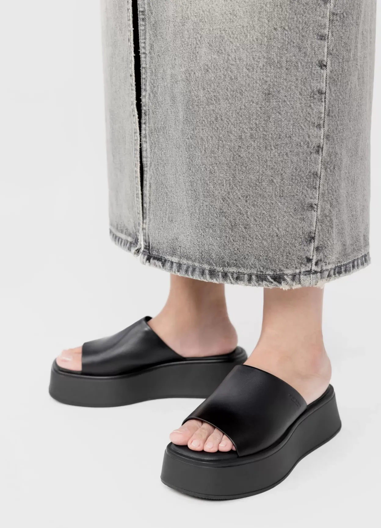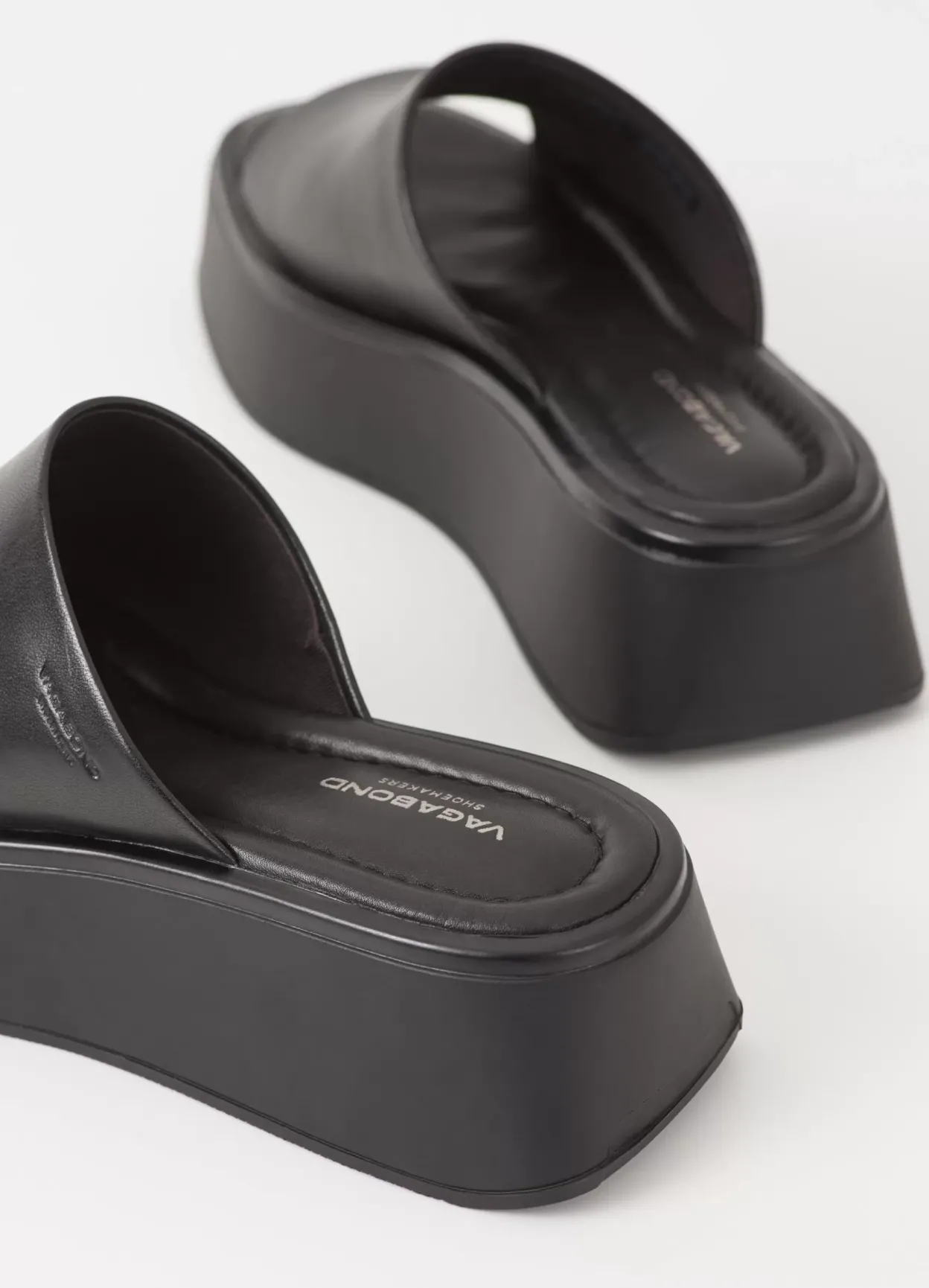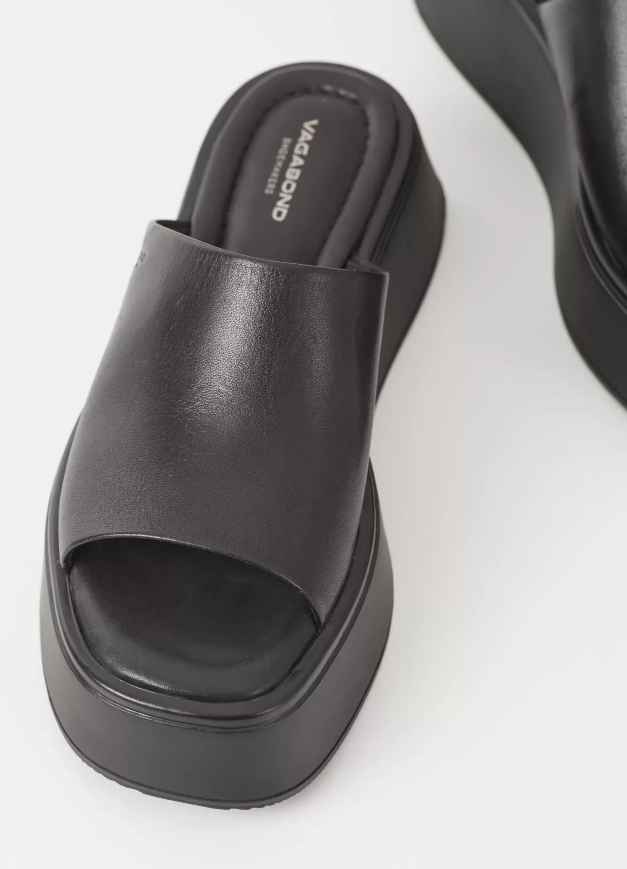 Courtney er en minimalistisk slip-in sandal i et halvfemser-inspireret design. Modellen er lavet i blødt sort læder med en bred rem på oversiden, polstret indersål og firkantet tå. Den solide plateausål er 50 mm.