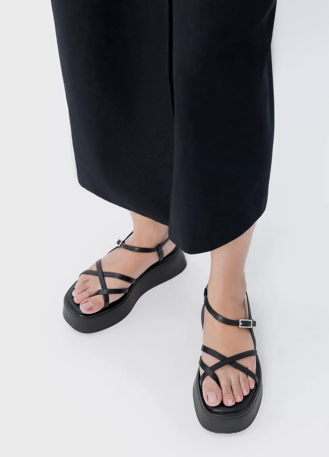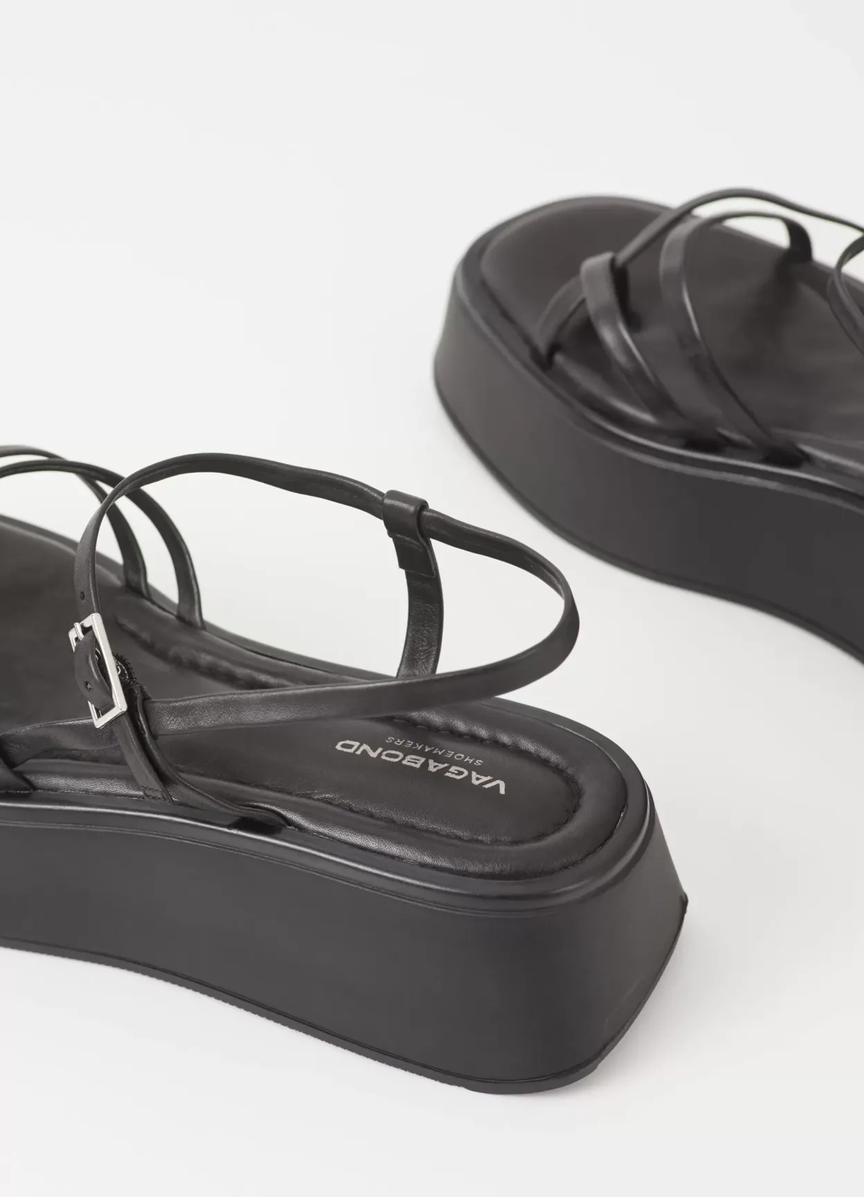 Courtney er moderne remsandaler med en kraftig plateausilhuet. Modellen er i sort læder med tynde remme i læder, polstret indersål og lukning med spænde. Plateausålen går let udaf og er på 50 mm.