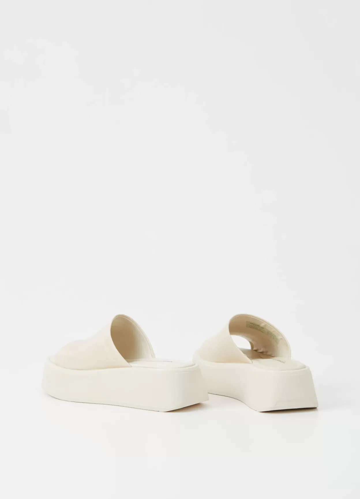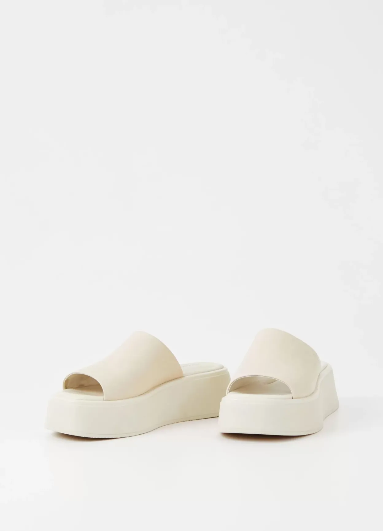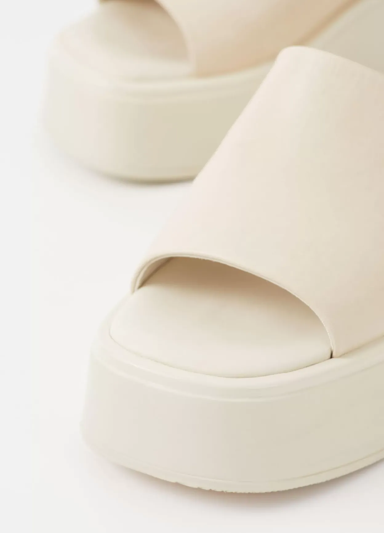 Courtney er en minimalistisk slip-in sandal med et 90’er inspireret design. Modellen er i blødt offwhite læder med en bred rem på oversiden, polstret indersål og firkantet tå. Den solide plateausål er på 50 mm.