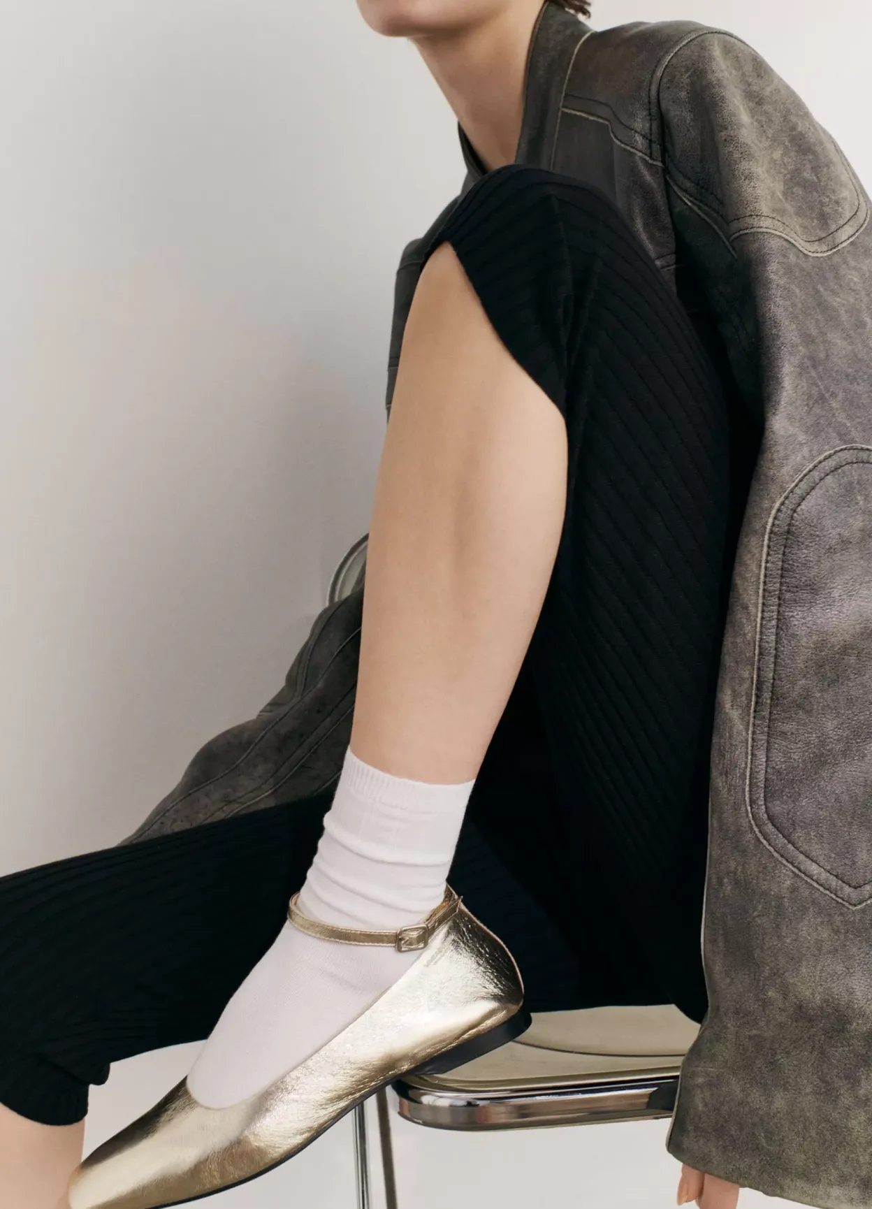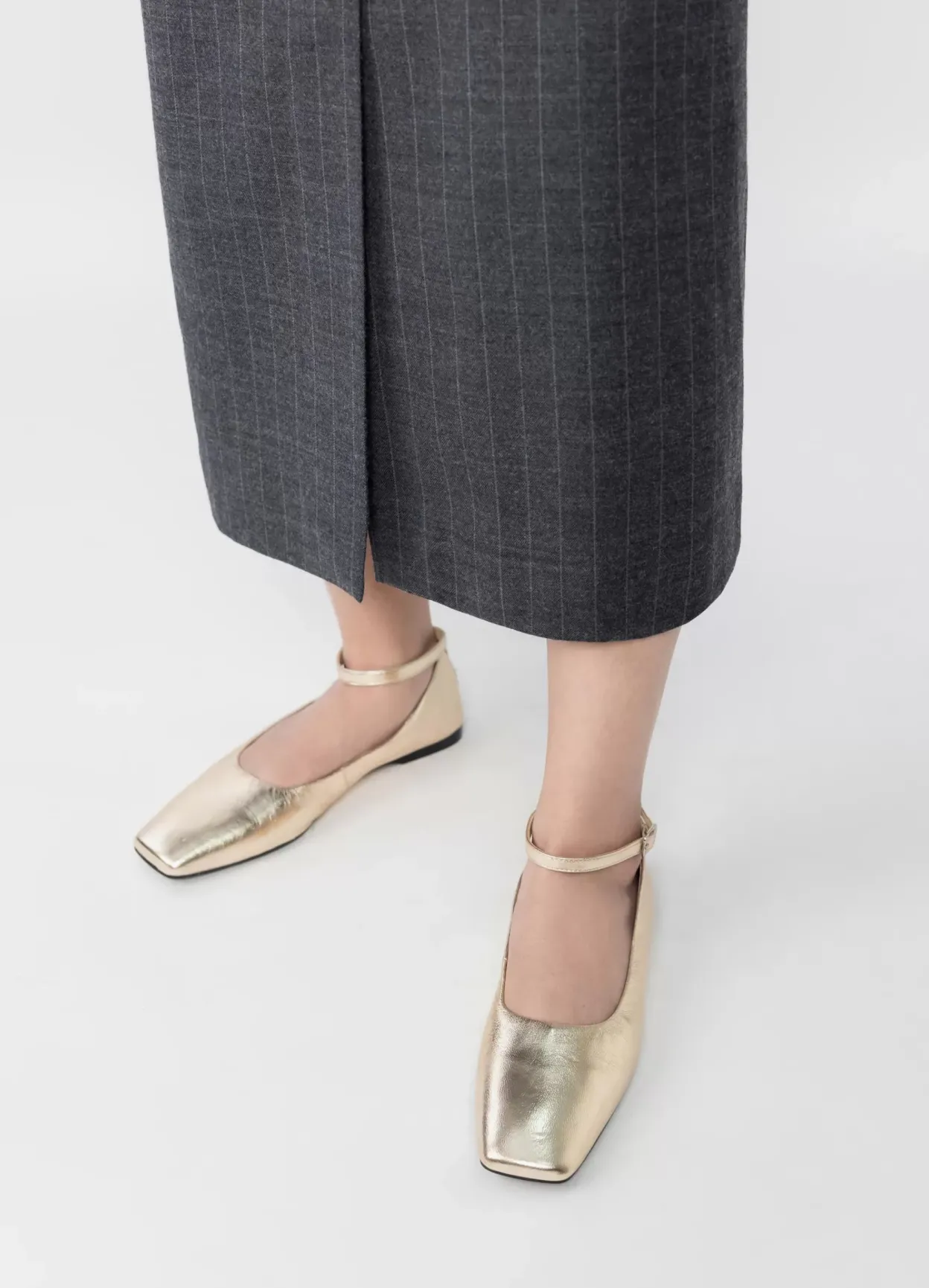 Delia er ballerinasko med et elegant udtryk. Modellen er lavet i guldfarvet læder med firkantet tå og justerbar ankelrem med sølvfarvet spænde. Den lave hæl er 12 mm. Detaljen: indersål i læder.