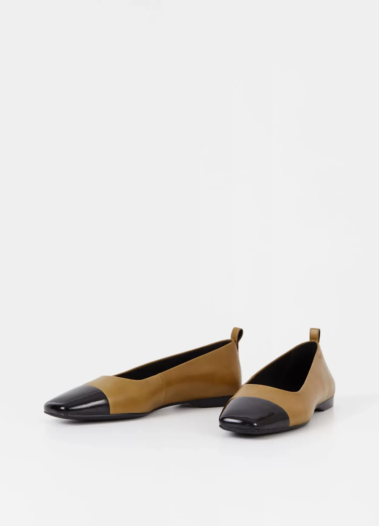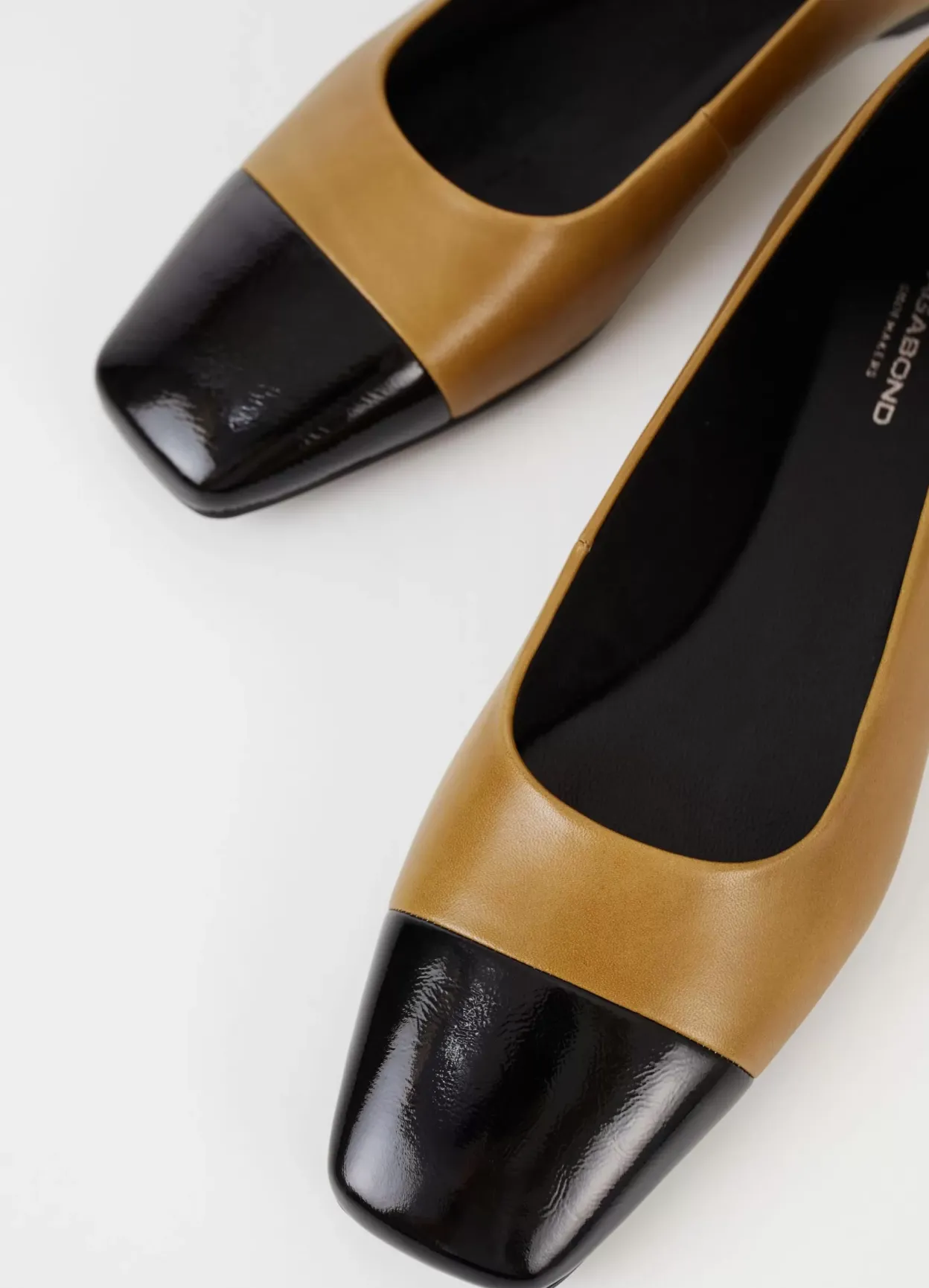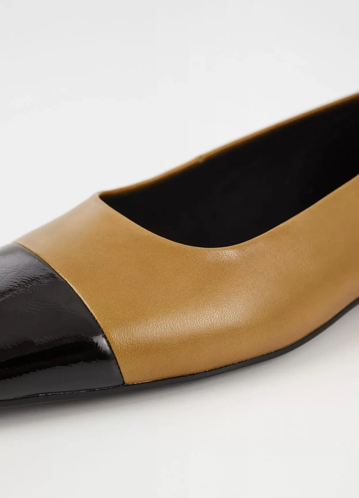 Delia er tidløse ballerinasko med et elegant design. Modellen er lavet i gulgrønt læder med tåhætte i sort laklæder. Den lave hælen måles til 12 mm. Detaljen: firkantet tå, hælstrop og tynd sål.