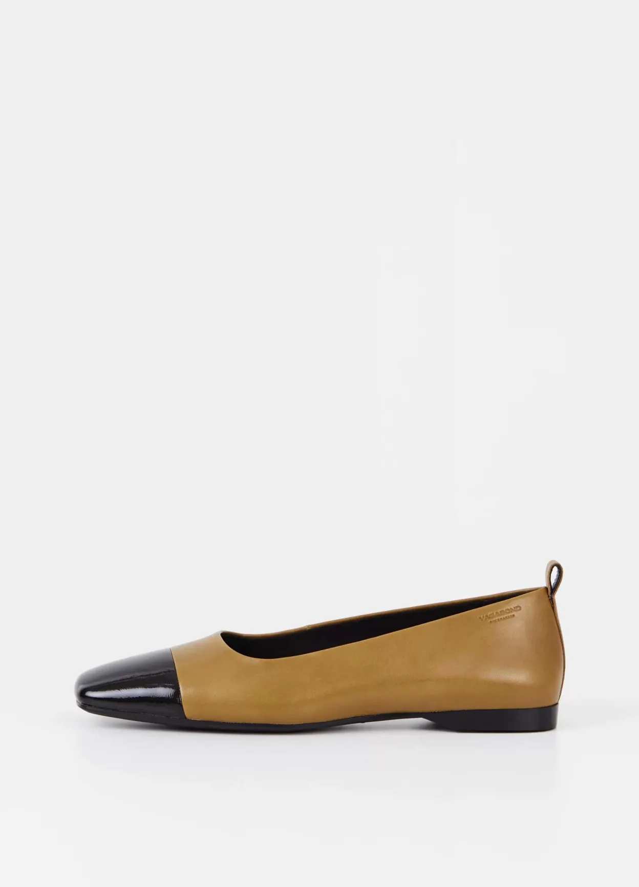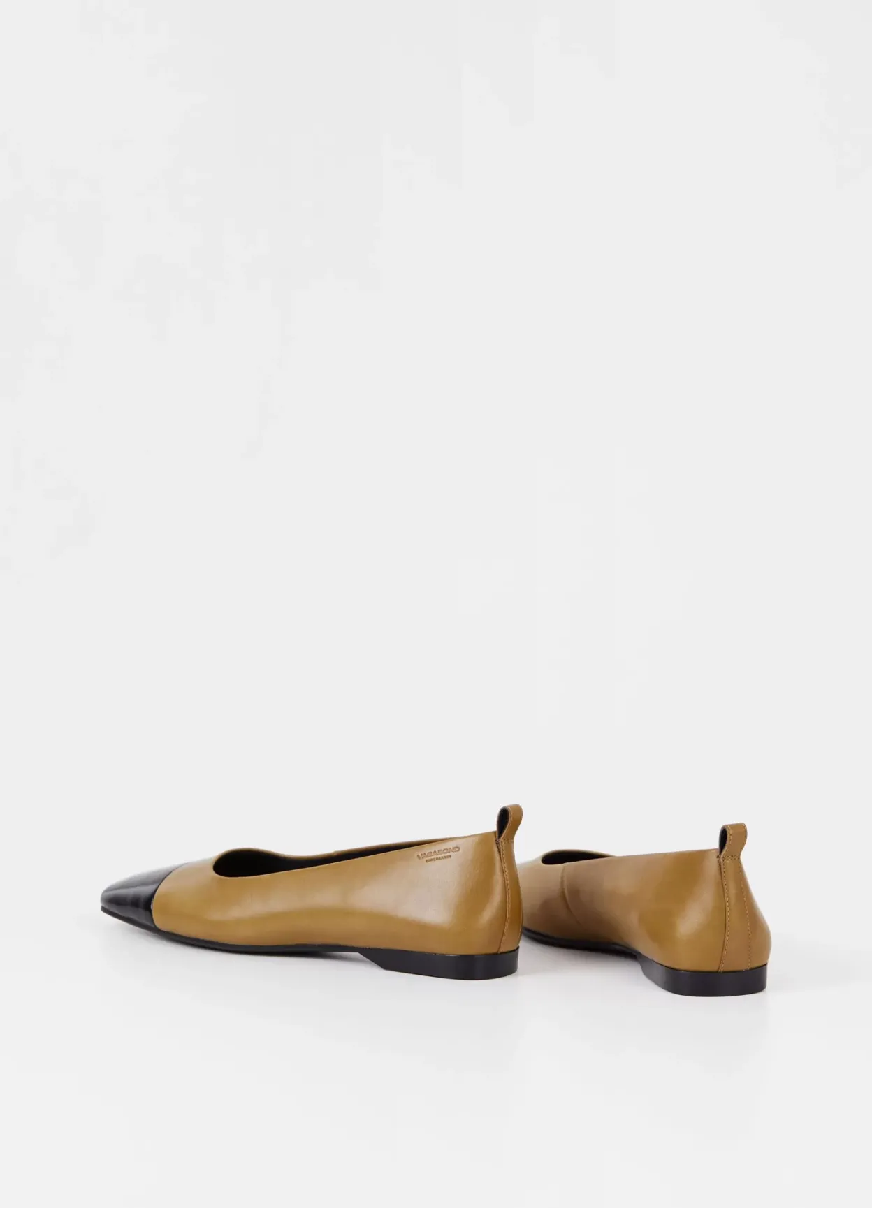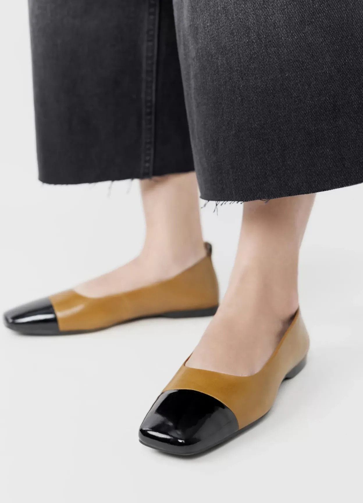 Delia er tidløse ballerinasko med et elegant design. Modellen er lavet i gulgrønt læder med tåhætte i sort laklæder. Den lave hælen måles til 12 mm. Detaljen: firkantet tå, hælstrop og tynd sål.