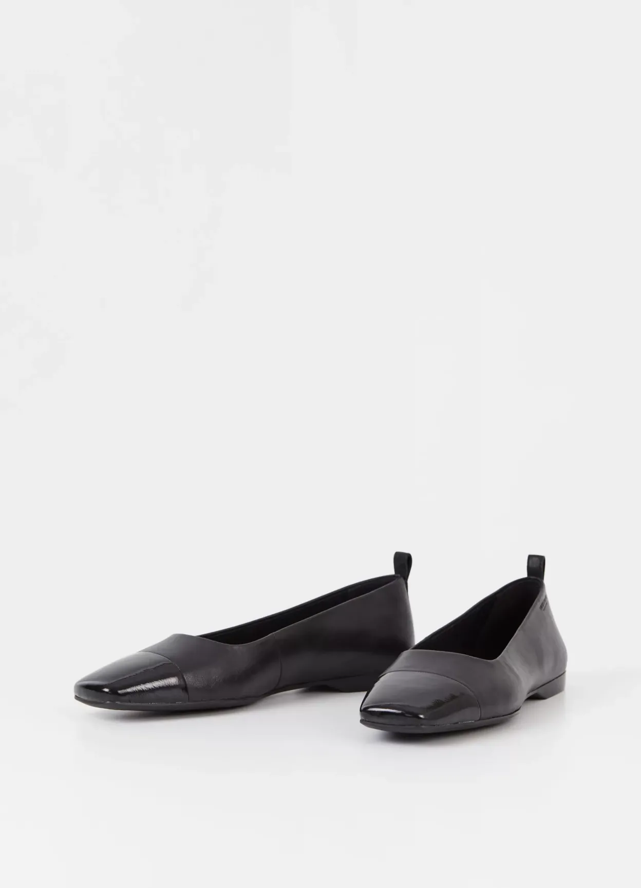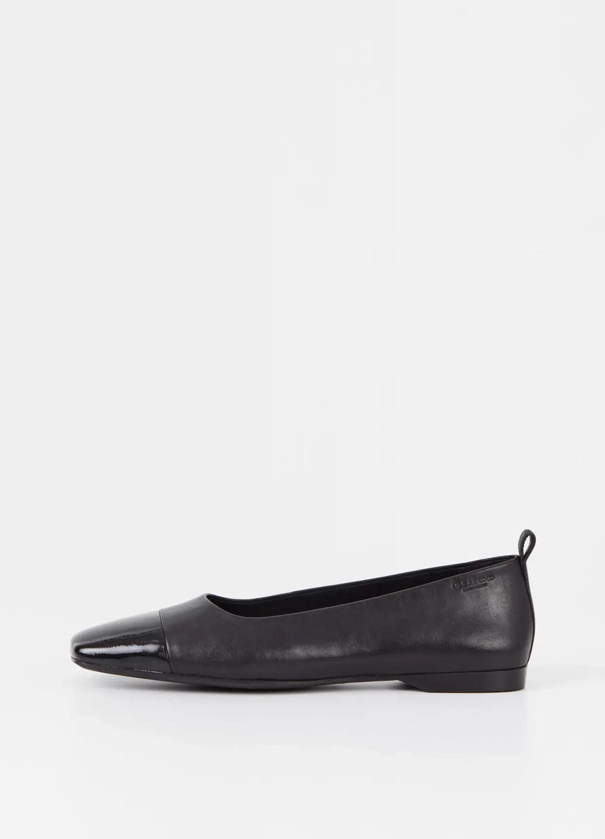 Delia er elegante flats i et tidløst design. Modellen er lavet i sort læder med tå i laklæder og indersål i læder. Den lave hæl er 12 mm. Detaljen: hælstrop.