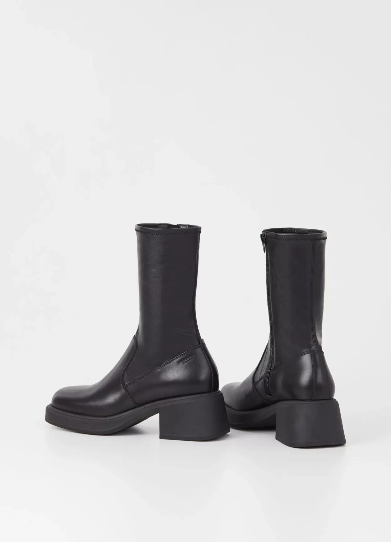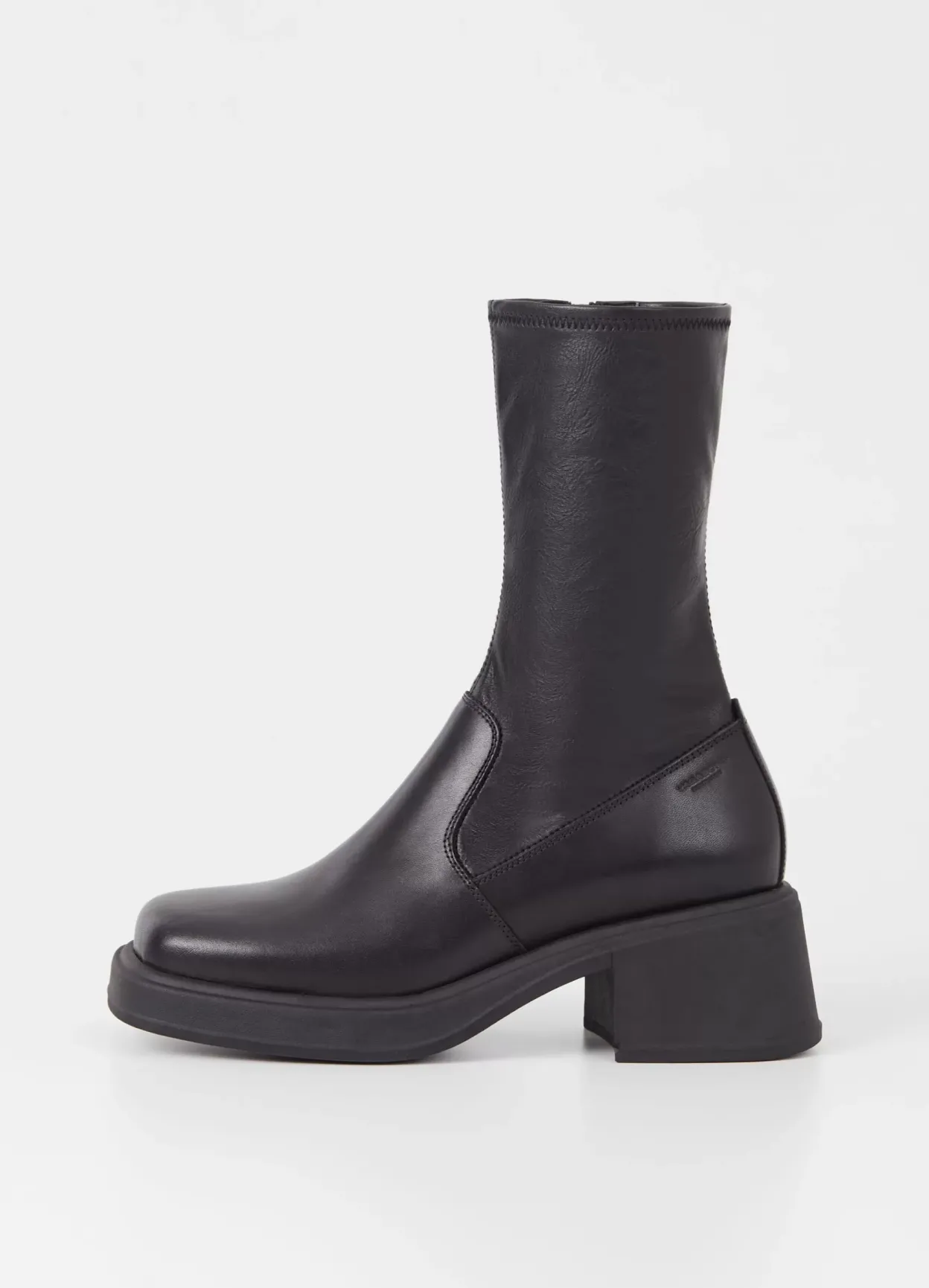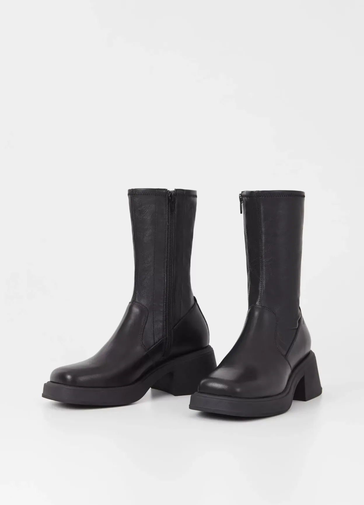 Dorah er mellemhøje stretchstøvletter med plateau fremme. Modellen er lavet i sort læder/syntetisk materiale med et stretchy skafte, lynlås langs med indersiden samt firkantet tå. Blokhælen er på 59 mm.