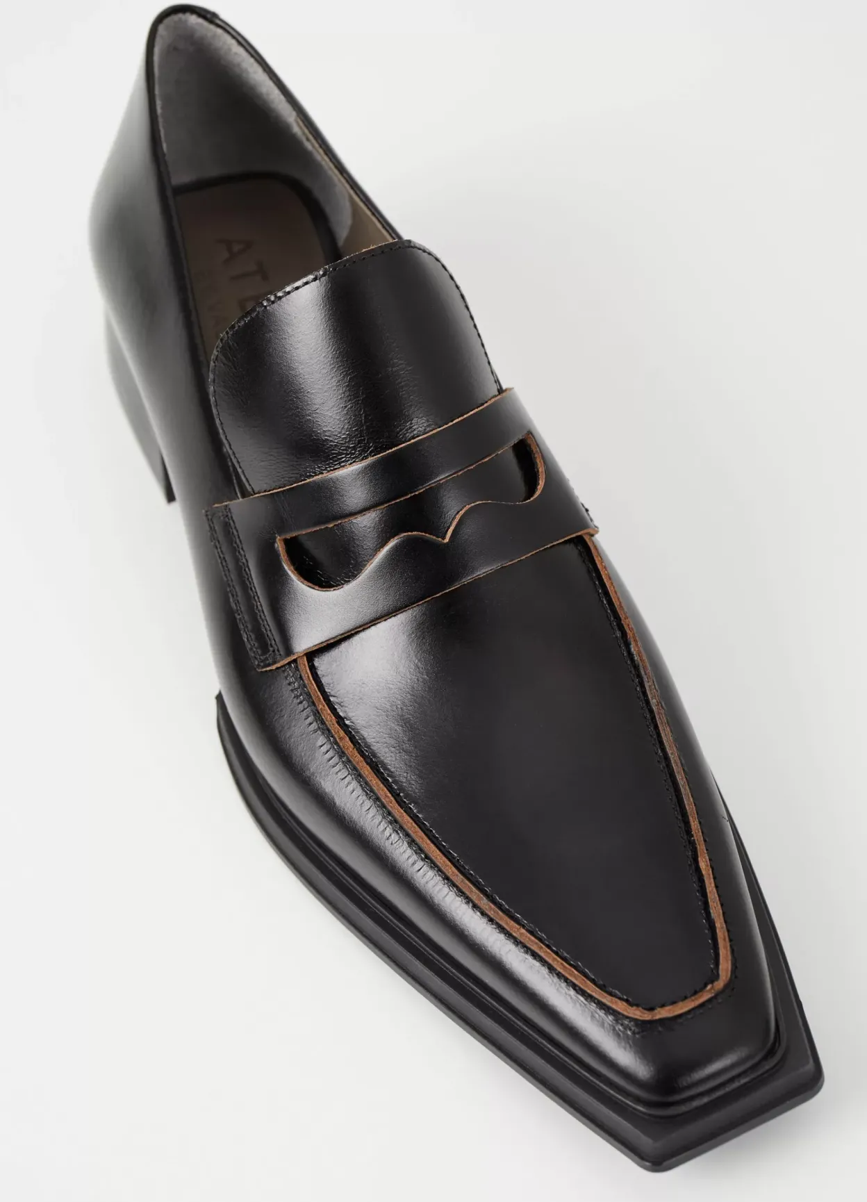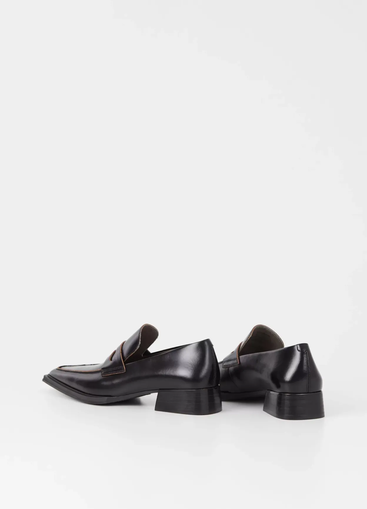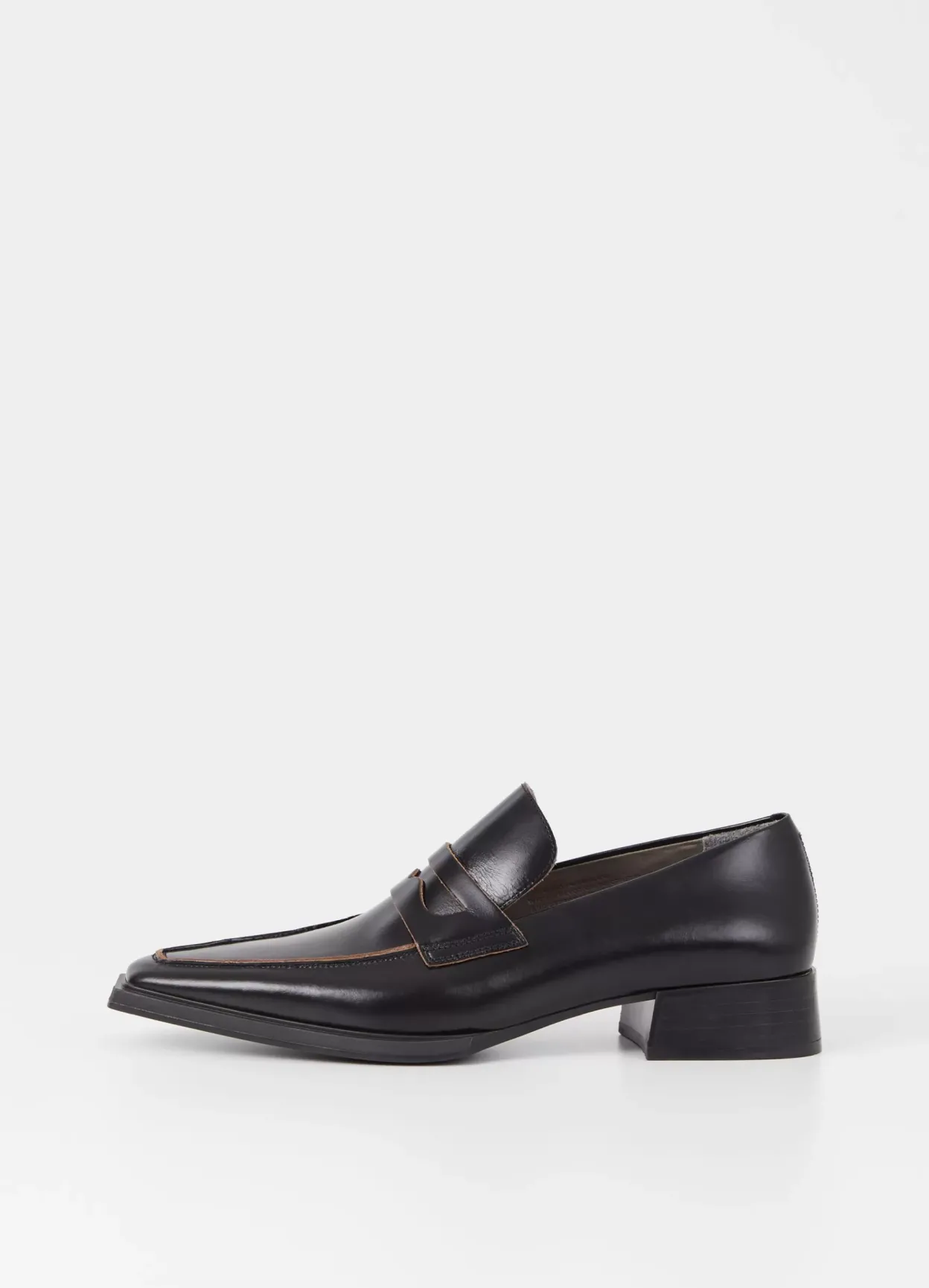Eida er klædelige loafers med et elegant udseende. Modellen er lavet i sort læder med blank finish, klassisk penny-rem over foden samt spids tå med et kantet design. Hælen er 32 mm.