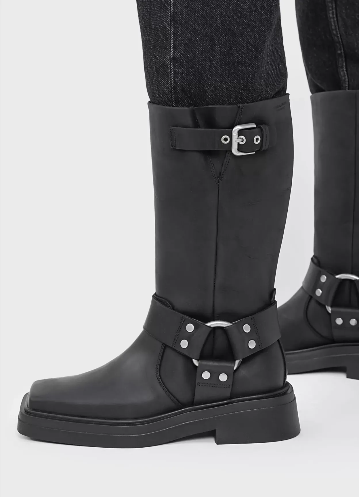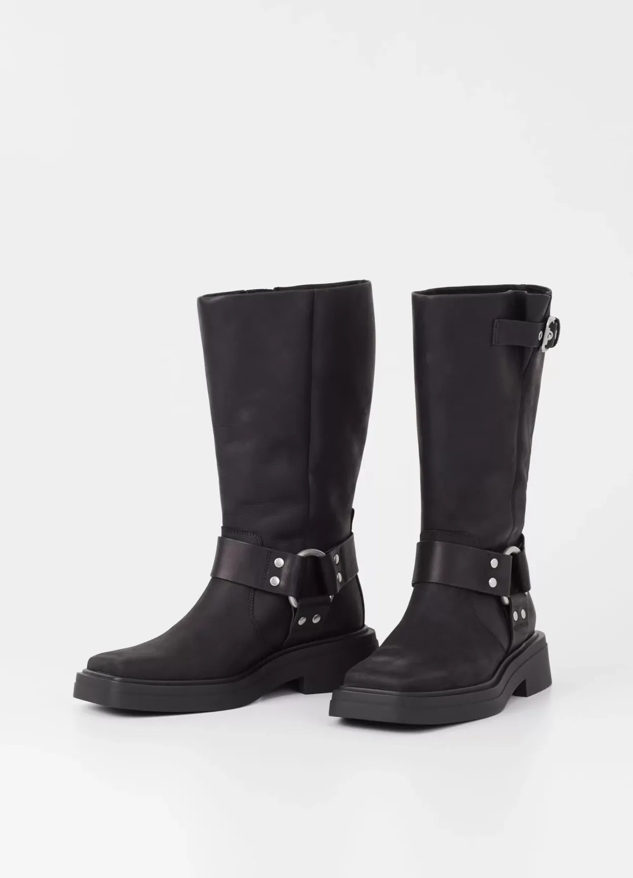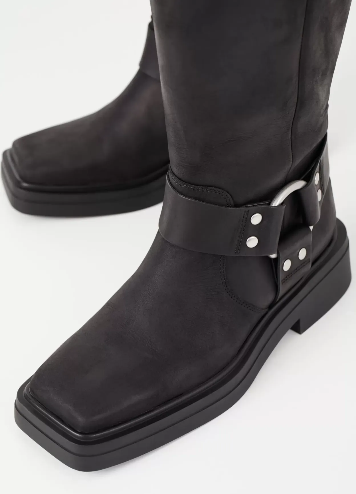 Eyra er moderne bikerstøvler med harness-detaljer. Modellen er lavet i blødt, olieret nubuck i sort med en bred, firkantet tå, sølvfarvede harness-detaljer samt et mellemhøjt skafte. De solide gummisåler er 45 mm.