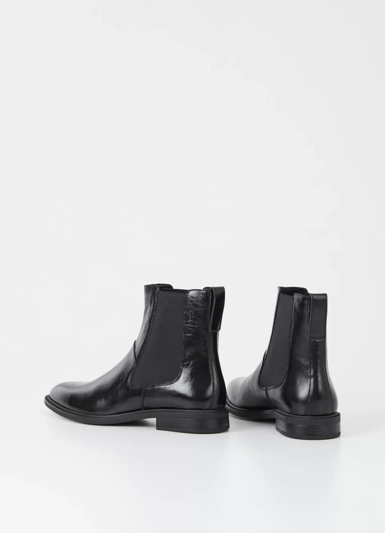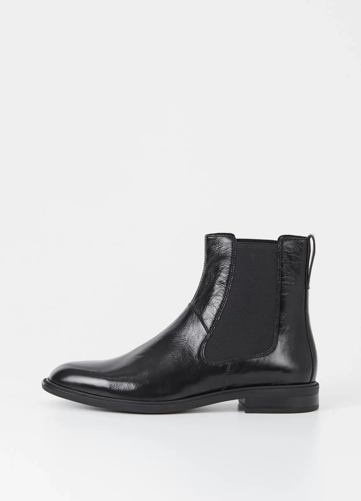 Frances er en tidløs Chelsea støvle med et moderne og rent design. Modellen er i sort lakeret skind med en spids tåform, træk flapper og elastikpaneler langs skaftet. Den fine ydersål er med en lav hæl på 29 mm.