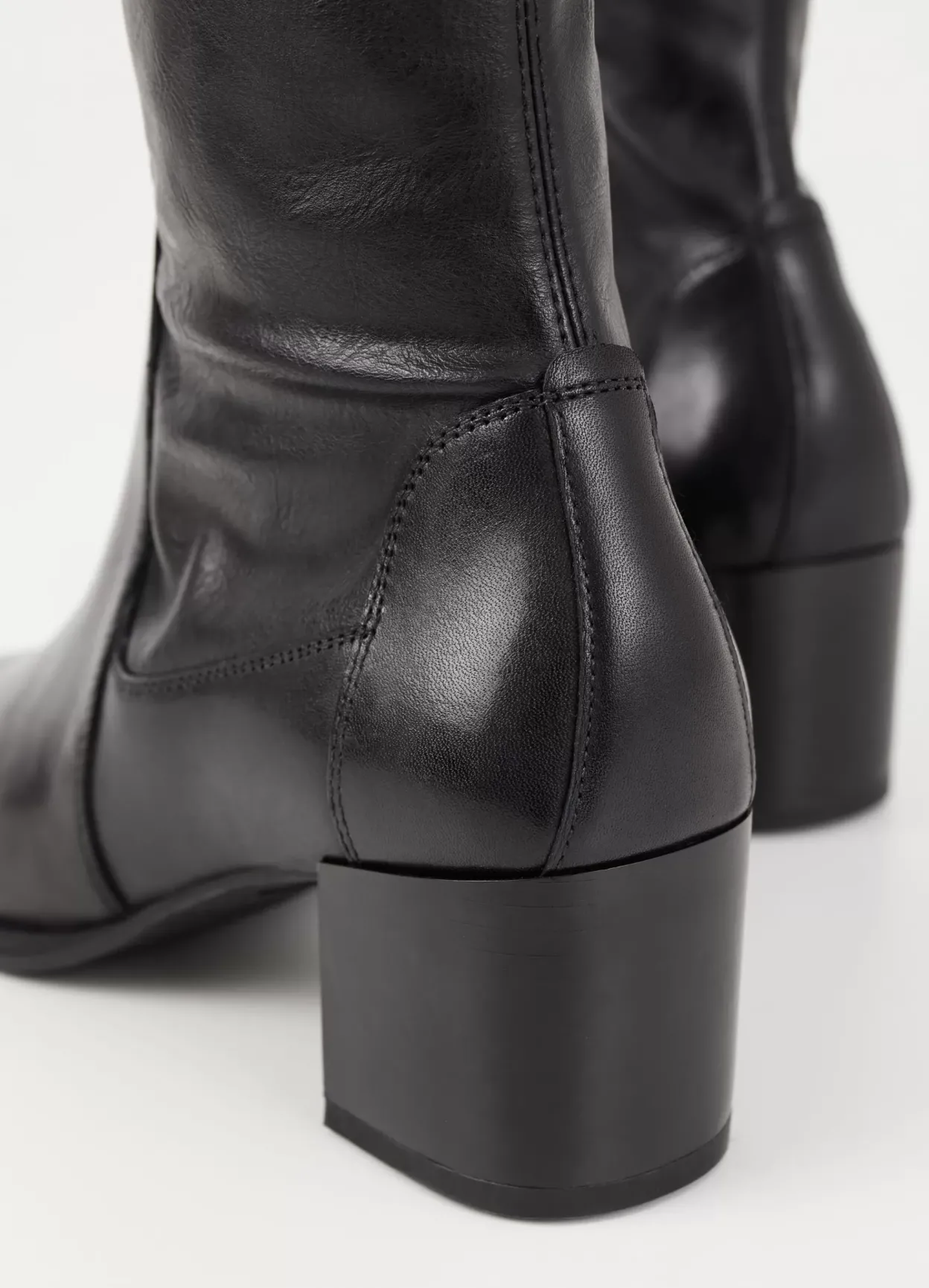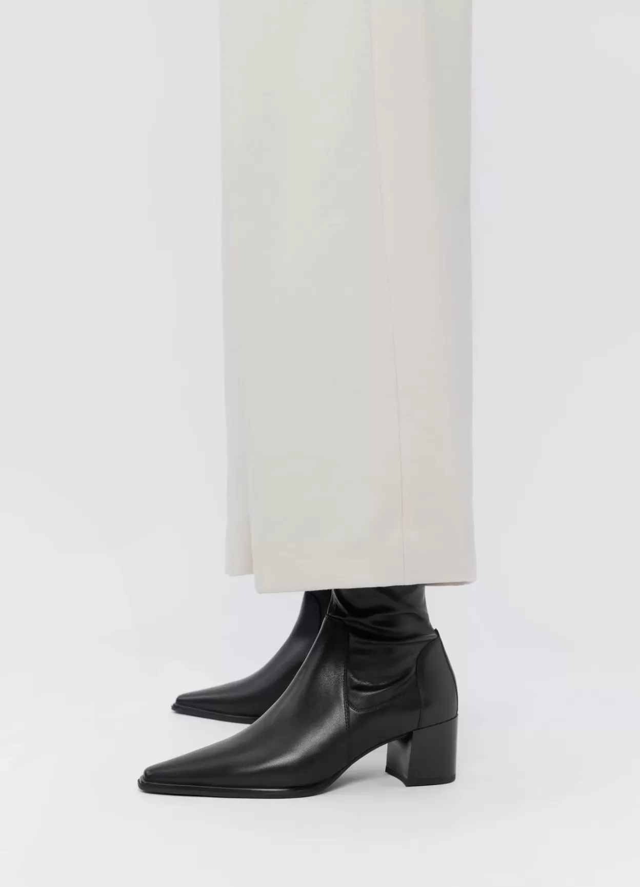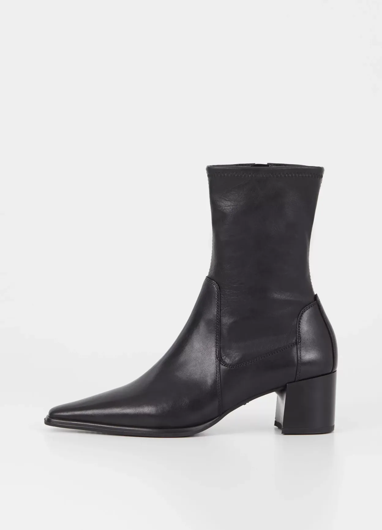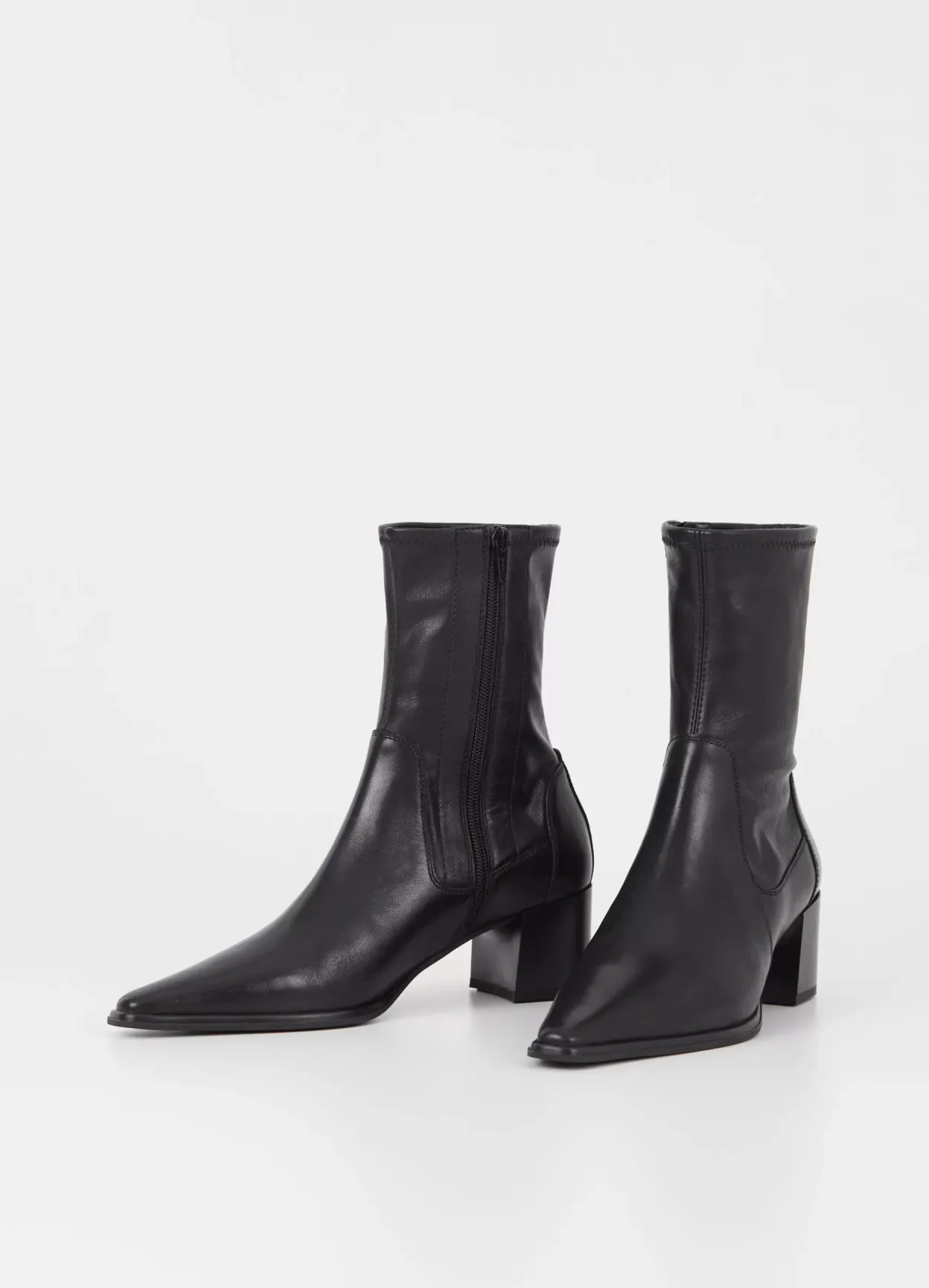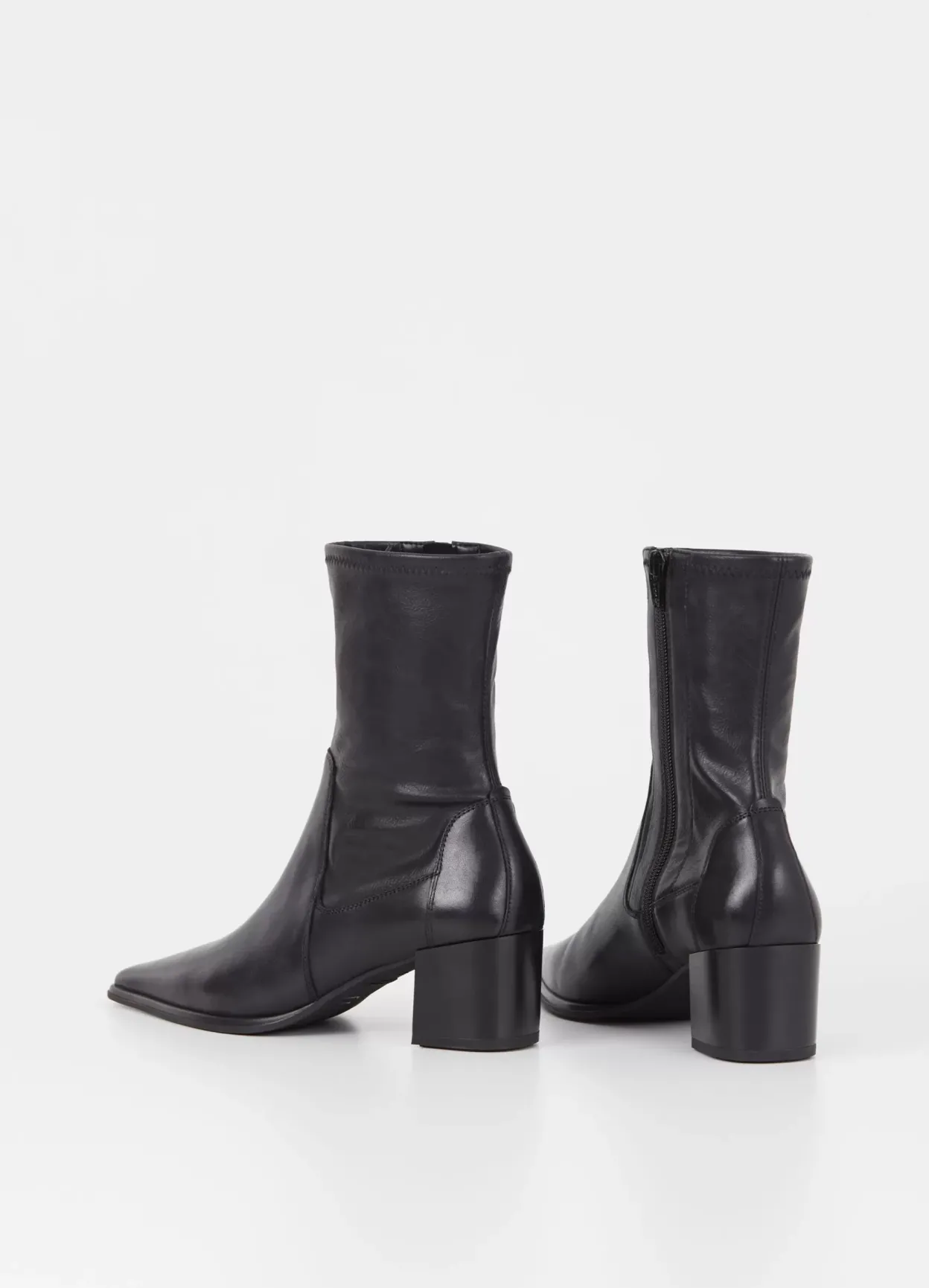 Giselle er minimalistiske stretchstøvletter med en afsmalnende silhuet. De er lavet i sort læder/syntetisk læder med et mellomhøjt skafte, spids tå og lynlås langs med indersiden af skaftet. Hælen er 57 mm.