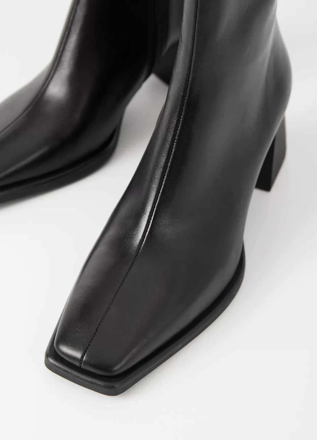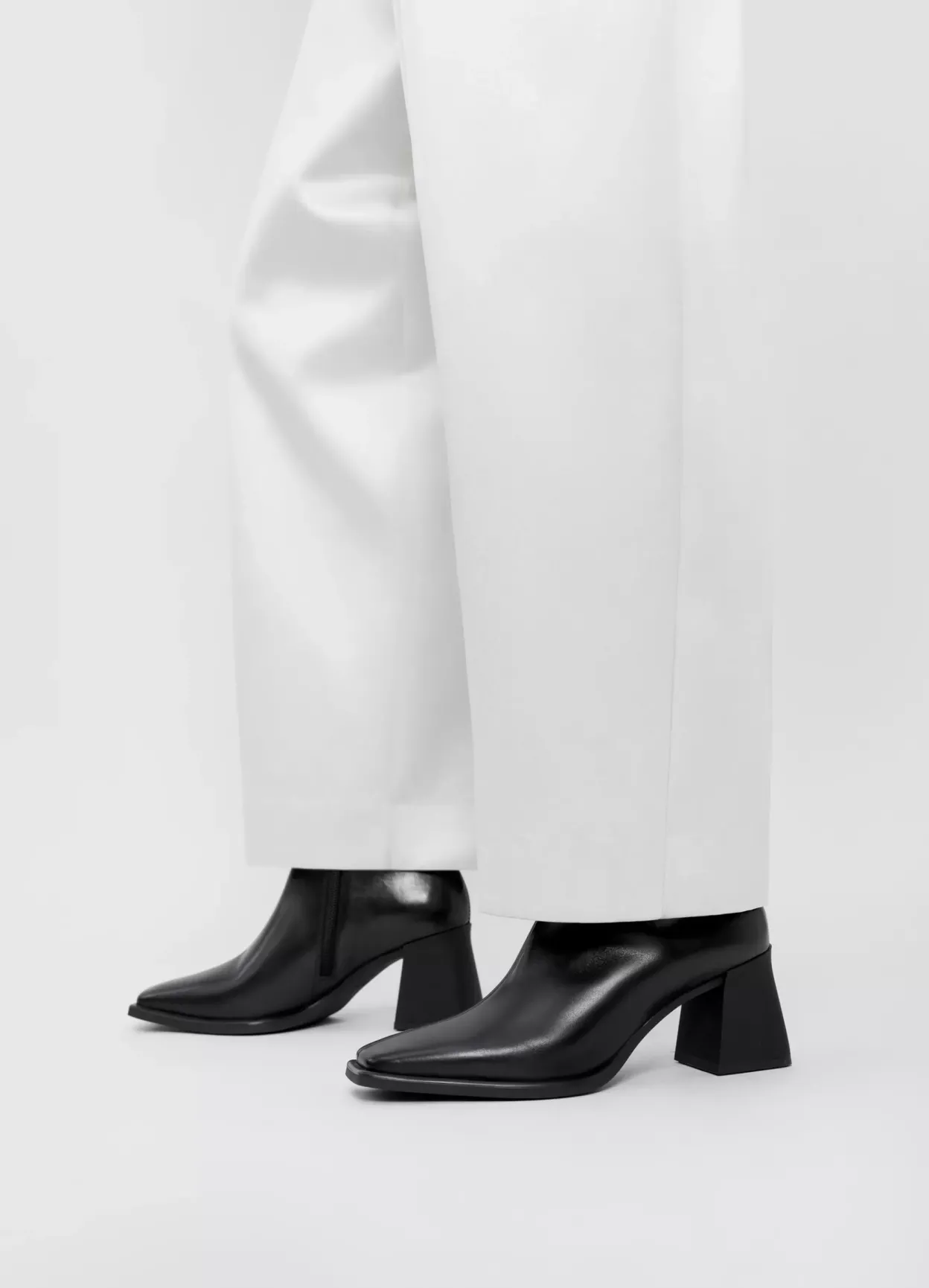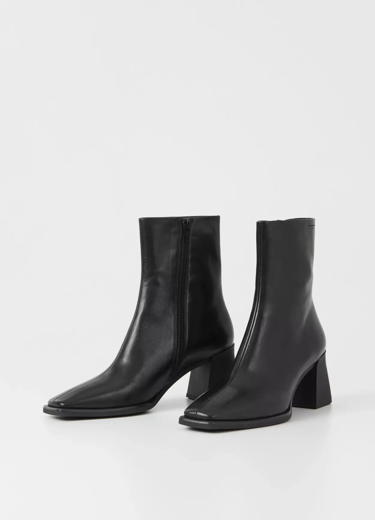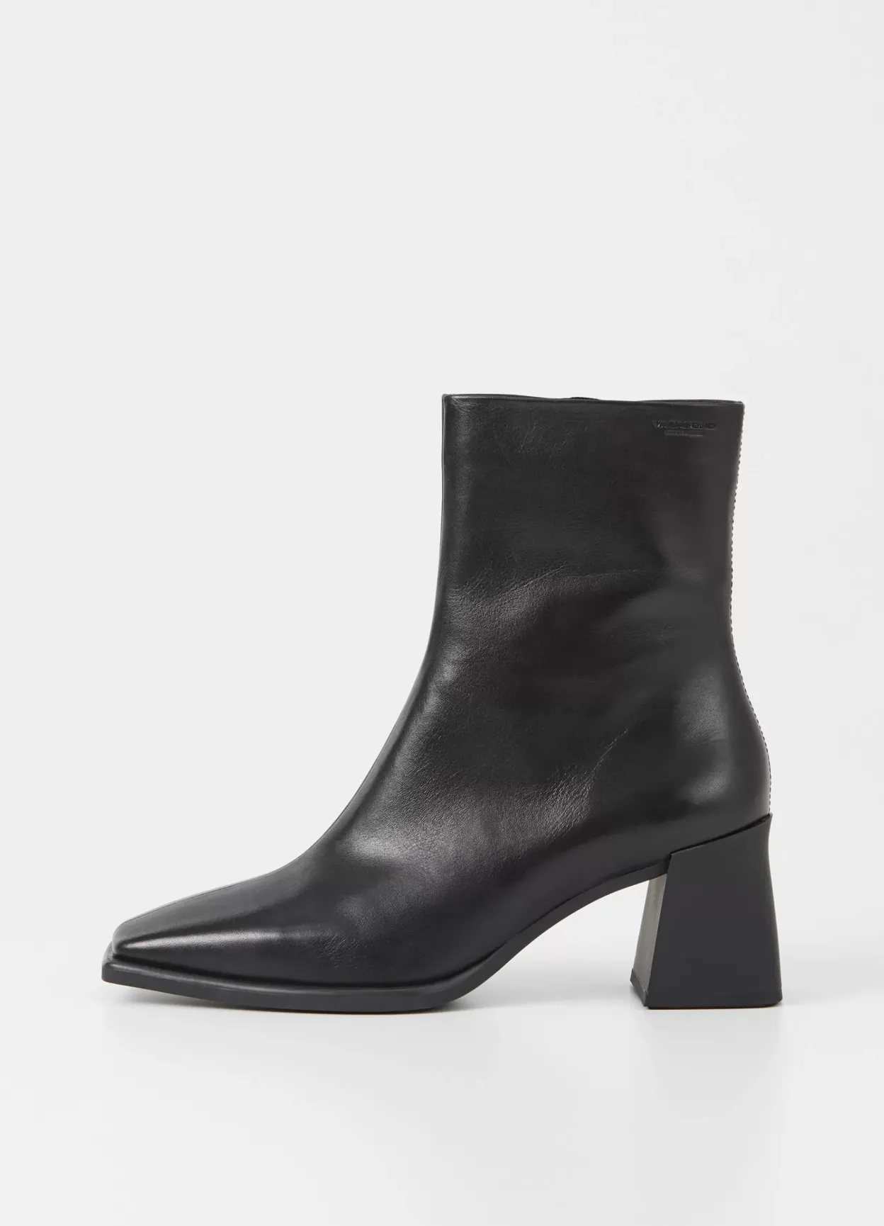Hedda er tidløse ankelstøvler med et rent, retro-inspireret design. Modellen er i sort læder med en firkantet tå, lynlås og dekorative sømme fremme. Den fine ydersål har en blokhæl med svaj på 70 mm.