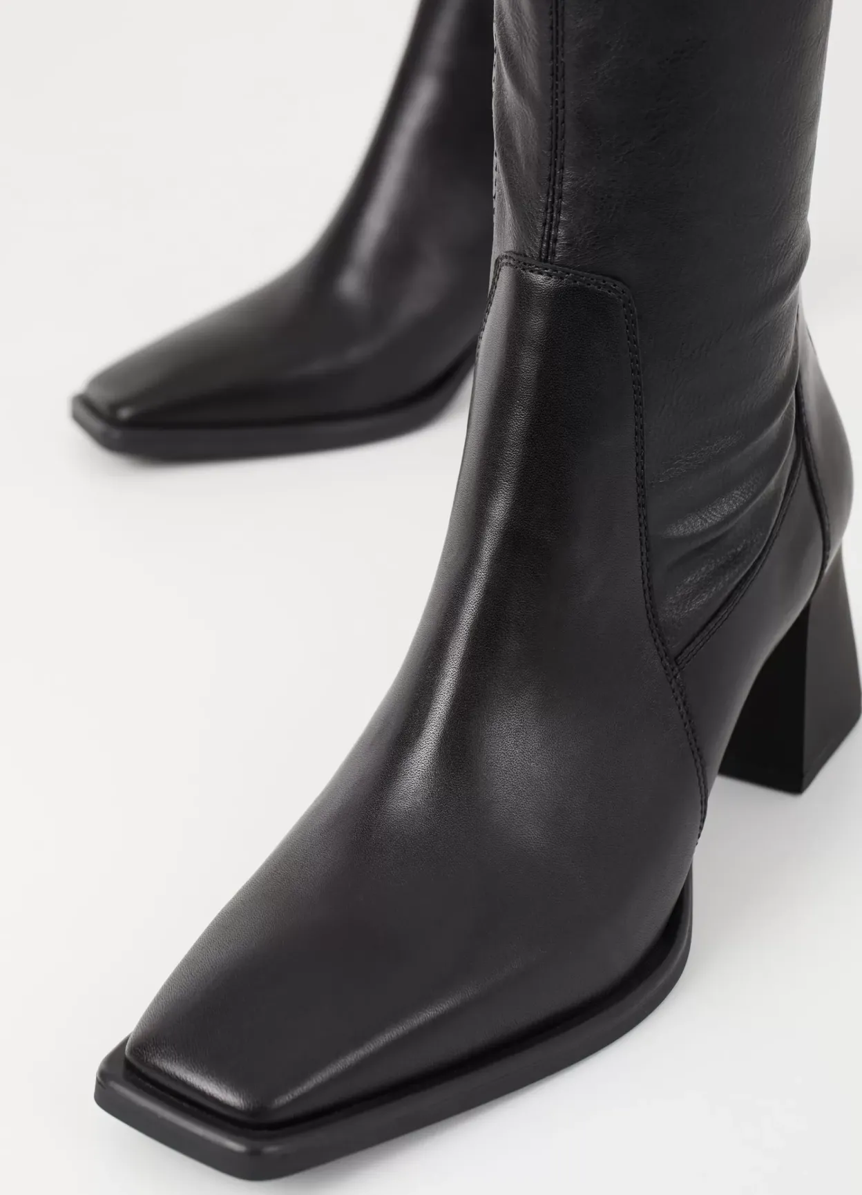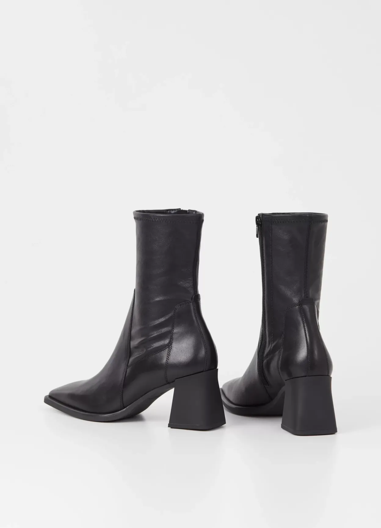 Hedda er højhælede støvletter i et elegant design. Modellen er lavet i sort læder/syntetisk læder med et stretchy, mellemhøjt skafte, firkantet tå og lynlås langs med indersiden af skaftet. Hælen måler 70 mm.