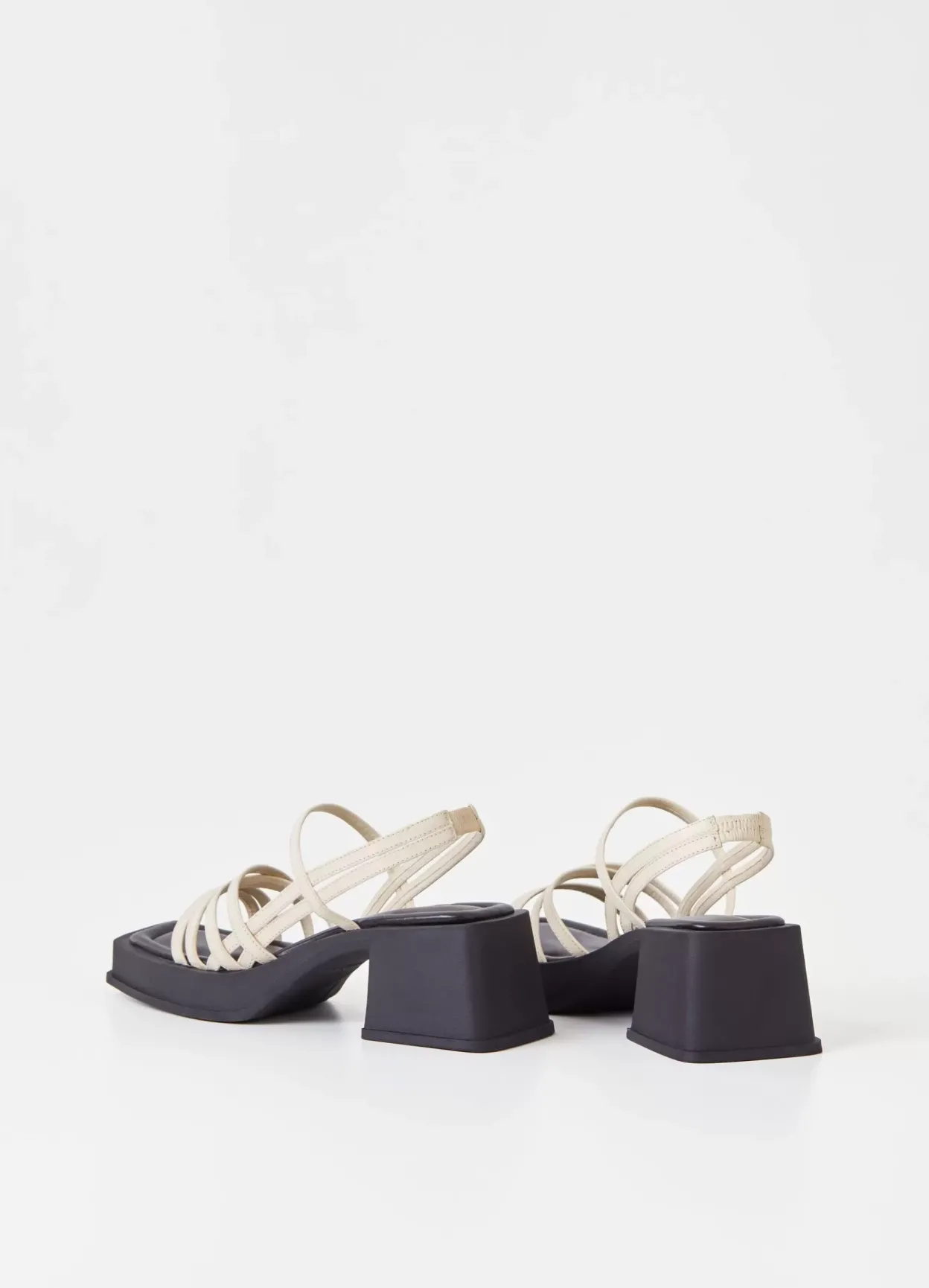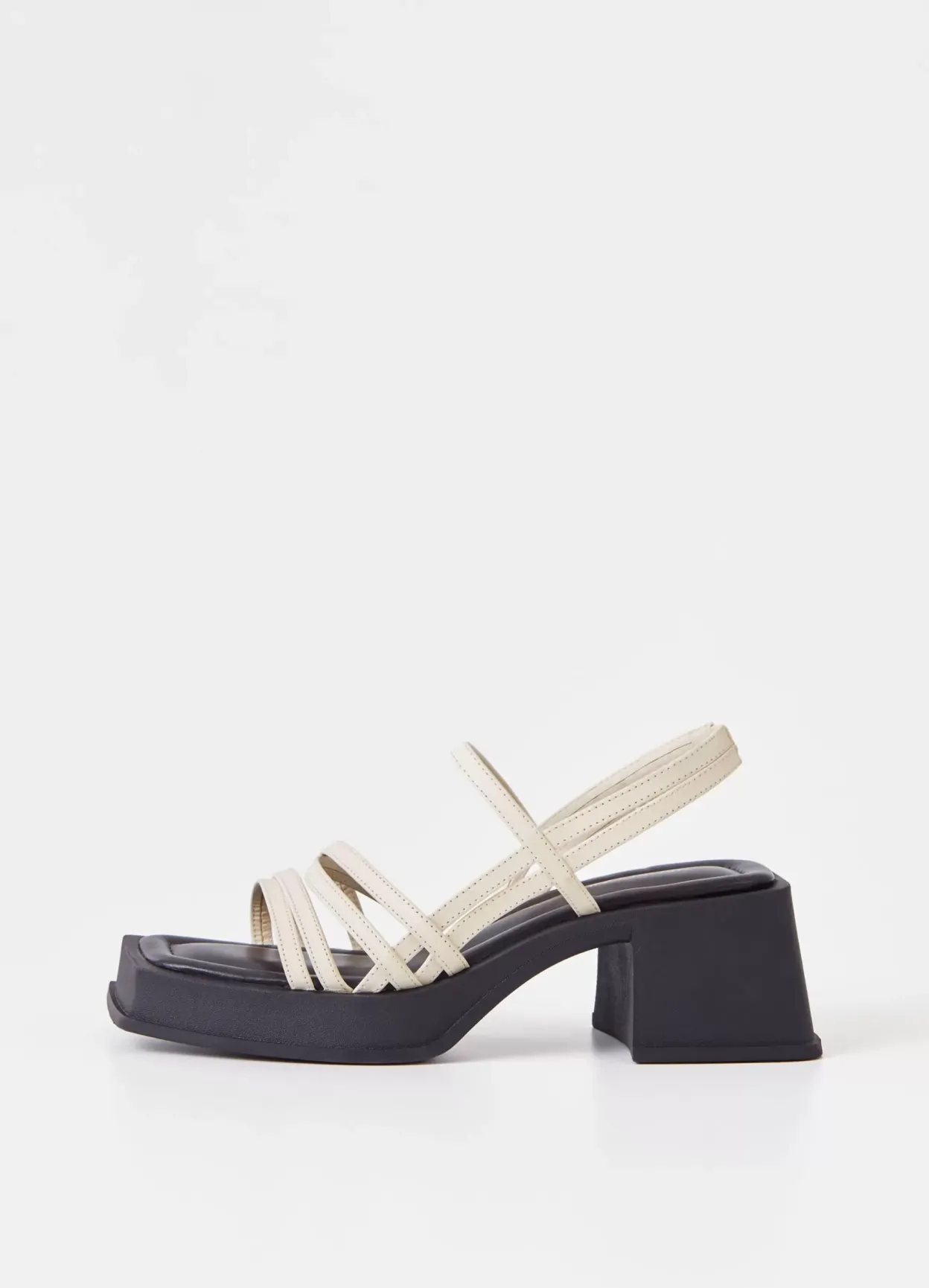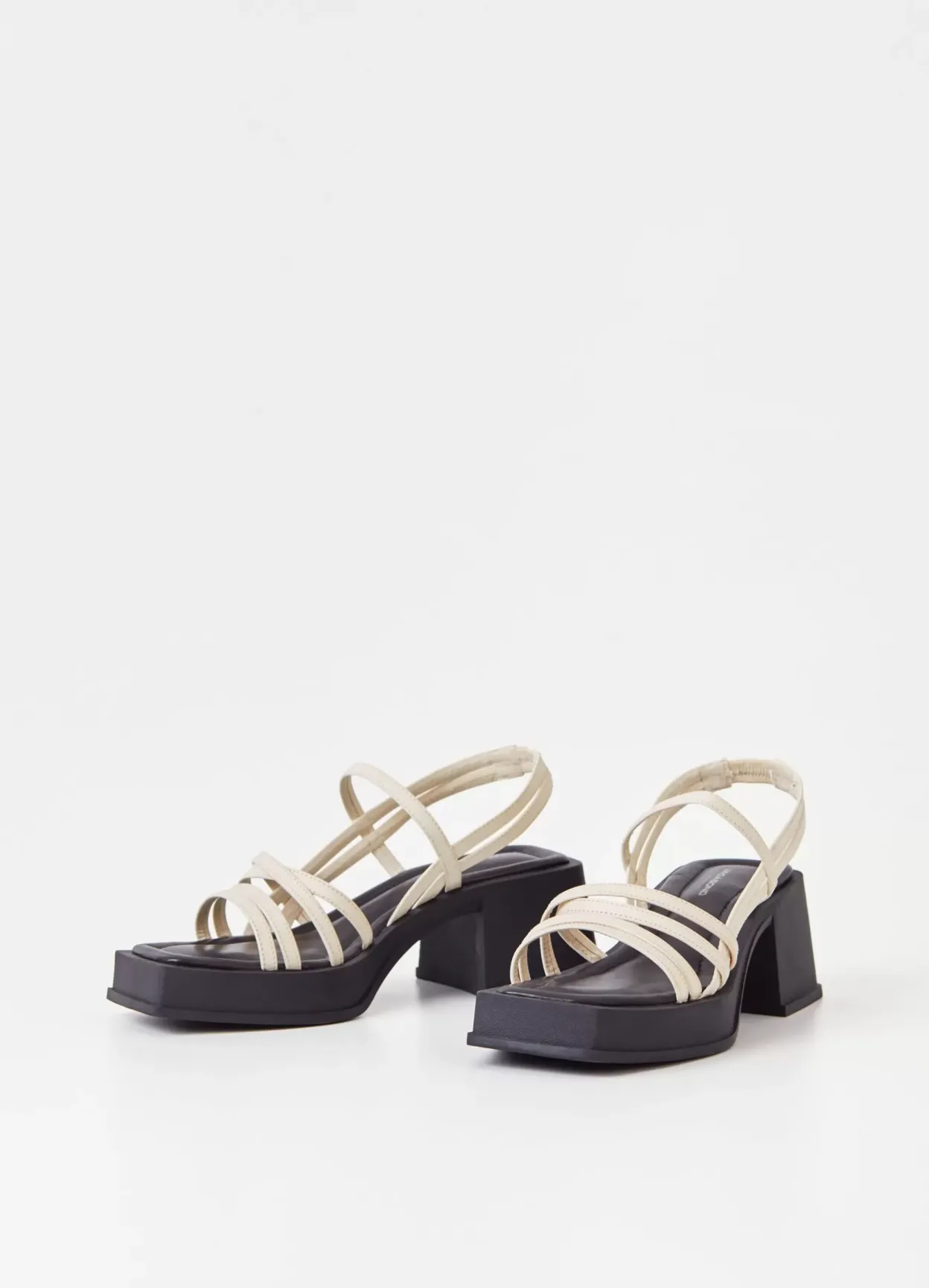 Hennie er remsandaler med halvfemser-vibes fra vores bagkatalog. Modellen er lavet i off-white læder med smalle remme over foden og bred, firkantet tåform. Sålen har plateau foran samt blokhæl på 67 mm.