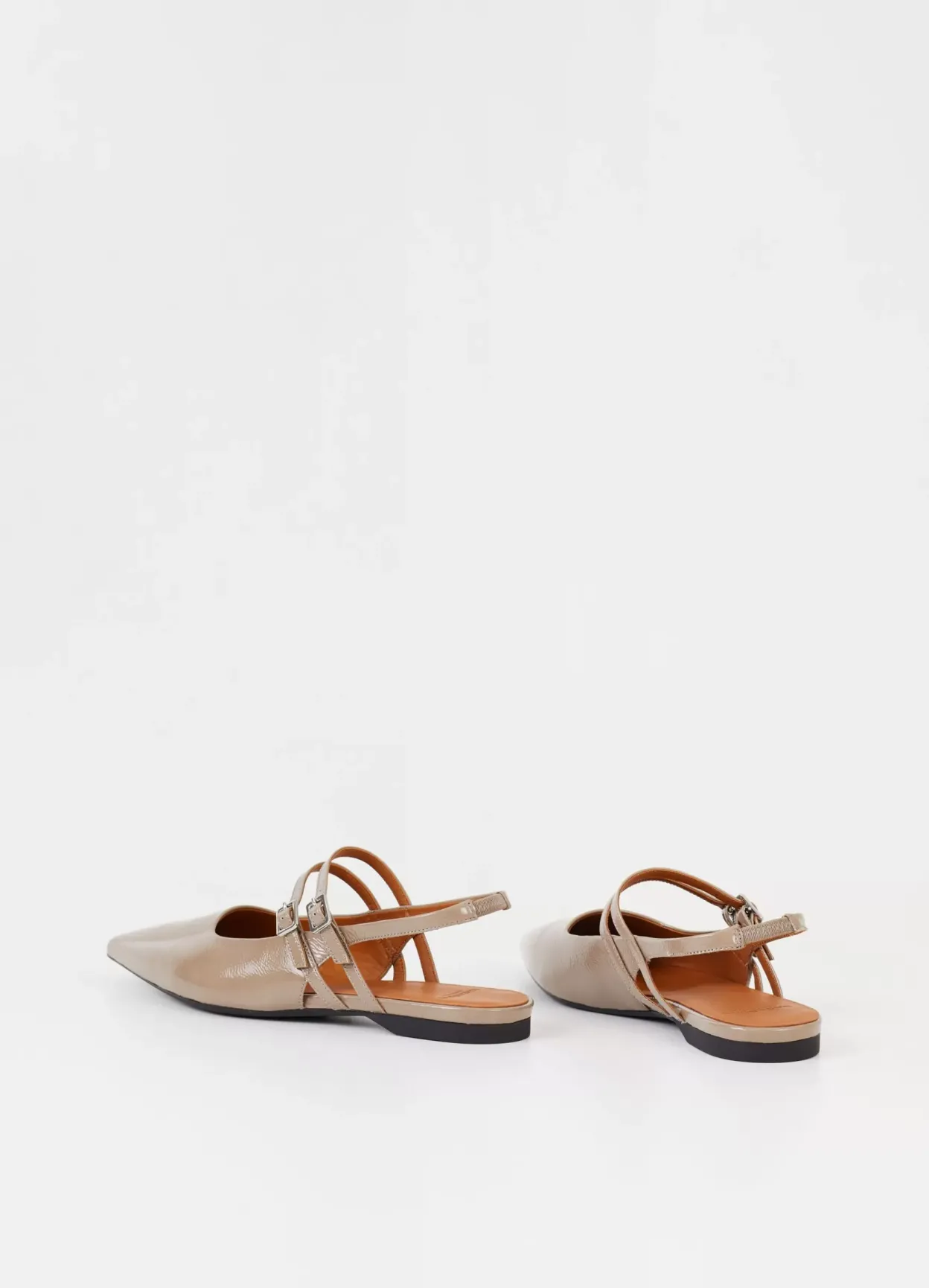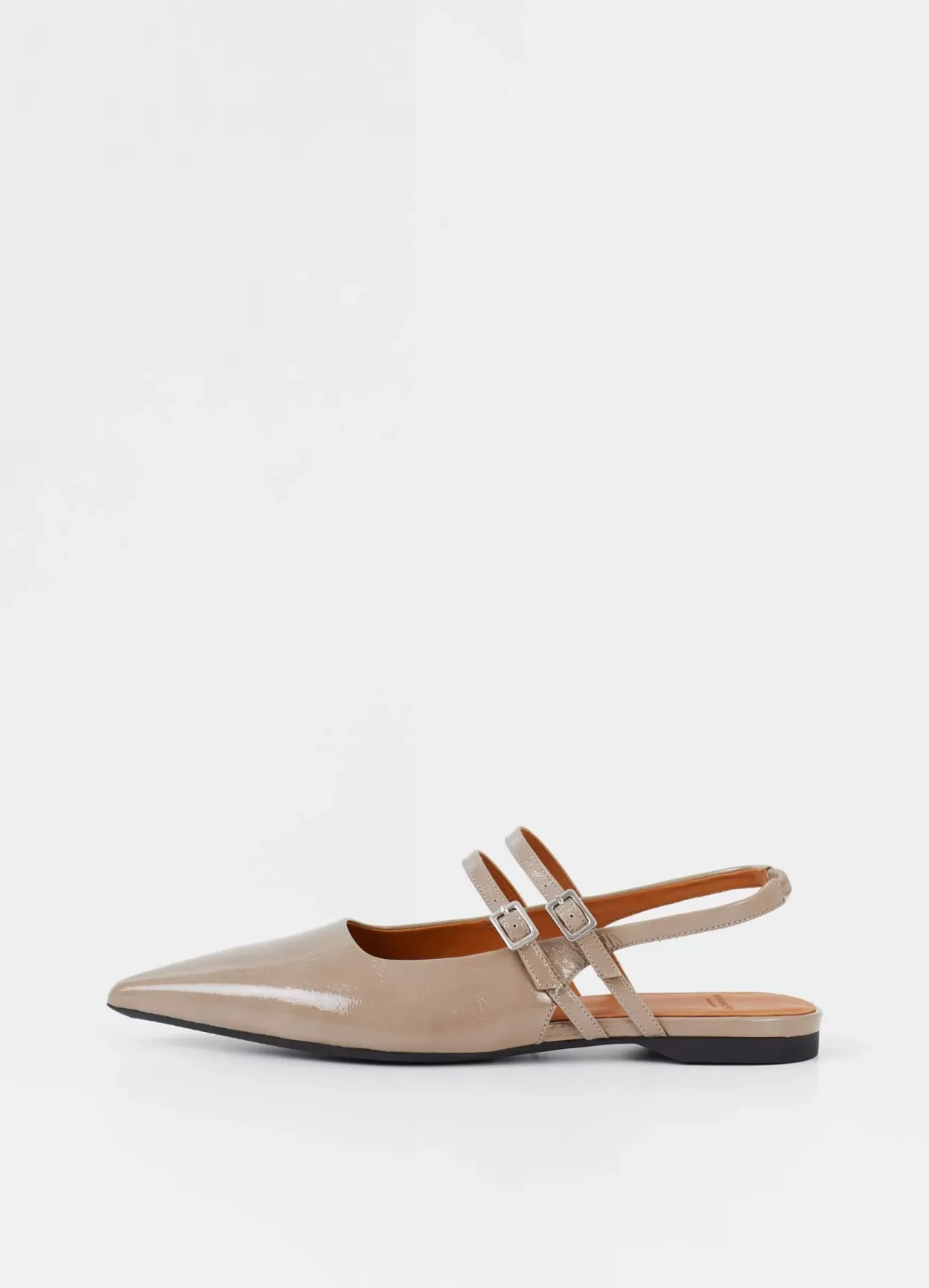 Hermine er slingback-sko med en blank overflade og spids silhuet. Modellen er lavet i beige laklæder med elastisk hælstrop og dobbelte, justerbare stropper med sølvfarvet spænde over foden. Detaljen: læderfor og indersål i læder. Hælen er på 10 mm.