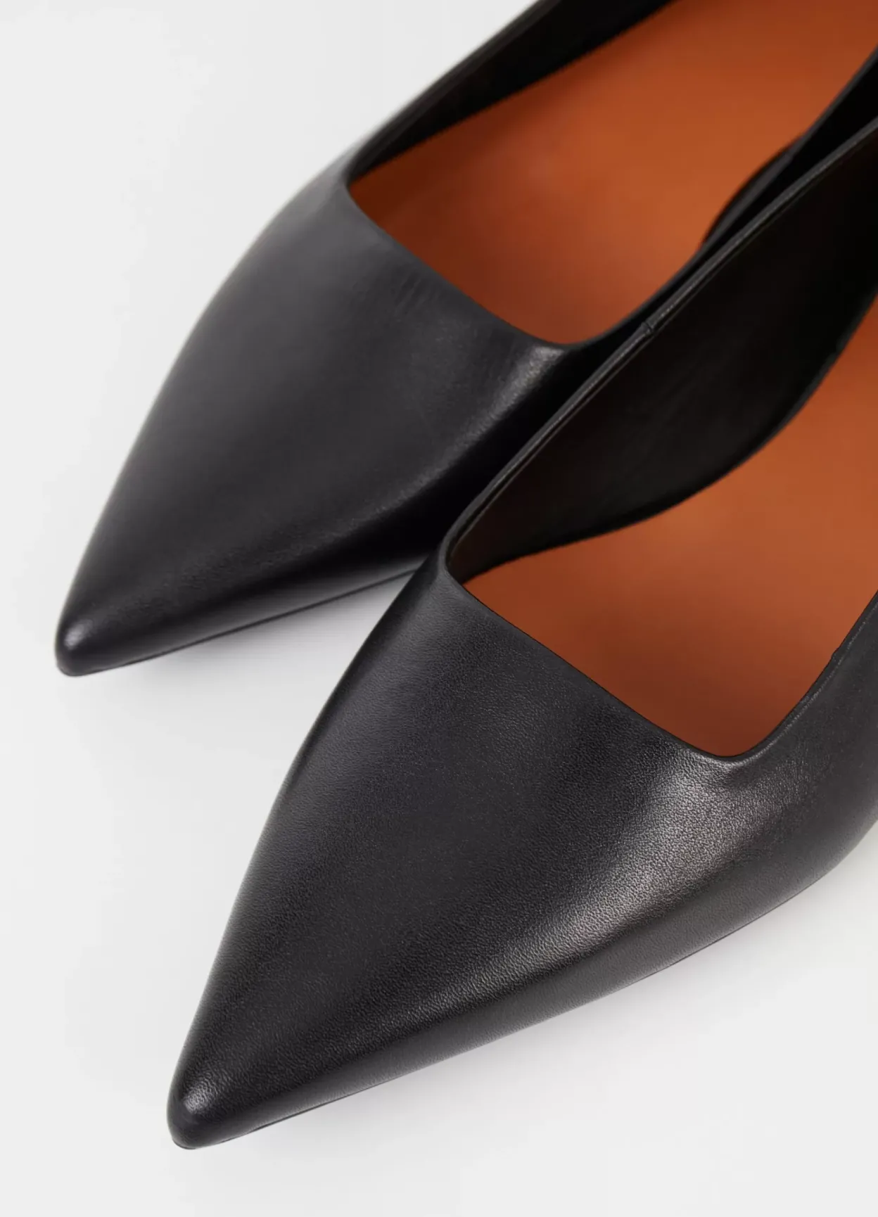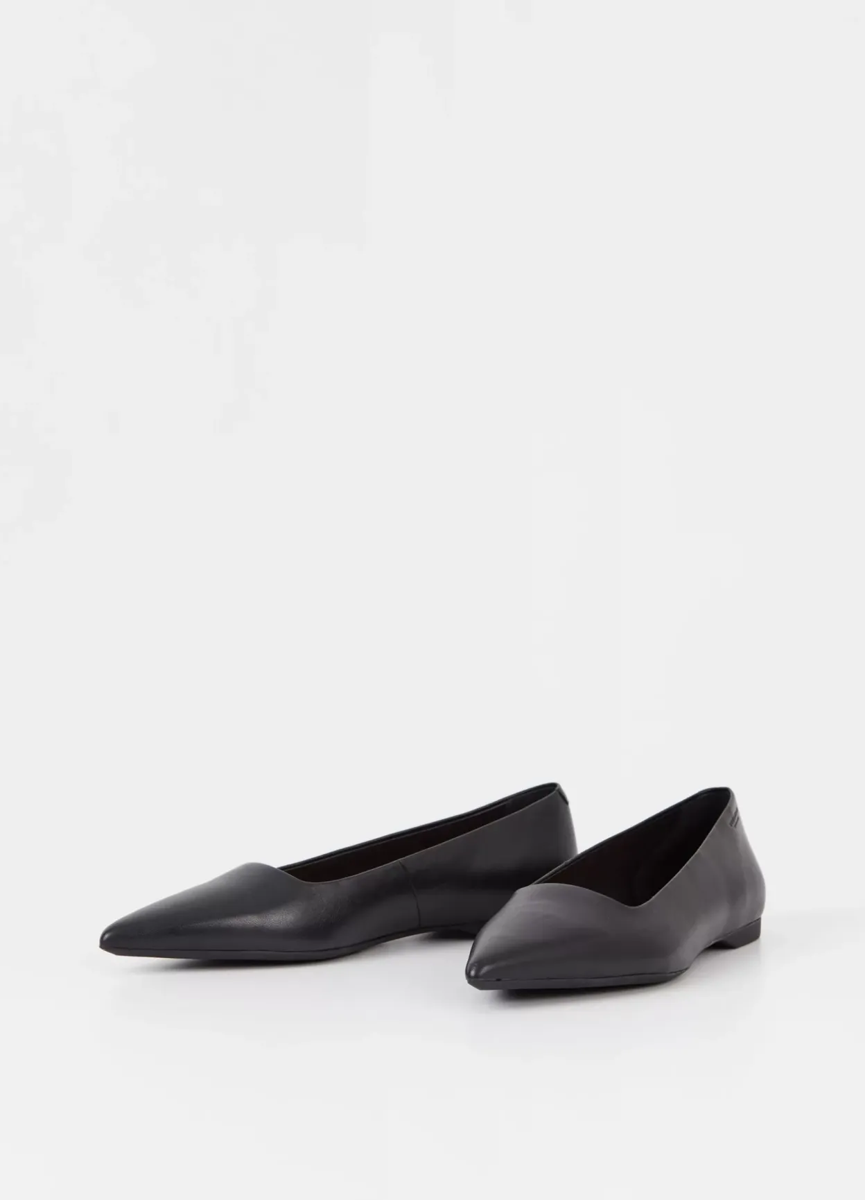 Hermine er stilrene ballerinasko med en spids silhuet. Modellen er lavet i sort læder, har en spids tåform samt tynd sål på 10 mm. Detaljen: læder/tekstilfor og indersål i læder.