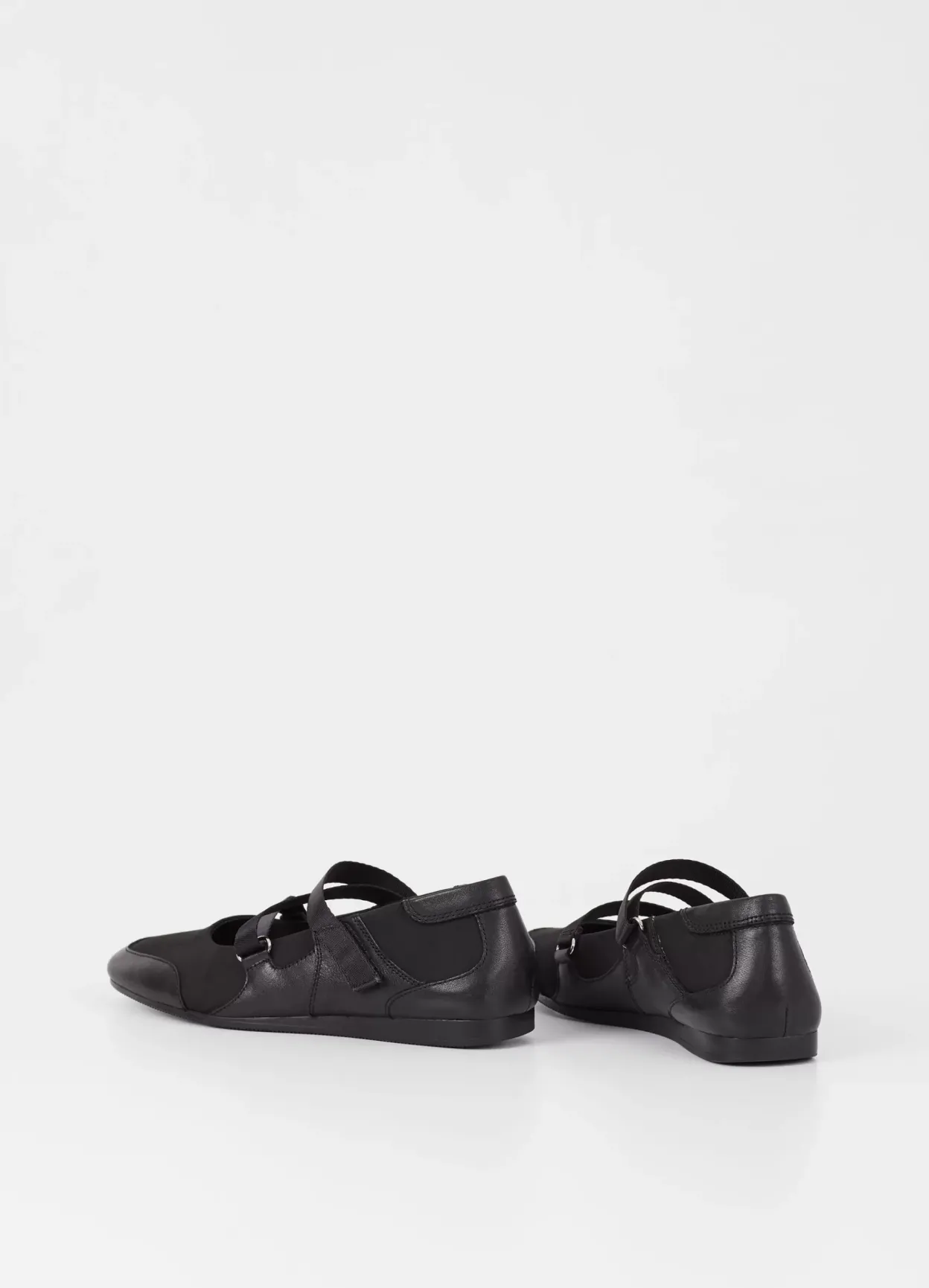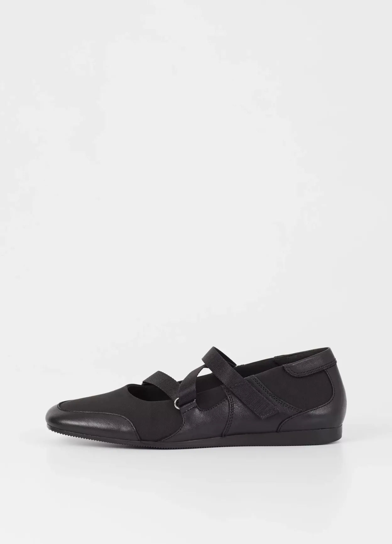 Hillary er ballerinasko med et sporty look. Modellen er lavet i sort tekstil med sorte læderpaneler samt en justerbar rem med vellcrolukning over foden. Detaljen: rund tåform og en tynd sål på 10 mm.