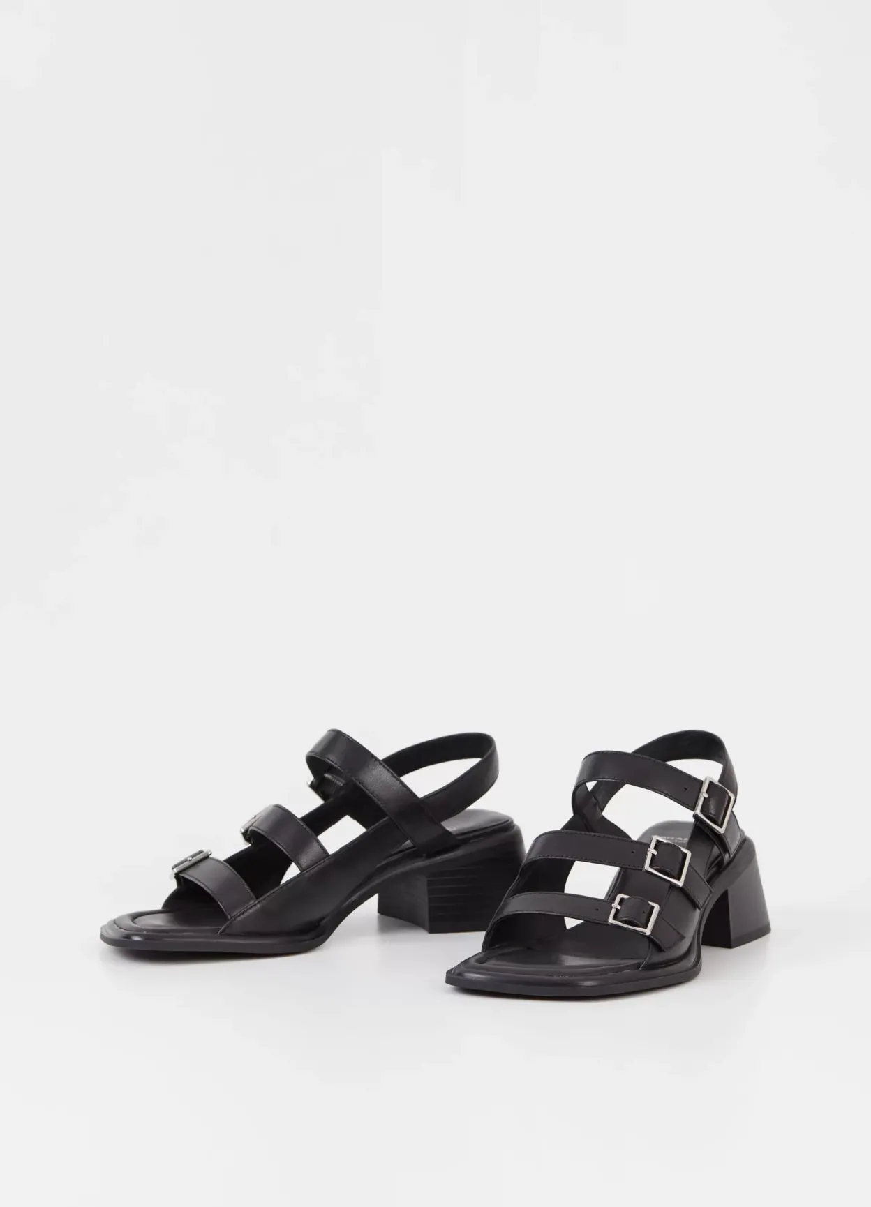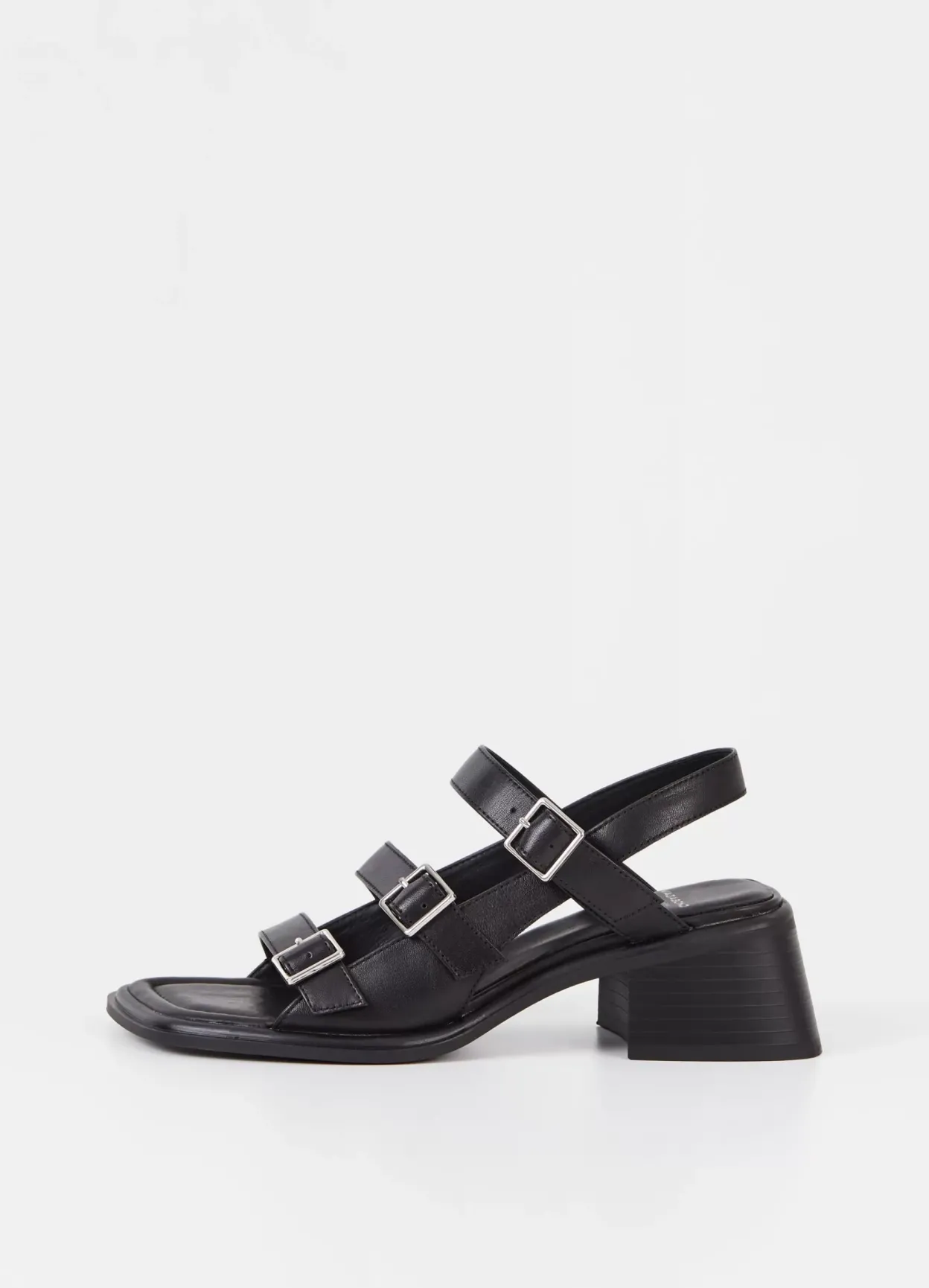 Ines er stilfulkde remsandaler med sølvfarvede spænder. Modellen er lavet i sort læder med tre justerbare remme over foden, hælremme samt firkantet tåform. Den brede hæl er 53 mm. Detaljen: en let polstret indersål i læder.