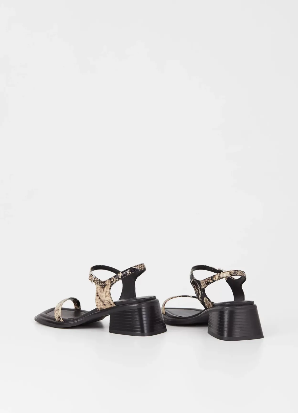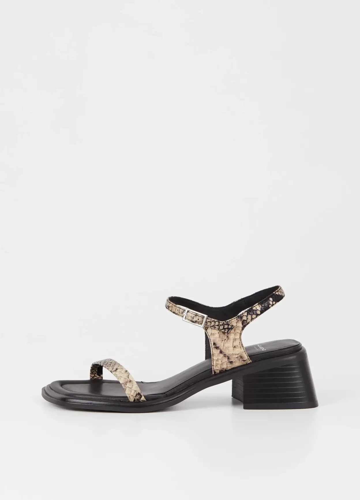 Ines er minimalistiske sandaler med en bred blokhæl. Modellen er lavet i læder med reptil-print, og har en enkel rem over foden, justerbar ankelrem samt firkantet tå. Sålen hviler på en hæl på 53 mm.
