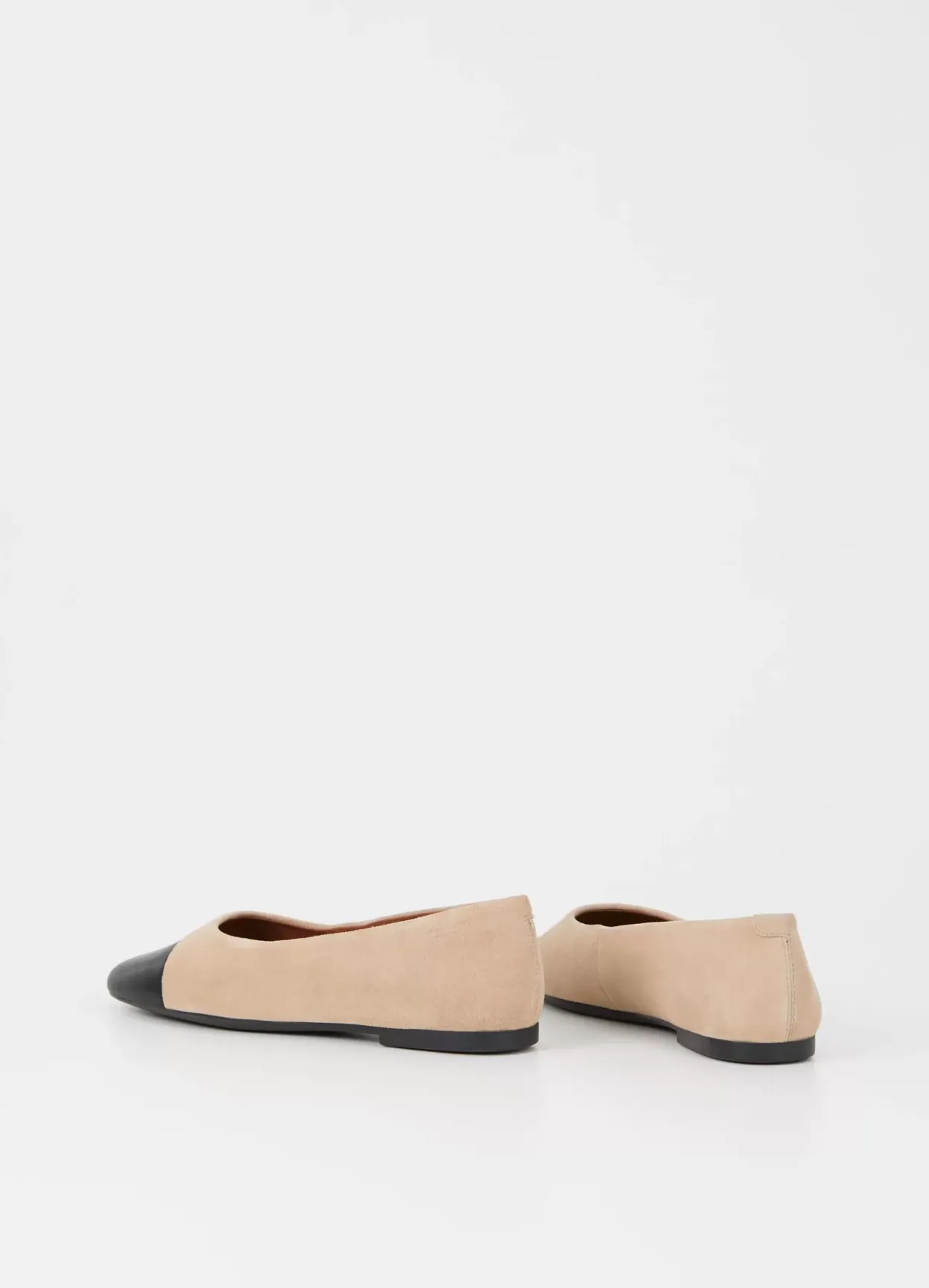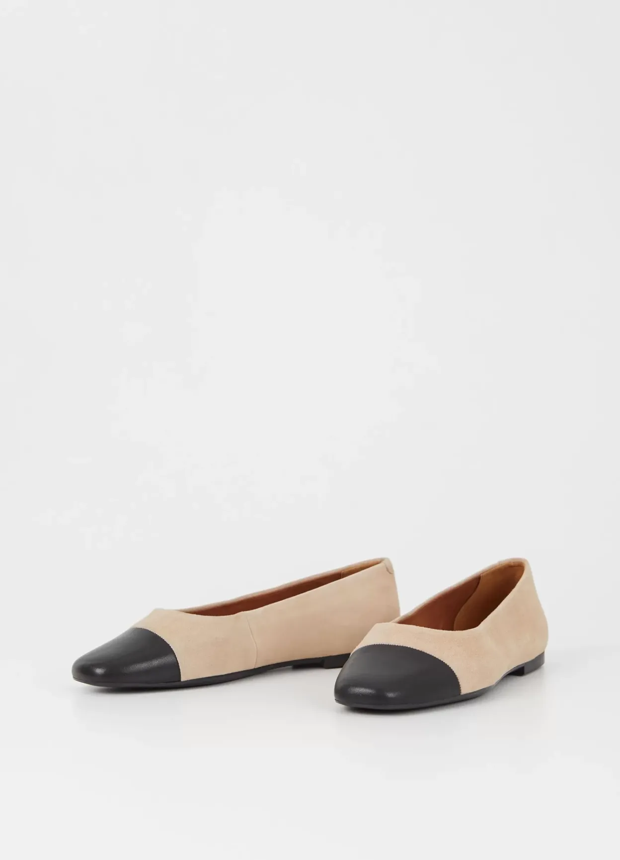 Jolin er stilrene ballerinas med et tidløst look. Modellen er i beige ruskind dekoreret med en tåhætte i sort læder og er med rund tå. Den slanke sål har en 11 mm lav hæl.
