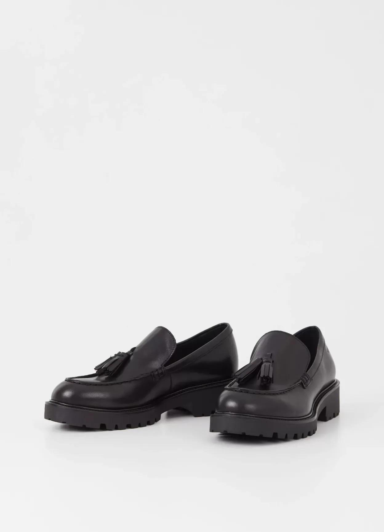 Kenova er chunky loafers i et klædeligt design. Overdelen er lavet i sort læder med dekorative kvaster og moc-toe. Modellen har en solid sål med en 40 mm hæl.