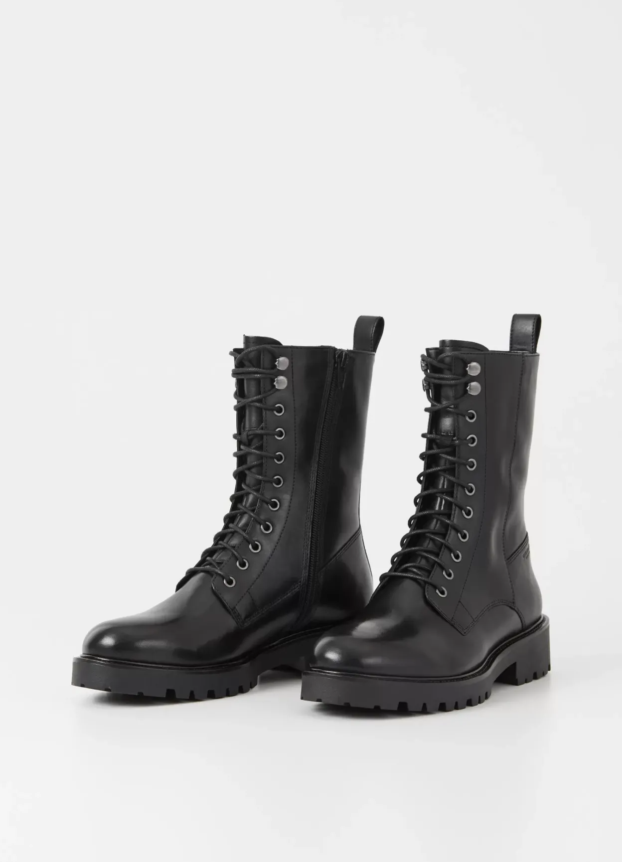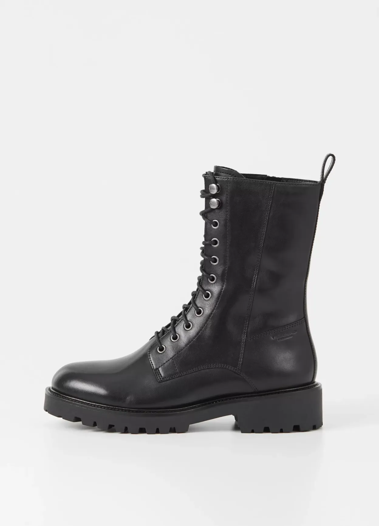 Kenova er varmforede utility-boots med et tidløst design Modellen er i sort skind med varmt for, lynlås og snøre fortil. Den kraftige ydersål har en grov hæl på 40 mm.
