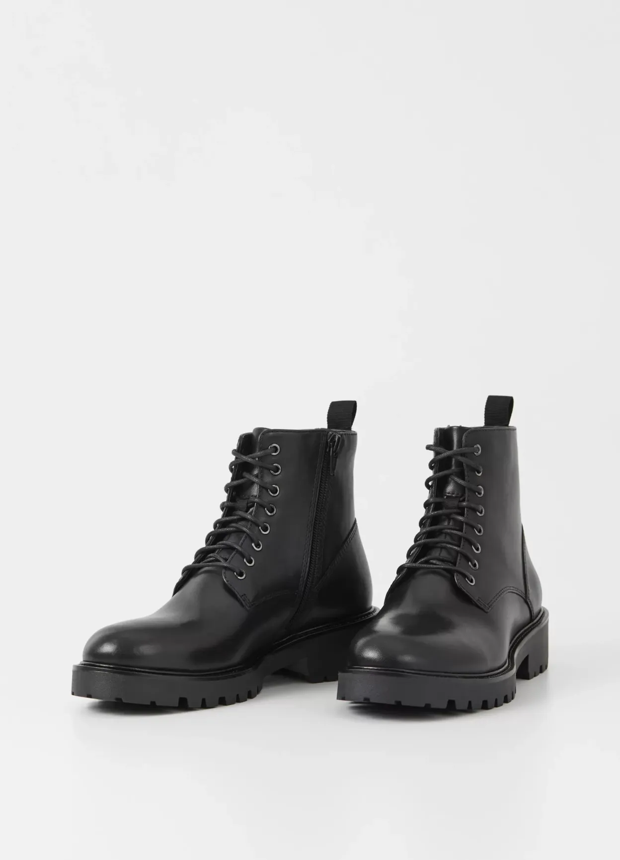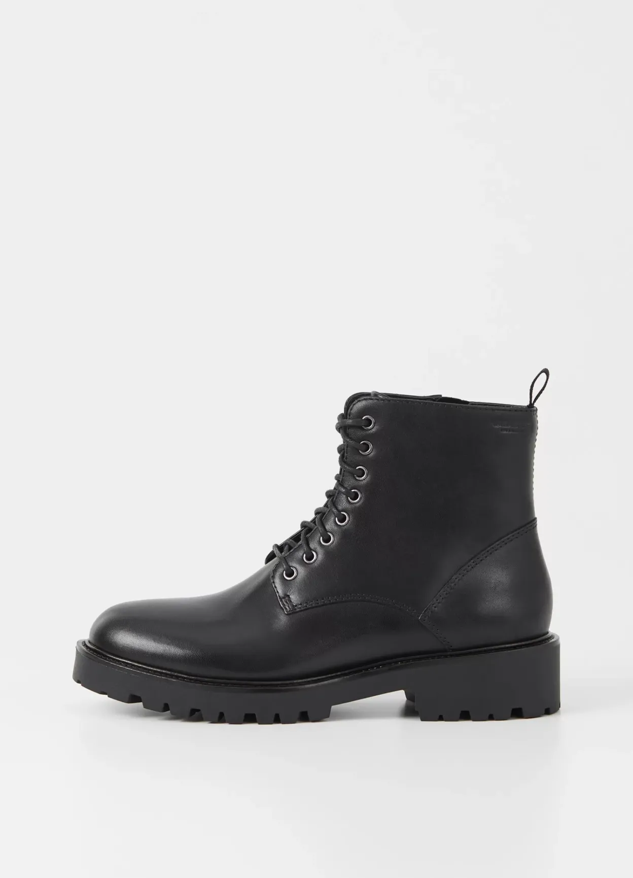 Kenova er en chunky version af de klassiske utility-boots. Modellen er i sort skind med rund tåform, lynlås og snøre fortil. Den kraftige ydersål har en robust hæl på 40 mm.