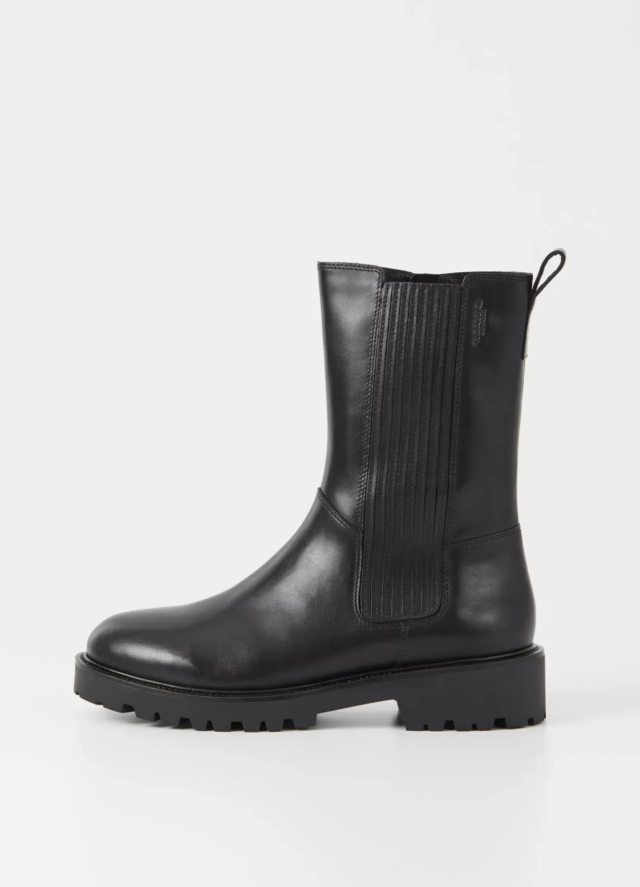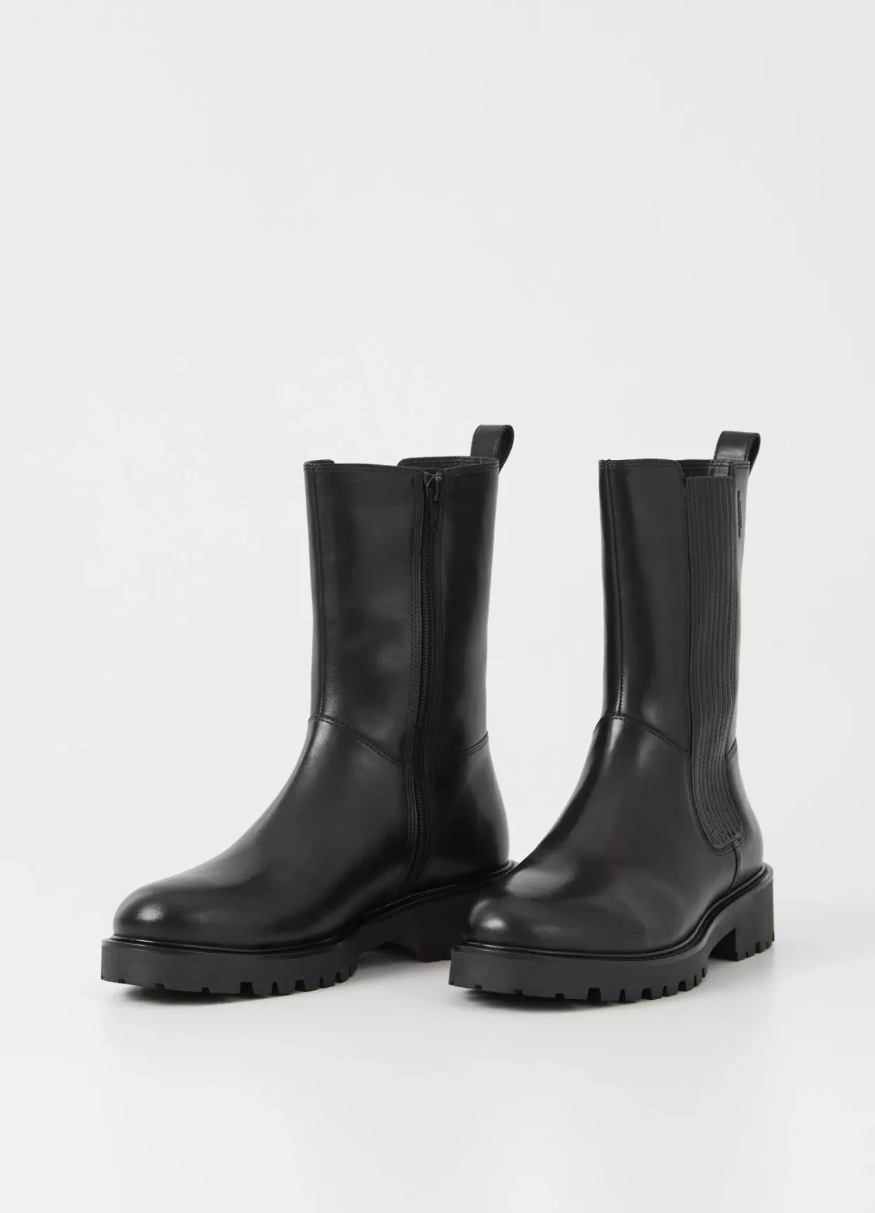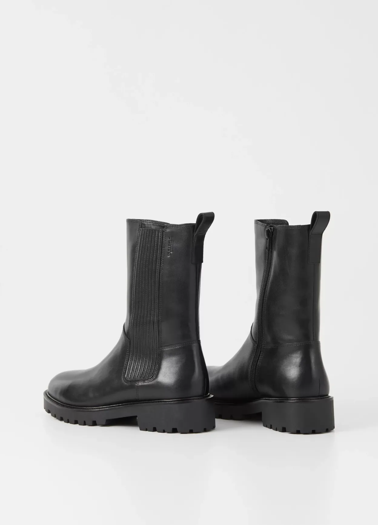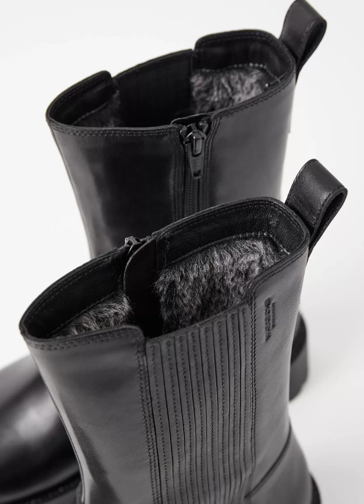 Kenova er varmforede chunky boots med et minimalistisk design. Modellen er i sort læder med varmt for, lynlås og rund tå. Den kraftige ydersål har en grov hæl på 40 mm.