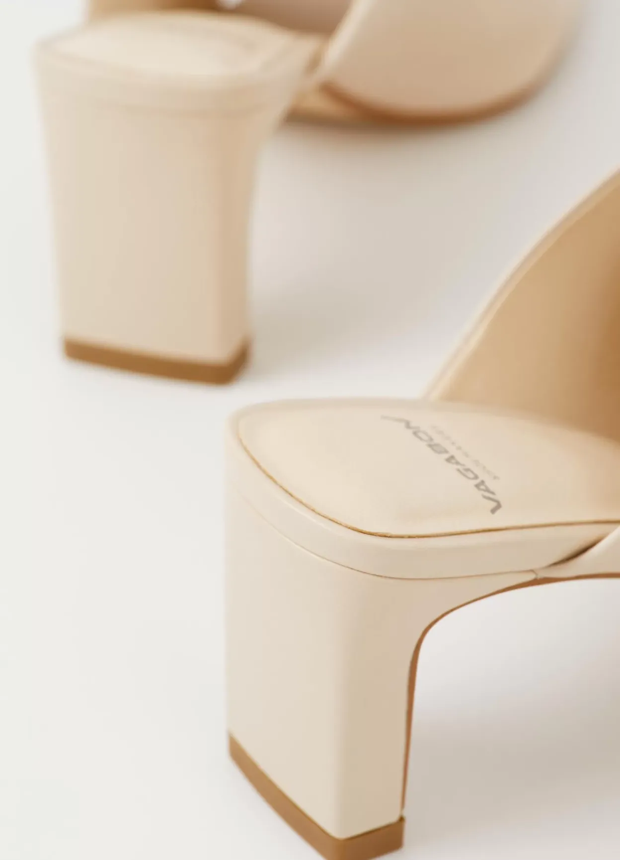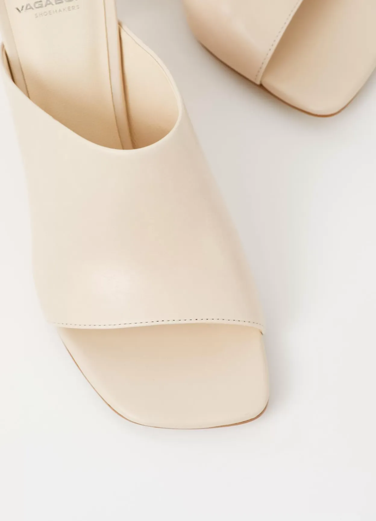 Luisa er højhælede mules med et minimalistisk design. Modellen er i offwhite læder med en lavt skåret overside, slip-in design og firkantet tå. De smalle blokhæle er på 76 mm.