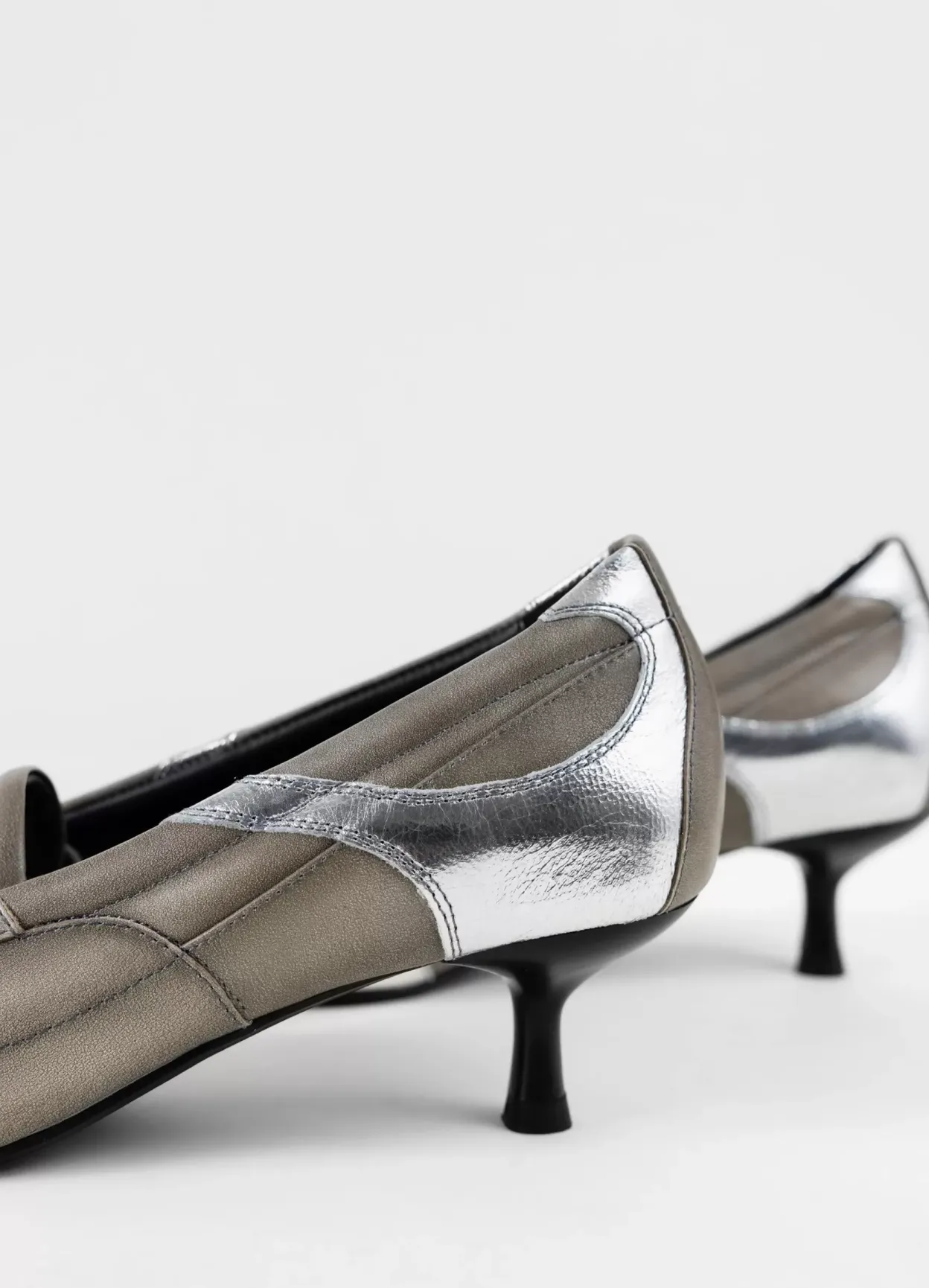 Lykke er sæsonens statement-pumps med et sportsinspireret design. Modellen er lavet i gråbeige læder med sølvfarvede paneler, kort snørebånd og spids tå. De smalle kitten-hæle er 47 mm. Detaljen: dekorative søm, læder/tekstilfor og indersål i læder.