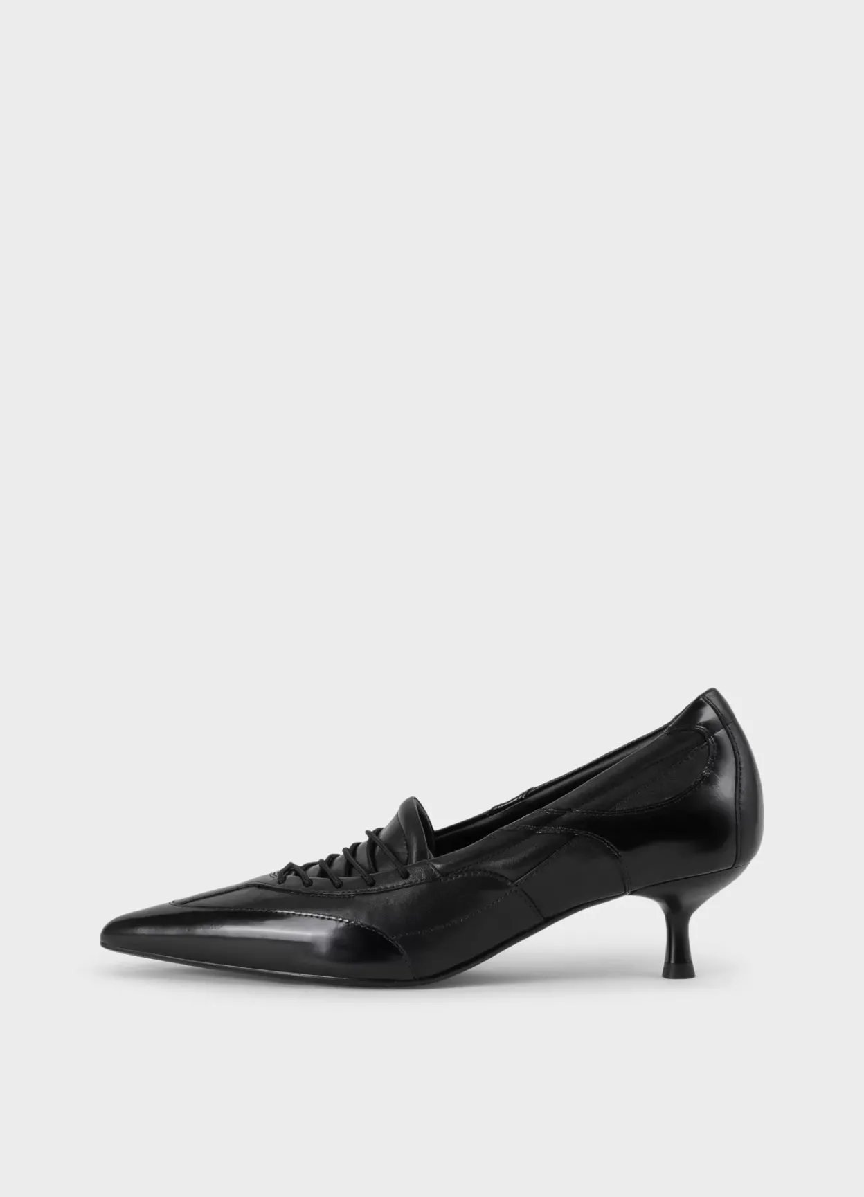 Lykke er sæsonens statement-pumps med et sportsinspireret design. Modellen er lavet i sort læder med paneler i laklæder, kort snørebånd og spids tå. De smalle kitten-hæle er 47 mm. Detaljen: dekorative søm, læder/tekstilfor og indersål i læder.