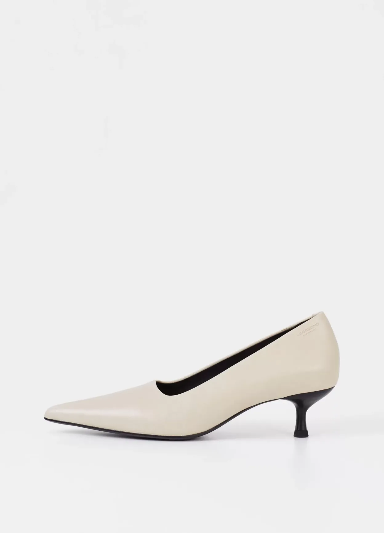 Lykke er minimalistiske pumps med en spids silhuet. Modellen er lavet i cremefarvet læder med spids tåform og smal kitten-hæl på 47 mm. Detaljen: læder/tekstilfor og indersål i læder.