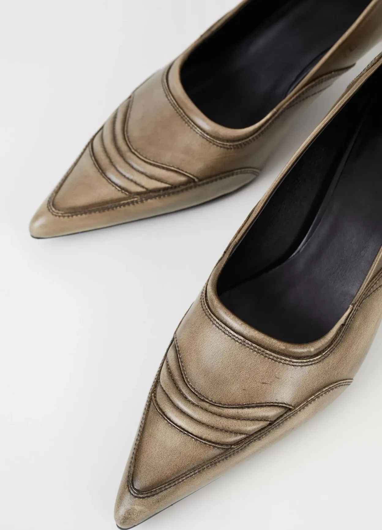 Lykke er stilrene pumps med mc-inspirerede detaljer. Modellen er lavet i gråbeige brush-off læder med spids tå, polstrede detaljer samt dekorative søm på overdelen. De smalle kitten hæle er 47 mm. Detaljen: læder/tekstilfor og indersål i læder.