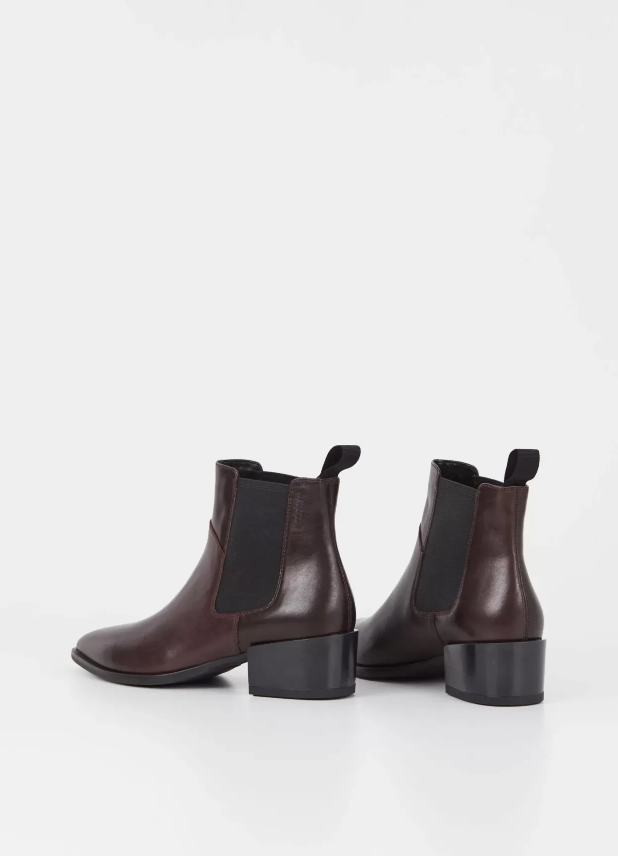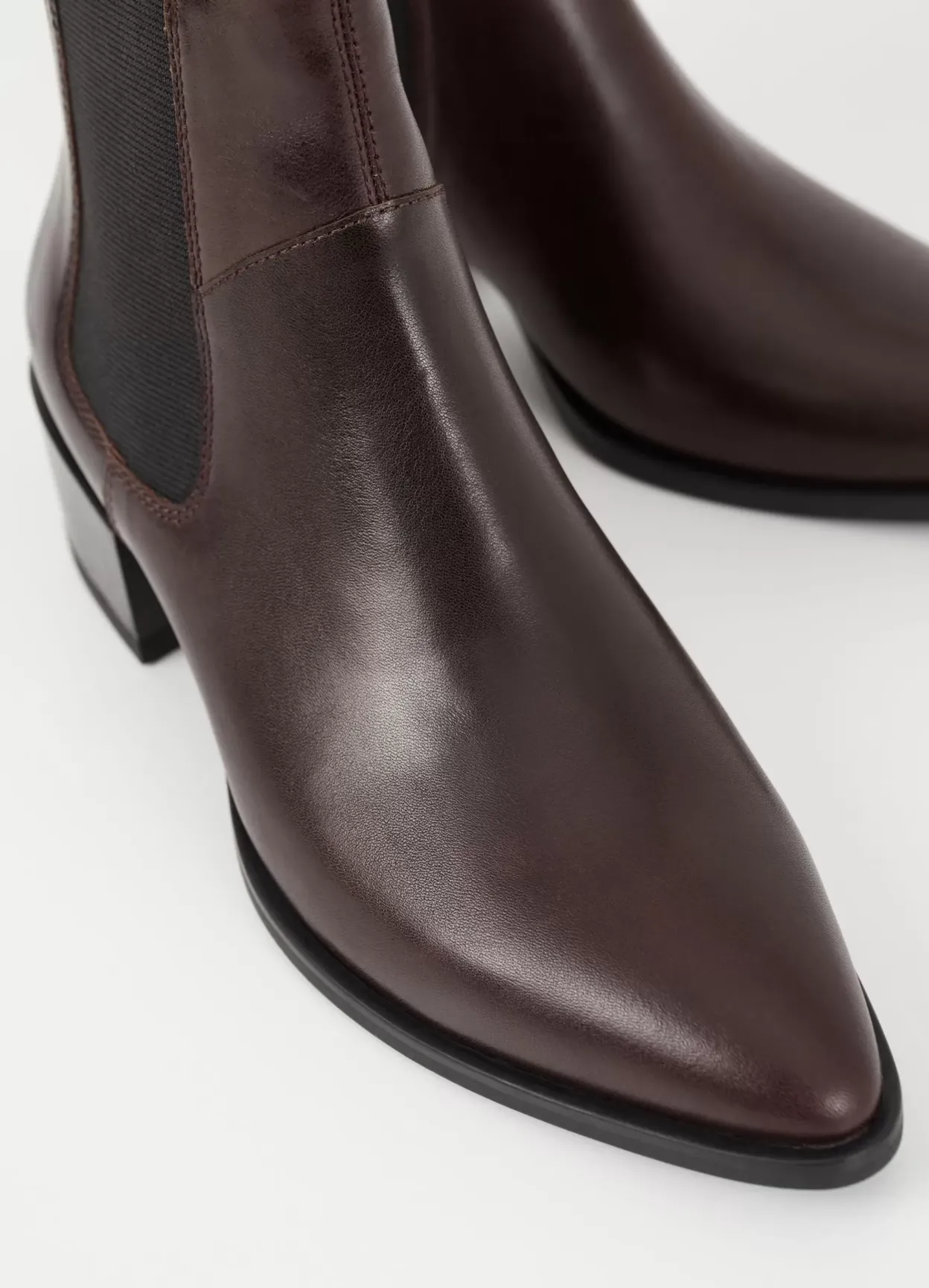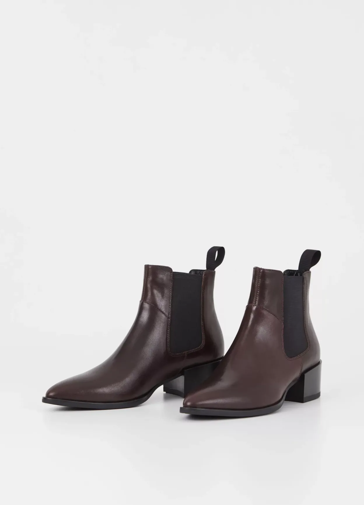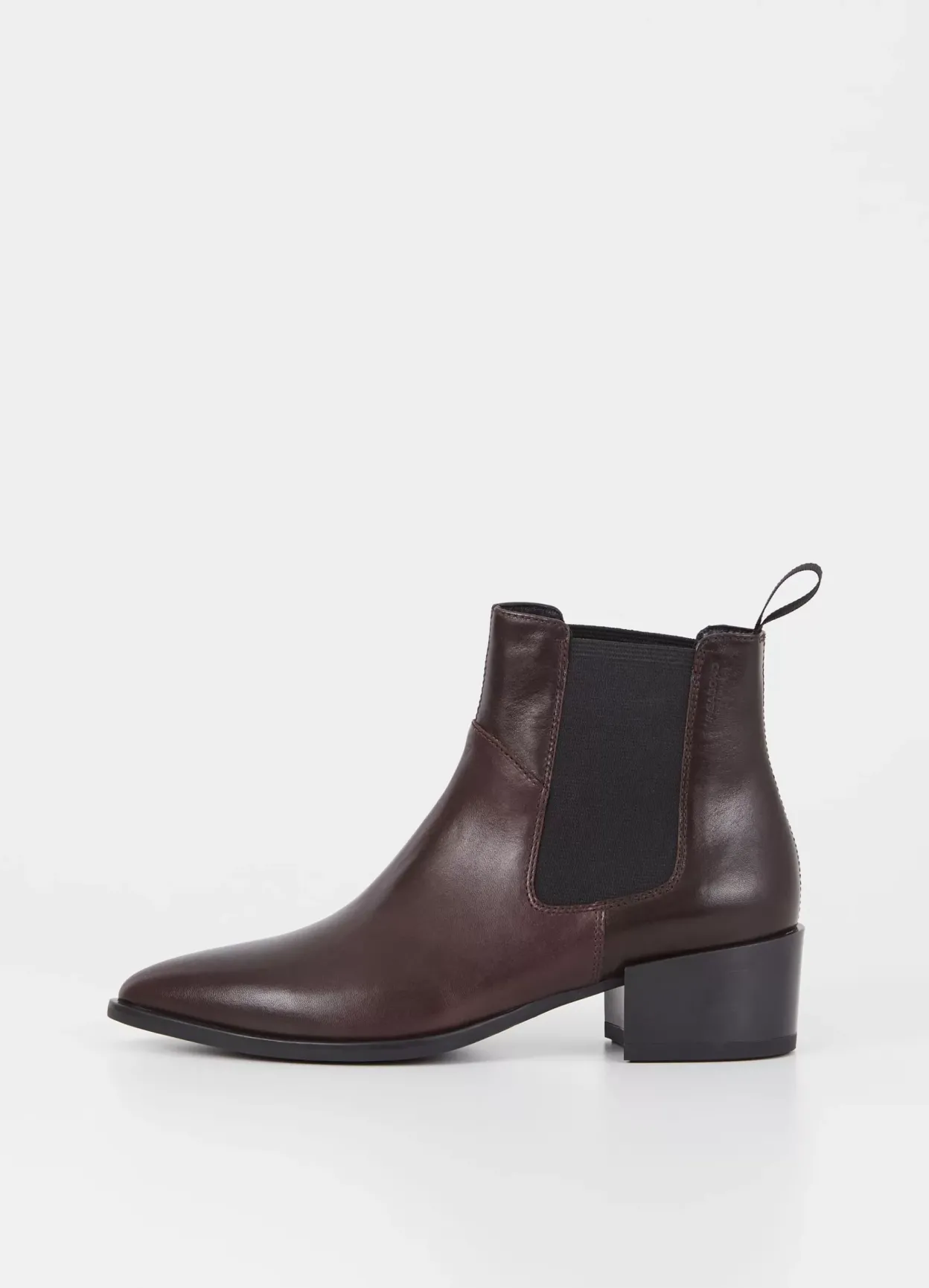Marja er western-inspirerede ankelstøvletter med et tidløst look. Modellen er lavet i mørkebrunt læder med elastiske sidepaneler, spids tå og dekorativ trækstrop bag. Hælen er 47 mm. Detaljen: pull-on design.