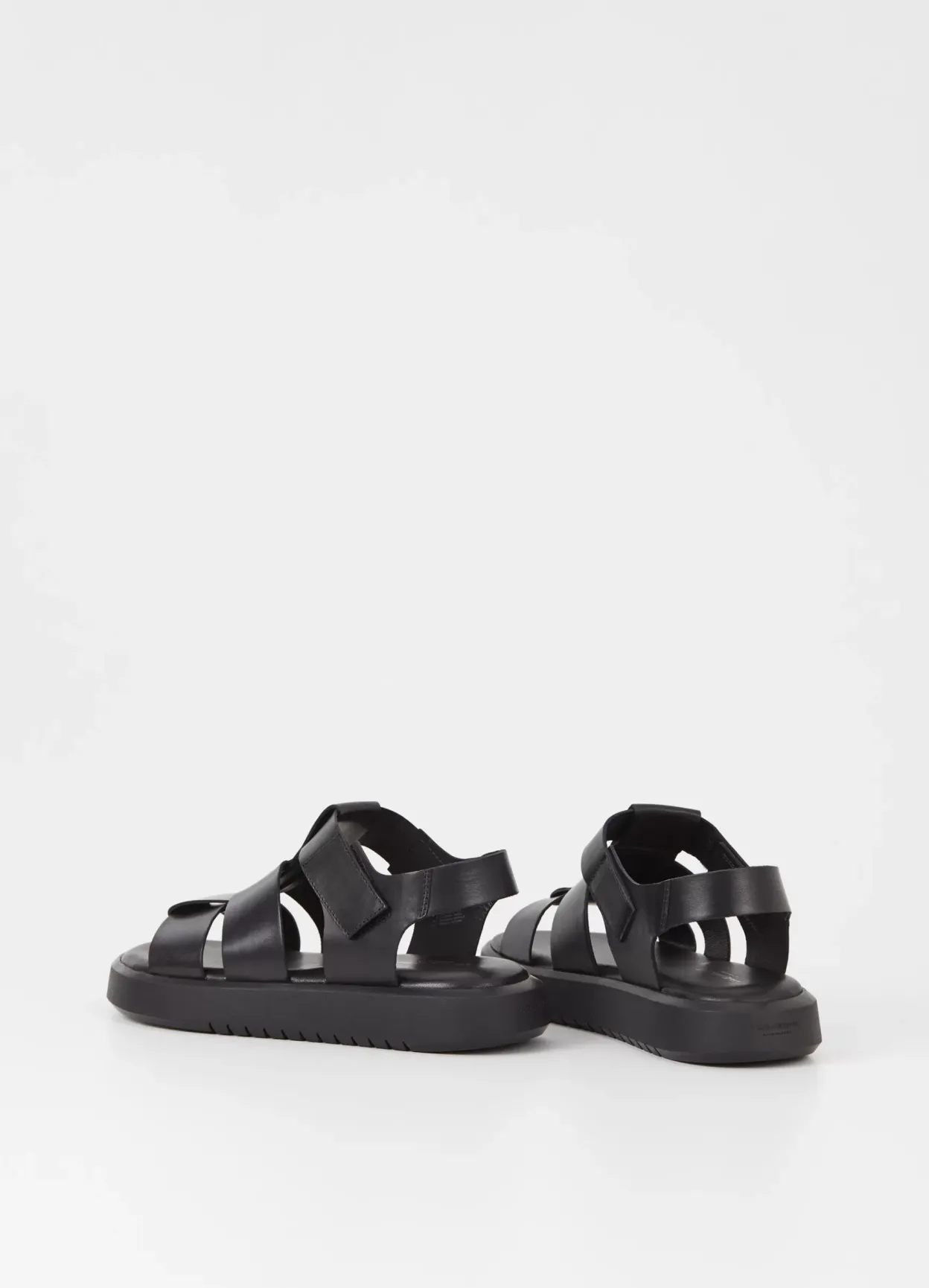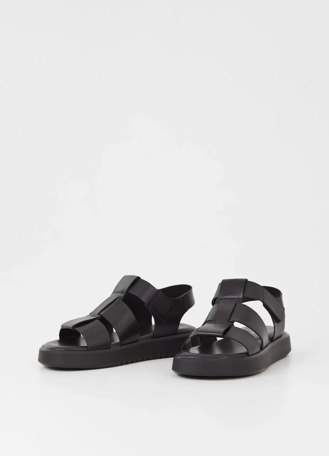 Nate er stilrene sandaler med en opdateret silhuet. Modellen er i sort skind med flettede remme over foden, hælrem med velcrolukning og en solid ydersål. Den runde sål er 40 mm høj.