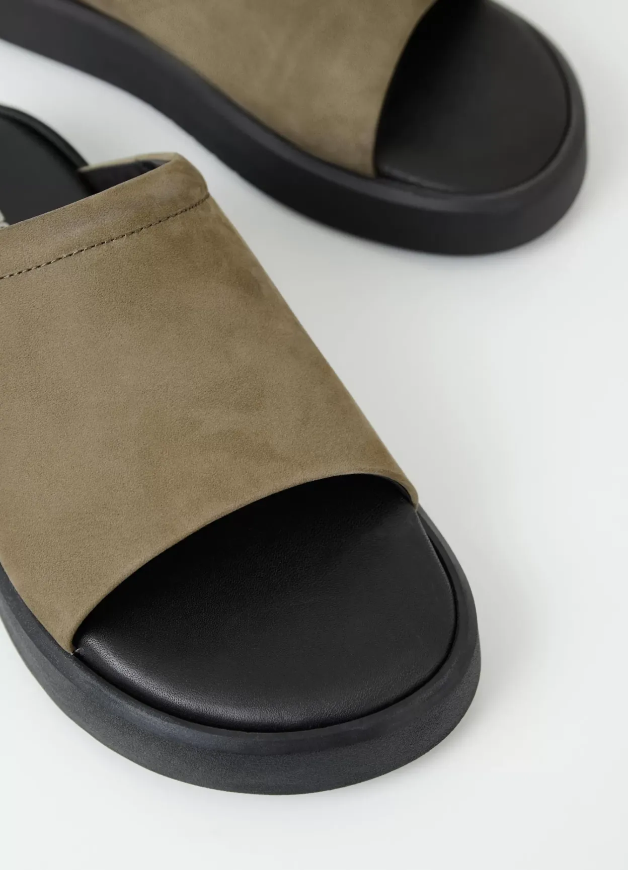 Nate er minimalistiske slip-in sandaler i et rent design. Modellen er i khakigrøn nubuck med en stilren overside, åben tå og en solid sål på 40 mm.