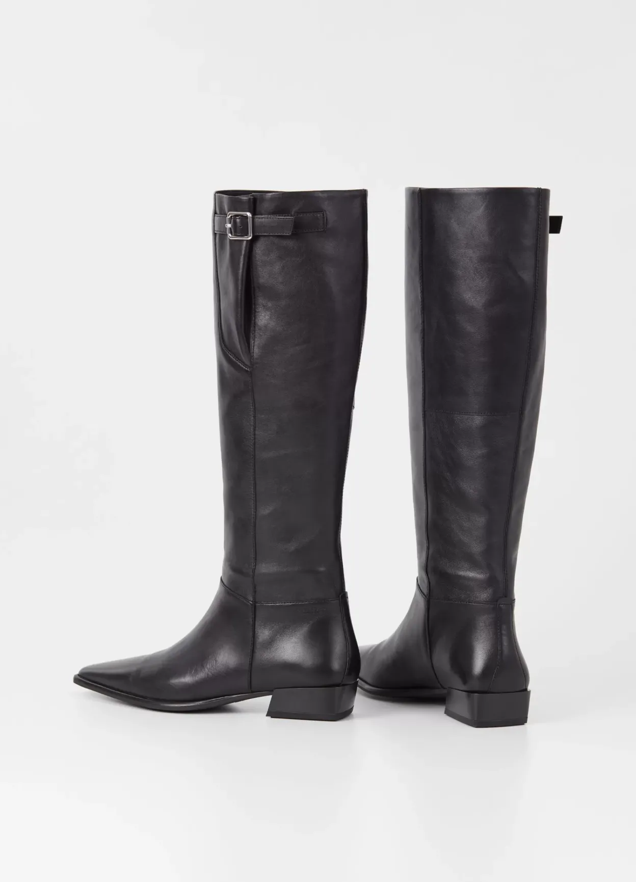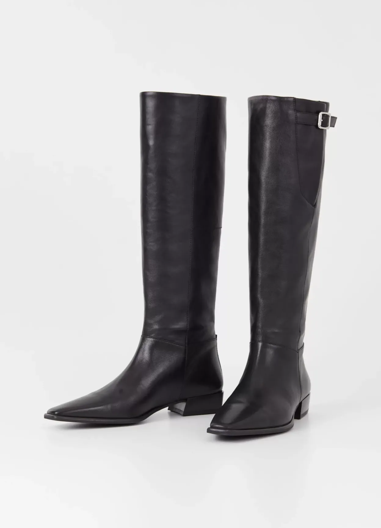 Nella er klædelige høje støvletter med et clean design. Modellen kommer i sort læder med spids tå, en dekorativ strop med spænde og pull-on skafte. Skrå blokhæl på 31 mm.